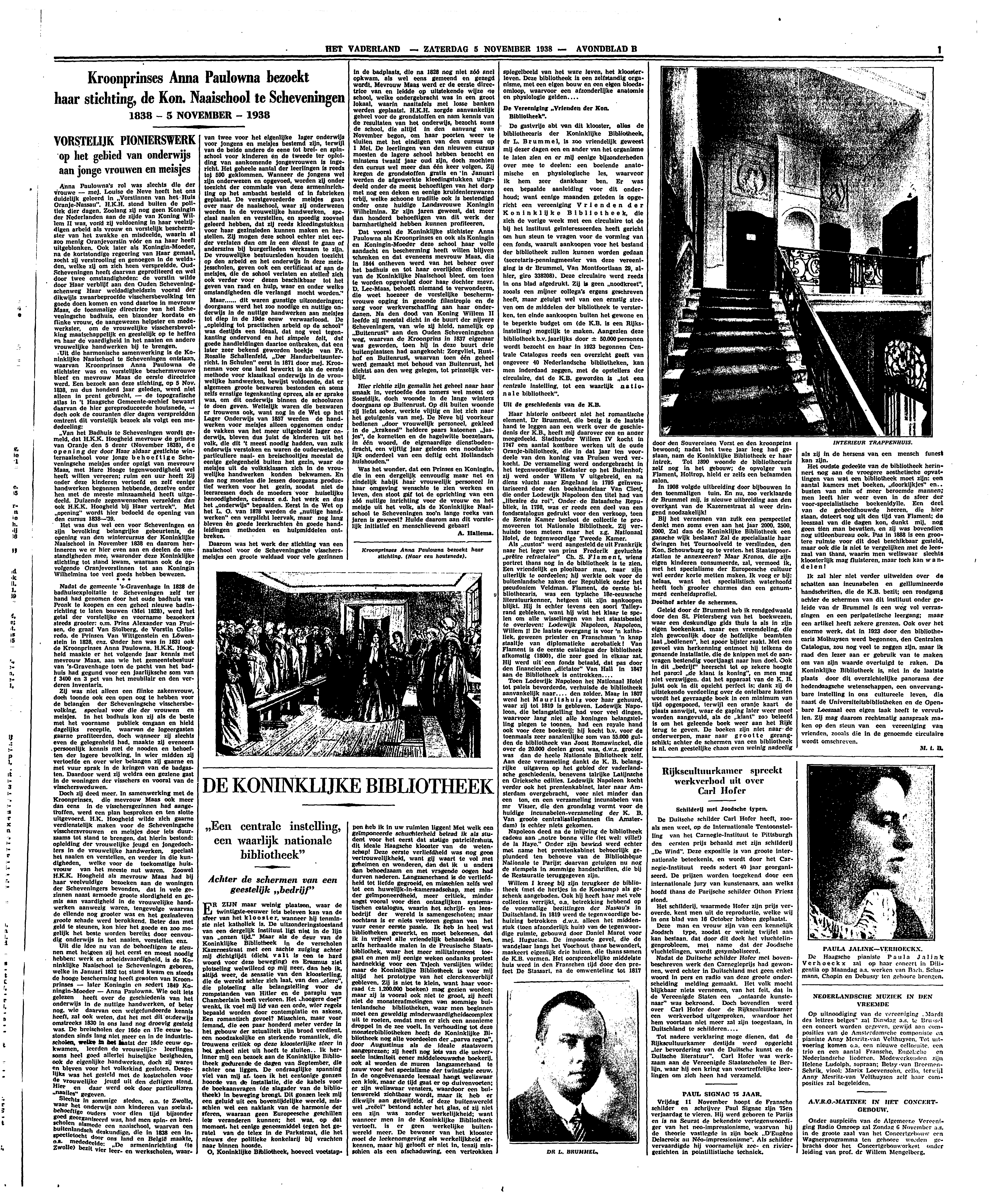 De gastvrije abt van dit klooster, alias de bibliothecaris der Koninklijke Bibliotheek, dr L. Brummel, is zoo vriendelijk geweest mij dezer dagen een en ander van het organisme te laten zien en er mij eenige bijzonderheden over mee te deelen: een boeiende anatomische en physiologische les, waarvoor ik hem zeer dankbaar ben. Er was een bepaalde aanleiding voor dit onderhoud; want eenige maanden geleden is opgericht een vereeniging Vrienden der Koninklijke Bibliotheek, die zich de vorige week met een circulaire tot de bij het instituut geïnteresseerden heeft gericht om hun steun te vragen voor de vorming van een fonds, waaruit aankoopen voor het bestand der bibliotheek zullen kunnen worden gedaan (secretaris-penningmeester van deze vereeniging is dr Brummel, Van Montfoortlaan 29, alhier, giro 338208). Deze circulaire werd reeds in ons blad afgedrukt. Zij is geen ‘noodkreet’, zooals een mijner collega's ergens geschreven heeft, maar getuigt wel van een ernstig streven om de middelen der bibliotheek te versterken, ten einde aankoopen buiten het gewone en te beperkte budget om (de K.B. is een Rijksinstelling) mogelijk te maken. Aangezien deze bibliotheek b.v. jaarlijks door ± 50.000 personen wordt bezocht en haar in 1923 begonnen Centrale Catalogus reeds een overzicht geeft van ongeveer 40 Nederlandsche bibliotheken, kan men inderdaad zeggen, met de opstellers der circulaire, dat de K.B. geworden is ‘tot een centrale instelling, tot een waarlijk nationale bibliotheek’.
