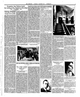 Haar historie ontbeert niet het romantische element. Dr Brummel, die bezig is de laatste hand te leggen aan een werk over de geschiedenis der K.B., heeft mij daarover een en ander meegedeeld. Stadhouder Willem IV kocht in 1747 een aantal kostbare werken uit de oude Oranje-bibliotheek, die in dat jaar ten voordeele van den koning van Pruisen werd verkocht. De verzameling werd ondergebracht in het tegenwoordige Kadaster op het Buitenhof; zij werd onder Willem V uitgebreid, en na diens vlucht naar Engeland in 1795 geïnventariseerd door den boekhandelaar Van Cleef, die onder Lodewijk Napoleon den titel had van ‘libraire du roi’. Onder de Bataafsche Republiek, in 1798, was er reeds een deel van een fondscatalogus gedrukt voor den verkoop, toen de Eerste Kamer besloot de collectie te promoveeren tot Nationale Bibliotheek. Zij verhuisde toen meteen naar het z.g. Nationaal Hotel, de tegenwoordige Tweede Kamer.