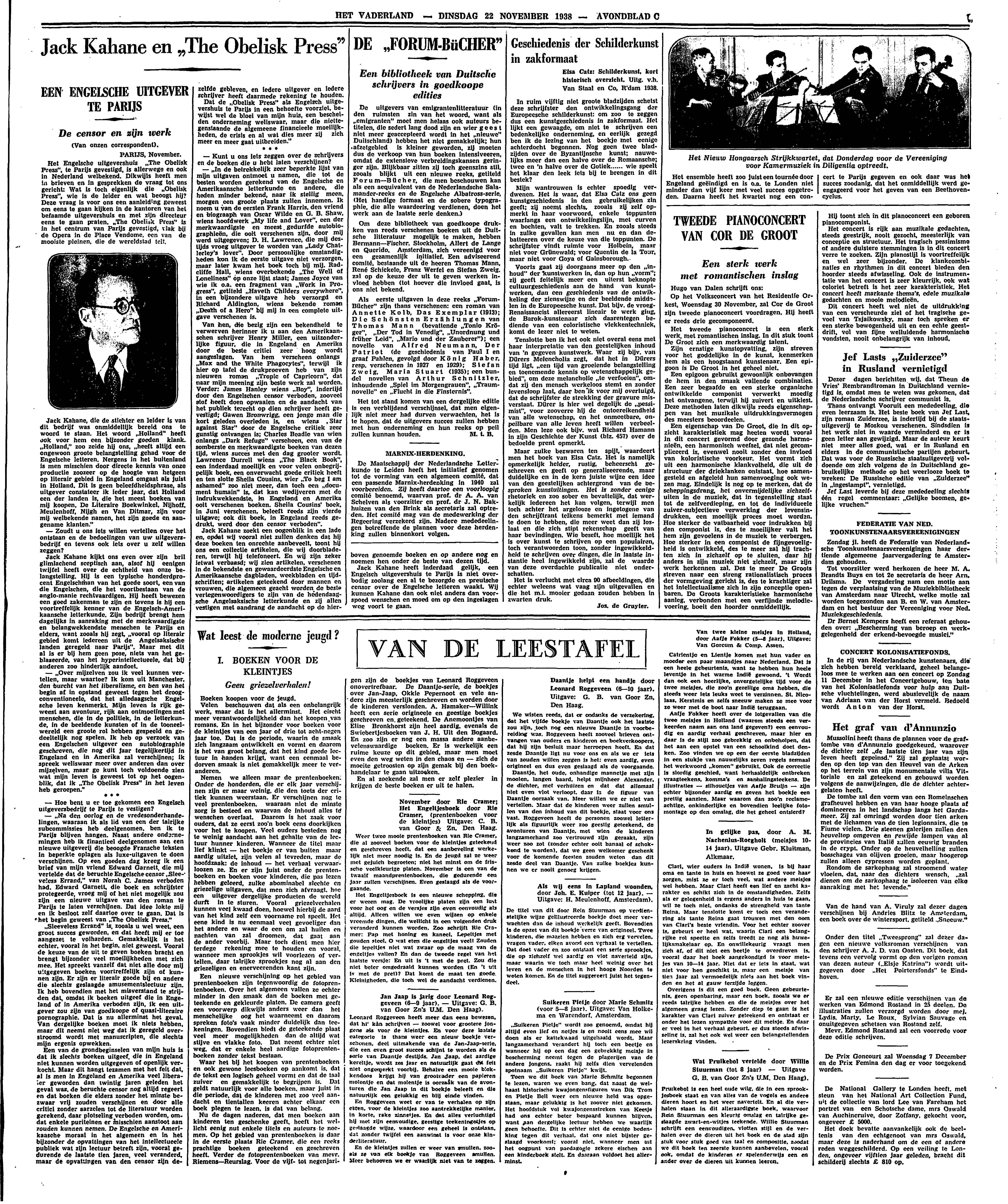 Om deze bibliotheek van goedkoope drukken van reeds verschenen boeken uit de Duitsche litteratuur mogelijk te maken, hebben Bermann - Fischer, Stockholm, Allert de Lange en Querido, Amsterdam, zich vereenigd voor een gezamenlijk initiatief. Een adviseerend comité, bestaande uit de heeren Thomas Mann, René Schickele, Franz Werfel en Stefan Zweig, zal op de keuze der uit te geven werken invloed hebben (tot hoever die invloed gaat, is ons niet bekend.