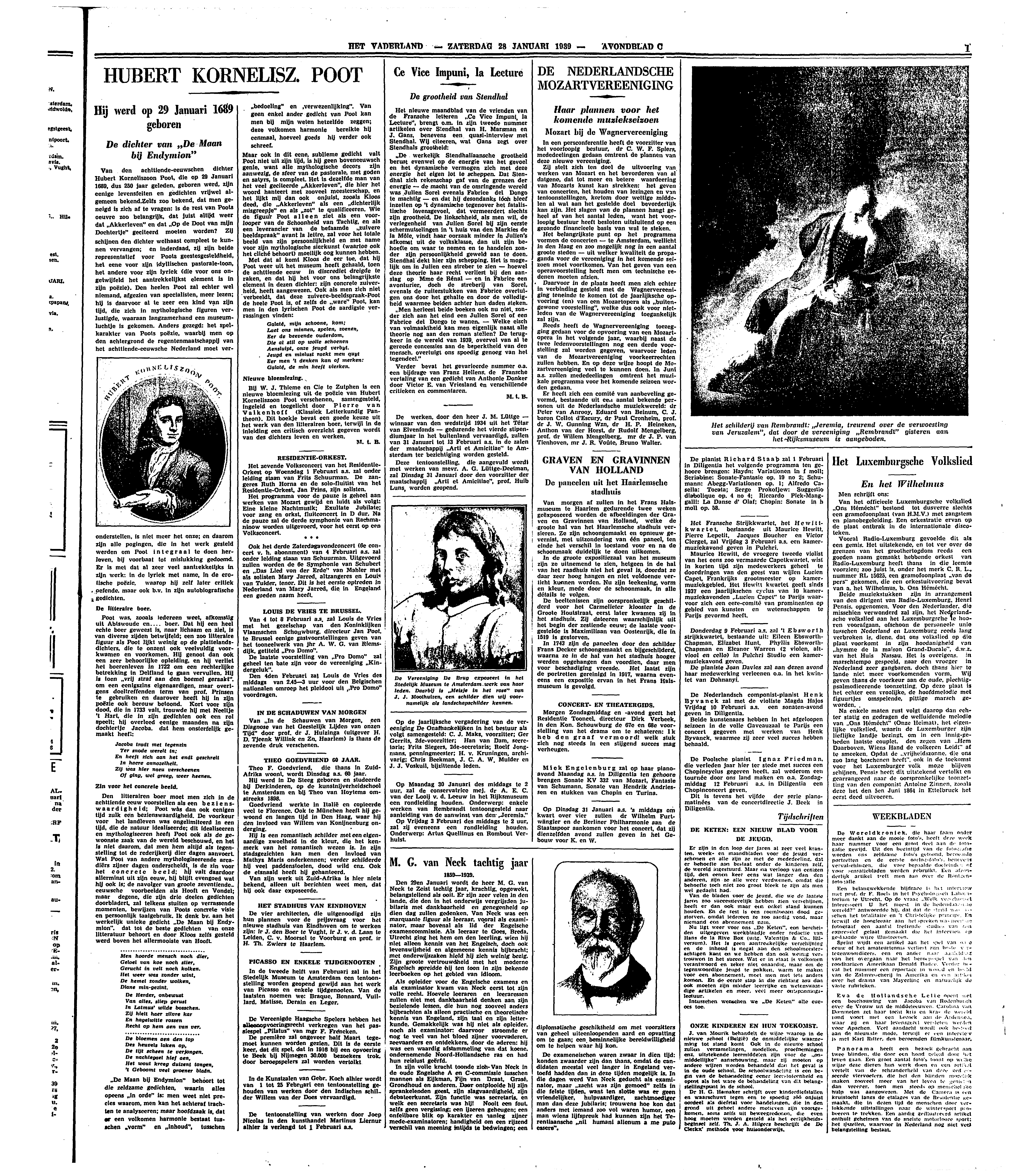 Van den achttiende-eeuwschen dichter Hubert Korneliszoon Poot, die op 29 Januari 1689, dus 250 jaar geleden, geboren werd, zijn eenige levensfeiten en gedichten vrijwel algemeen bekend. Zelfs zoo bekend, dat men geneigd is zich af te vragen: is de rest van Poots oeuvre zoo belangrijk, dat juist altijd weer dat ‘Akkerleven’ en dat ‘Op de Doot van mijn Dochtertje’ geciteerd moeten worden? Zij schijnen den dichter welhaast compleet te kunnen vervangen; en inderdaad, zij zijn beide representatief voor Poots geestesgesteldheid, het eene voor zijn idyllischen pastorale-toon, het andere voor zijn lyriek (die voor ons ongetwijfeld het aantrekkelijkst element is in zijn poëzie). Den heelen Poot zal echter wel niemand, afgezien van specialisten, meer lezen; hij is daarvoor al te zeer een kind van zijn tijd, die zich in mythologische figuren verlustigde, waaraan langzamerhand een museumluchtje is gekomen. Anders gezegd: het spelkarakter van Poots poëzie, waarbij men op den achtergrond de regentenmaatschappij van het achttiende-eeuwsche Nederland moet veronderstellen, is niet meer het onze; en daarom zijn alle pogingen, die in het werk gesteld werden om Poot integraal te doen herleven, bij voorbaat tot mislukking gedoemd. Er is met dat al zeer veel aantrekkelijks in zijn werk: in de lyriek met name, in de erotische poëzie, waarop hij zelf later critiek oefende, maar ook b.v. in zijn autobiografische gedichten.