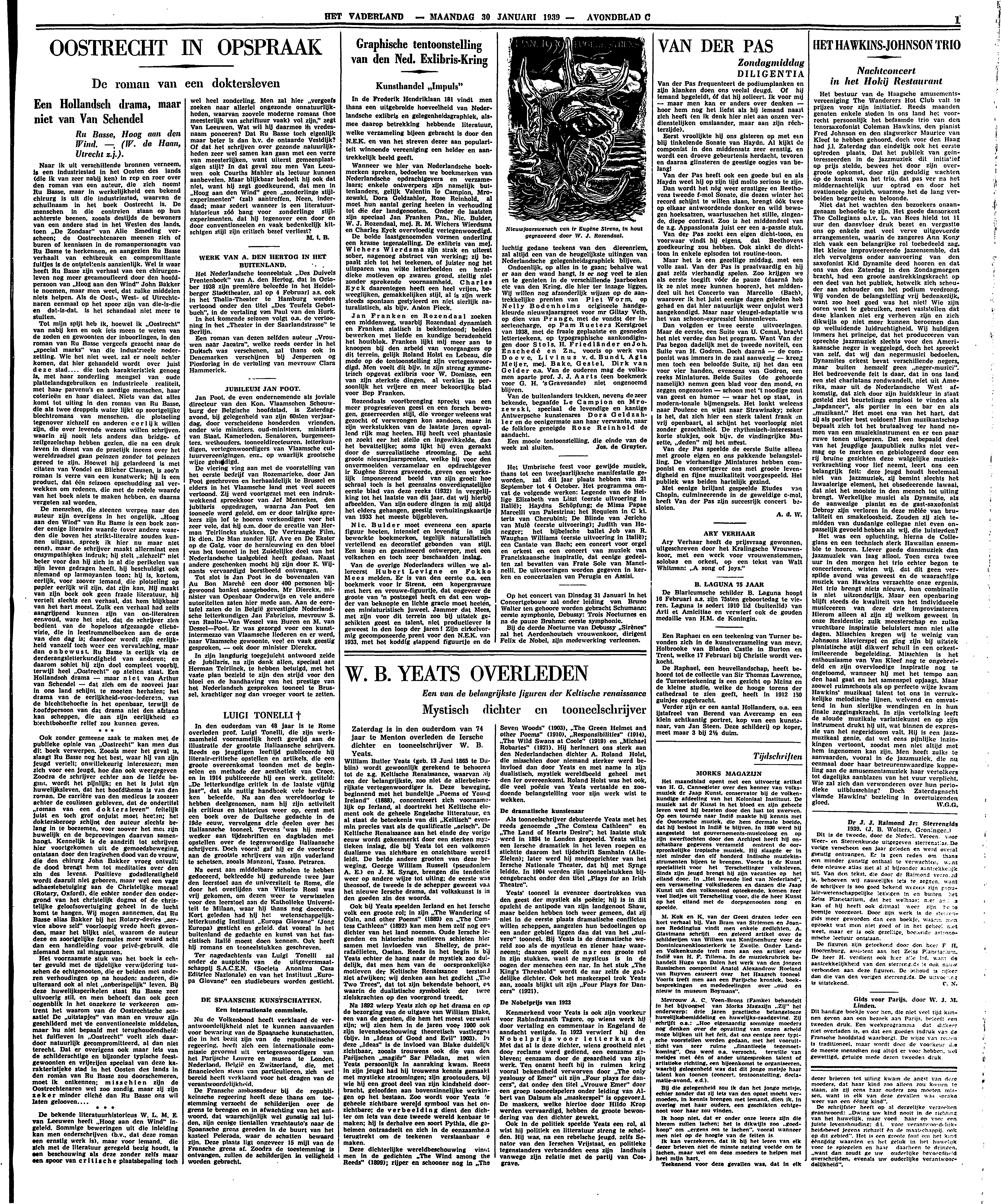 Zaterdag is in den ouderdom van 74 jaar te Menton overleden de Iersche dichter en tooneelschrijver W.B. Yeats.