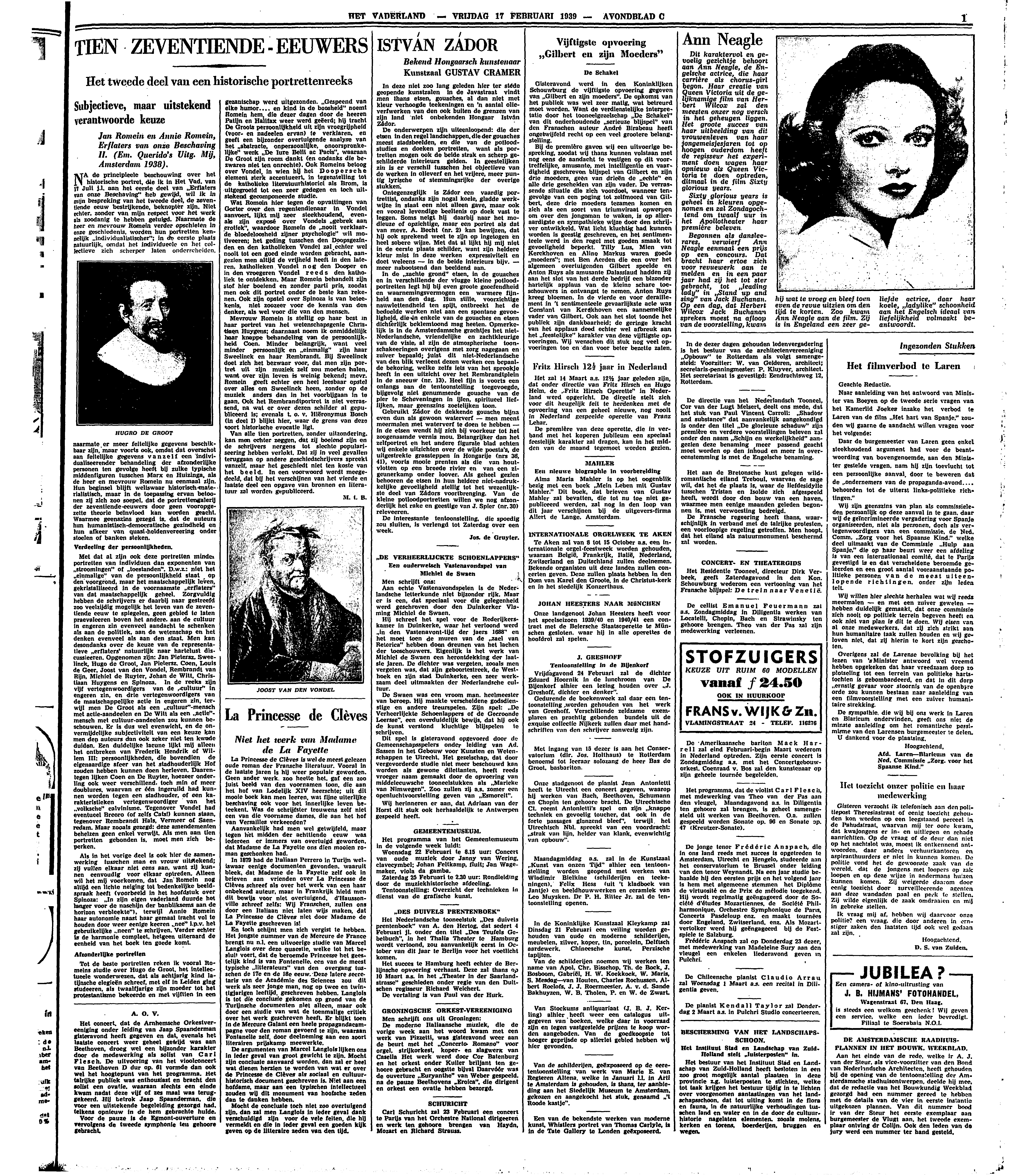 Tot de beste portretten reken ik vooral Romeins studie over Hugo de Groot, het intellectueele wonderwezen, dat als achtjarig kind latijnsche elegieën schreef, met elf in Leiden ging studeeren, als twaalfjarige zijn moeder tot het protestantisme bekeerde en met vijftien in een gezantschap werd uitgezonden. ‘Gespeend van elke humor.... en kind in de boosheid’ noemt Romein hem, die dezer dagen door de heeren Patijn en Halifax weer werd geëerd; hij tracht De Groots persoonlijkheid uit zijn vroegrijpheid (voor- en nadeelen ervan) te verklaren, en geeft een bijzonder overtuigende analyse van het ‘abstracte, onpersoonlijke, onoorspronkelijke’ werk ‘De Iure Belli ac Pacis’, waaraan De Groot zijn roem dankt (en ondanks die bezwaren niet ten onrechte). Ook Romeins betoog over Vondel, in wien hij het Doopersche element sterk accentueert, in tegenstelling tot de katholieke literatuurhistorici als Brom, is uitgegroeid tot een zeer gedegen en toch uitstekend gecomponeerde studie.