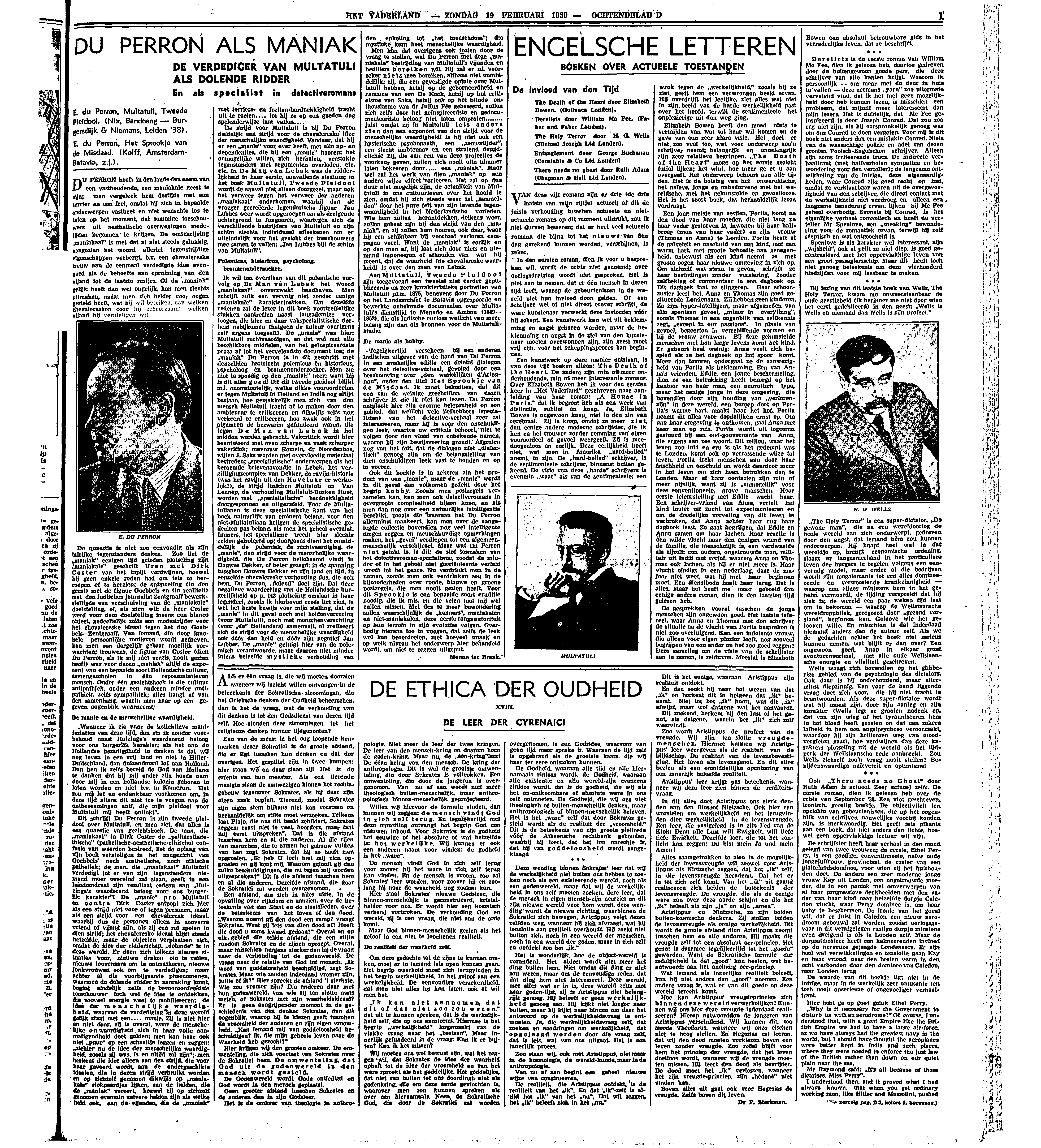 Men kan dat overigens ook inzien door de vraag te stellen, wat Du Perron met deze ‘maniakale’ bestrijding van Multatuli's vijanden er bedillers bereiken wil. Hij zal er nl. voorzeker niets mee bereiken, althans niet onmiddellijk; zij, die een gevestigde opinie over Multatuli hebben, hetzij op de geborneerdheid en rancune van een De Kock, hetzij op het criticisme van Saks, hetzij ook op hét blinde enthousiasme van dr Julius Pée gebaseerd, zullen zich zelfs door het geïnspireerdste en gedocumenteerdste betoog niet laten ompraten......... juist omdat zij in Multatuli iets anders zien dan een exponent van den strijd voor de menschelijke waardigheid! Is hij niet ook een hysterische psychopaath, een ‘zenuwlijder’, een slecht ambtenaar en een stralend deugdcliché? Zij, die aan een van deze projecties de voorkeur geven, zullen zich nooit ofte nimmer laten bekeeren door..... een ‘maniak’. Maar wel zal het werk van dien ‘maniak’ op een andere wijze effect sorteeren. Het zal op den duur niet mogelijk zijn, de actualiteit van Multatuli in ons cultuurleven over het hoofd te zien, omdat hij zich steeds weer zal ‘aanmelden’ door het pure feit van zijn levende tegenwoordigheid in het Nederlandsche verleden. Wie hem zullen herontdekken, telkens weer, zullen gebaat zijn bij den strijd van den ‘maniak’, en zij zullen hem hooren, ook daar, waar hij een schijnbaar bij voorbaat verloren campagne voert. Want de ‘maniak’ is eerlijk en op den man af, hij laat zich door niets en niemand imponeeren of afhouden van wat hij meent, dat de waarheid (de chevalereske waarheid) is over den man van Lebak.