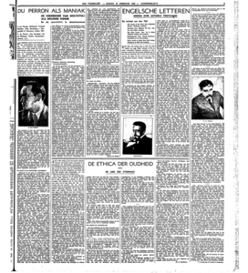 De quaestie is niet zoo eenvoudig als zijn talrijke tegenstanders denken. Zoo liet de ‘maniak’ eenigen tijd geleden plotseling zijn ‘maniakale’ geschrift Uren met Dirk Coster van het tapijt verdwijnen, hoewel hij geen enkele reden had om iets te herroepen of te herzien; de ontmoeting (in den geest) met de figuur Goebbels en (in realiteit) met den Indischen journalist Zentgraaff bewerkstelligde een verschuiving van de ‘maniakale’ doelstelling, of, als men wil: de heer Coster werd voor deze doelstelling ineens een blanco object, gedeeltelijk zelfs een medestrijder voor het chevalereske ideaal tegen het duo Goebbels - Zentgraaff. Van iemand, die door ignobele persoonlijke motieven wordt gedreven, kan men een dergelijk gebaar moeilijk verwachten; trouwens, de figuur van Coster (dien Du Perron, als ik mij niet vergis, nooit gezien heeft) was voor dezen ‘maniak’ altijd de exponent van een bepaalde soort Hollandsche cultuur, samengeschoten in één representatieven mensch. Onder één gezichtshoek is die cultuur antipathiek, onder een anderen minder antipathiek, zelfs sympathiek; alles hangt af van den samenhang, waarin men haar op een gegeven oogenblik waarneemt.
