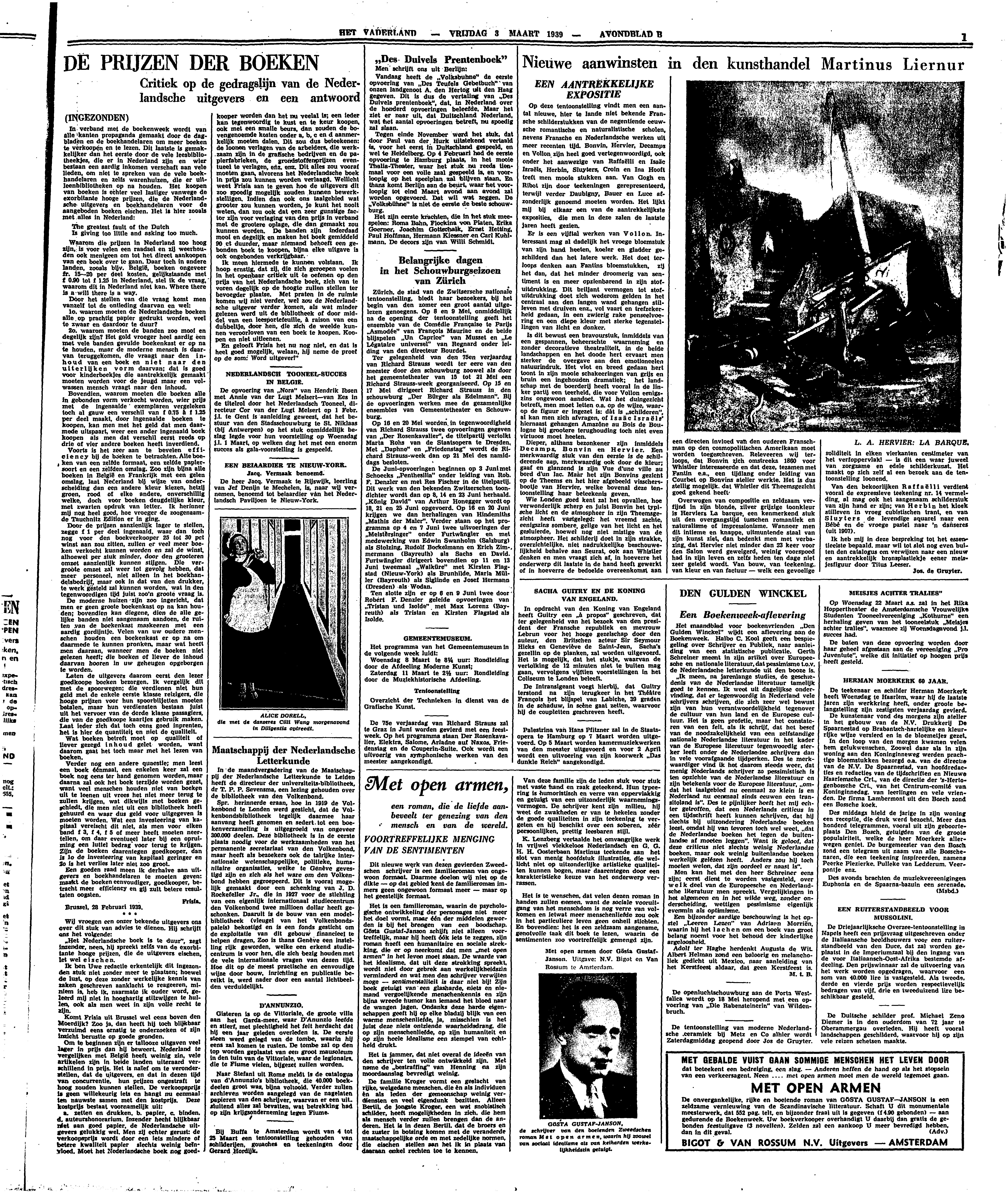 Het maandblad voor boekenvrienden ‘Den Gulden Winckel’ wijdt een aflevering aan de Boekenweek. Halbo C. Kool geeft een bespiegeling over Schrijver en Publiek, naar aanleiding van een statistische publicatie. Gerth Schreiner meent in zijn artikel over Europeesche en nationale literatuur, dat pessimisme t.o.v. de Nederlandsche letterkunde uit den booze is.
