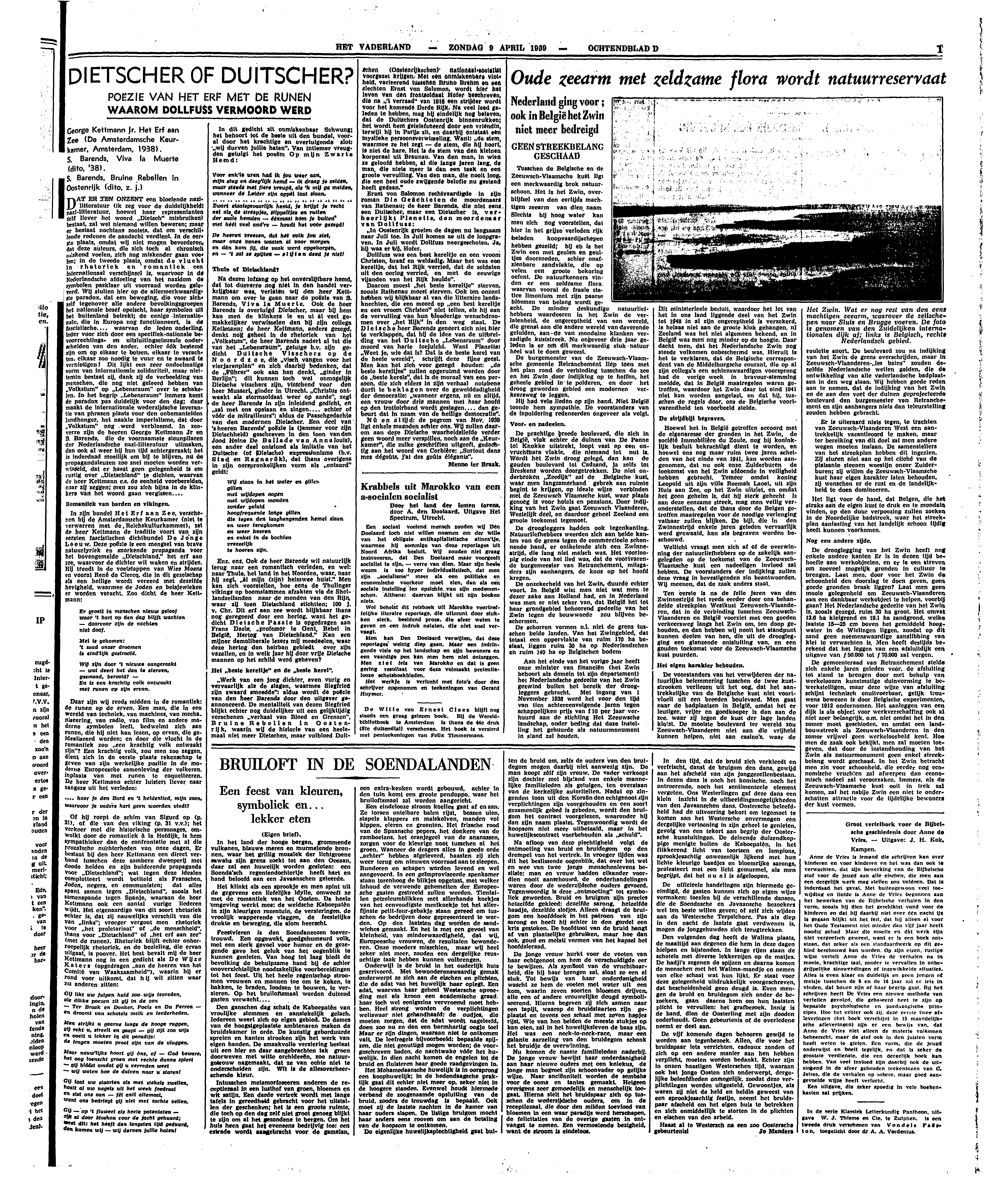 ‘Werk van een jong dichter, even vurig en vervaarlijk als de slagen, waarmee Siegfried zijn zwaard smeedde’: aldus wordt de poëzie van den heer Barends door den uitgever geannonceerd. De mentaliteit van dezen Siegfried blijkt echter nog duidelijker uit een gelijktijdig verschenen ‘verhaal van Bloed en Grenzen’, Bruine Rebellen in Oostenrijk, waarin wij de historie van een heelemaal niet meer Dietschen, maar volbloed Duitschen (Oostenrijkschen) nationaal-socialist voorgezet krijgen. Met een onmiskenbare vlotheid, varleerend tusschen Bruno Brehm en een slechten Ernst von Salomon, wordt hier het leven van den frontsoldaat Hofer beschreven, die na ‘'t verraad’ van 1917 een strijdef wordt voor het komende Derde Rijk. Na veel leed geleden te hebben, mag hij eindelijk nog beleven, dat de Duitschers Oostenrijk binnenrukken; het wordt hem getelefoneerd door een vriendin, terwijl hij in Parijs zit, en daarbij ontstaat een mystieke persoonsverwisseling. Want: ‘de stem, waarmee ze het zegt - de stem, die hij hoort, is niet de hare. Het is de stem van den kleinen korporaal uit Braunau. Van den man, in wien ze geloofd hebben, al die lange jaren lang, de man, die niets meer is dan een taak en een groote vervulling. Van den man, die nooit loog, die een heel oude zwijgende belofte nu gestand heeft gedaan.’