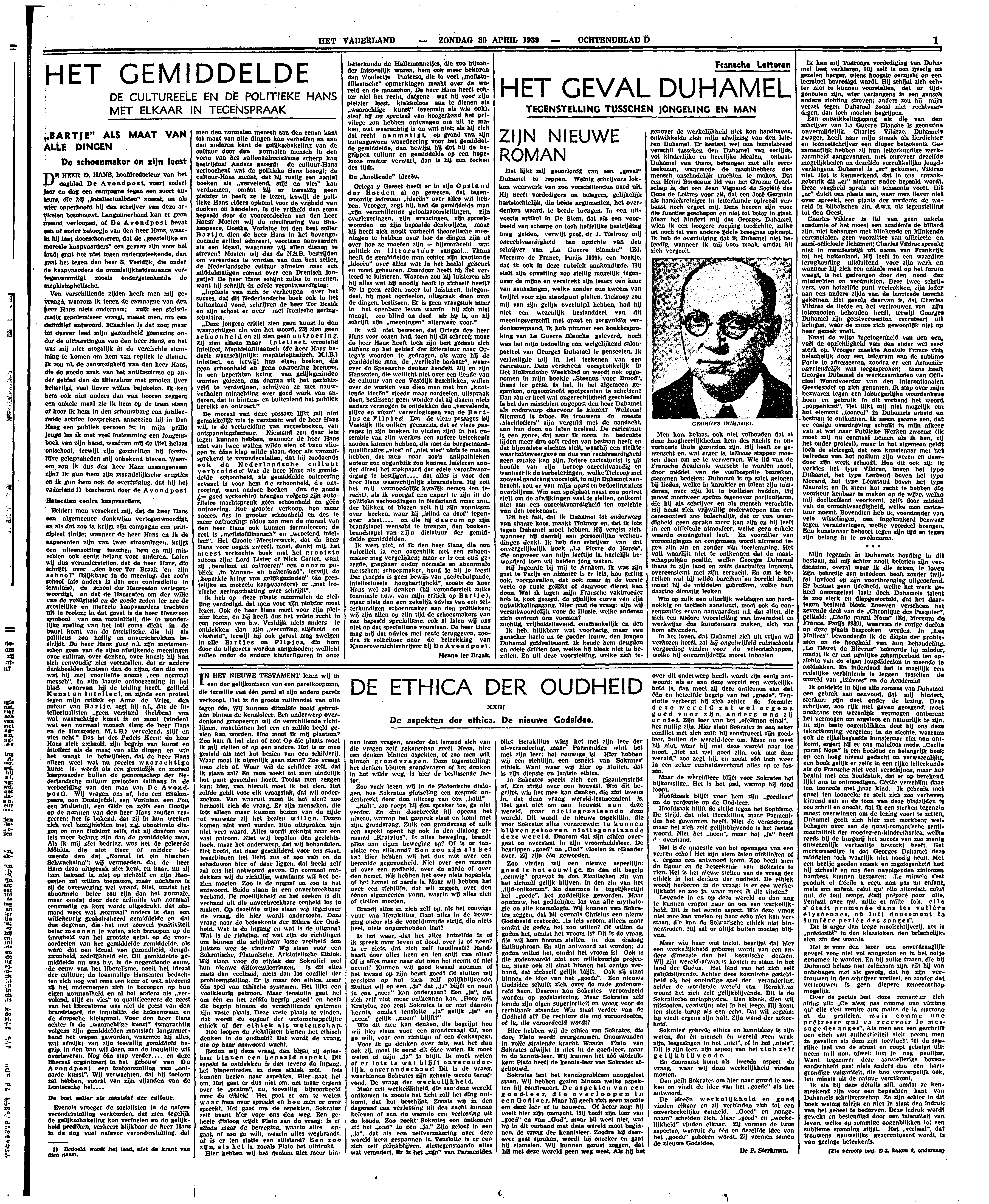 Van verschillende zijden heeft men mij gevraagd, waarom ik tegen de campagne van den heer Hans niets ondernam; zulk een stelselmatig gepolemiseer vraagt, meent men, om een definitief antwoord. Misschien is dat zoo; maar tot dusver leed mijn gezondheid geenszins onder de uitbarstingen van den heer Hans, en het was mij niet mogelijk in de vereischte stemming te komen om hem van repliek te dienen. Ik zou nl. de aanwezigheid van den heer Hans, die de goede zaak van het antifascisme op ander gebled dan de litteratuur met grooten ijver behartigt, veel liever willen bejubelen. Ik ken hem ook niet anders dan van hooren zeggen; een enkele maal zie ik hem op de tram staan of hoor ik hem in den schouwburg een jubileerende actrice toespreken, aangezien hij in Den Haag een publiek persoon is; in mijn prille jeugd las ik met veel instemming een jongensboek van zijn hand, waarvan mij de titel helaas ontschoot, terwijl zijn geschriften bij feestelijke gelegenheden mij onbekend bleven. Waarom zou ik dus den heer Hans onaangenaam zijn? Ik gun hem zijn maandelijksche erupties en ik gun hem ook de overtuiging, dat hij het vaderland1) beschermt door de Avondpost