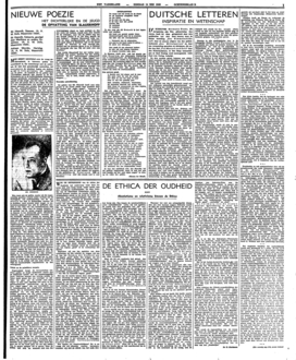 Men moet ook de poëzie, zooals wij die tegenwoordig opvatten (vooral onder invloed van de Tachtigers), wel onderscheiden van de gewoonte om zich in dichterlijke vormen uit te drukken, want evenals ieder jeugd- en puberteitsverschijnsel kan ook de poëtische aandrift in den loop van een menschenleven zich stabiliseeren; maar voor de meeste dichters is de periode van de eerste aandrift beslissend, en daarom is het dichterlijk genie (Rimbaud) volstrekt geen ondenkbaarheid, evenmin als het muzikale (Mozart); poëzie en muziek zijn weliswaar van geheel verschillende geaardheid, maar zij hebben beide het musische element gemeen, en daarmee de mogelijkheid van een ongeëvenaarde openbaring zonder jarenlange ondervinding van menschen en dingen (die de romanschrijver b.v. noodig heeft, al was het alleen maar om te weten, wat er in de wereld te koop is). Een dichter kan zichzelf in de jeugd uitputten en toch een complete verschijning zijn geweest, een meteoor; voor het definitieve oordeel over den prozaïst, den essayist, den denker is de langzame ontwikkeling van veel grooter beteekenis. Daarom zou men b.v. den prozaschrijver Van Deyssel (die bij mijn weten nooit meer dan 6 gedichten heeft gepubliceerd) in zekeren zin een gemankeerd dichter kunnen noemen, omdat bij hem het proza in alle opzichten samenhangt met de inspiratie door de jeugd, en de ontwikkeling van zijn persoonlijkheid op de lange baan is uitgebleven; in zulke gevallen is ook de neiging om te critiseeren in hooge mate verwant aan de poëtische aandrift, is de critiek zelf een stuk lyriek en blijft de verstandelijke argumentatie op den achtergrond.