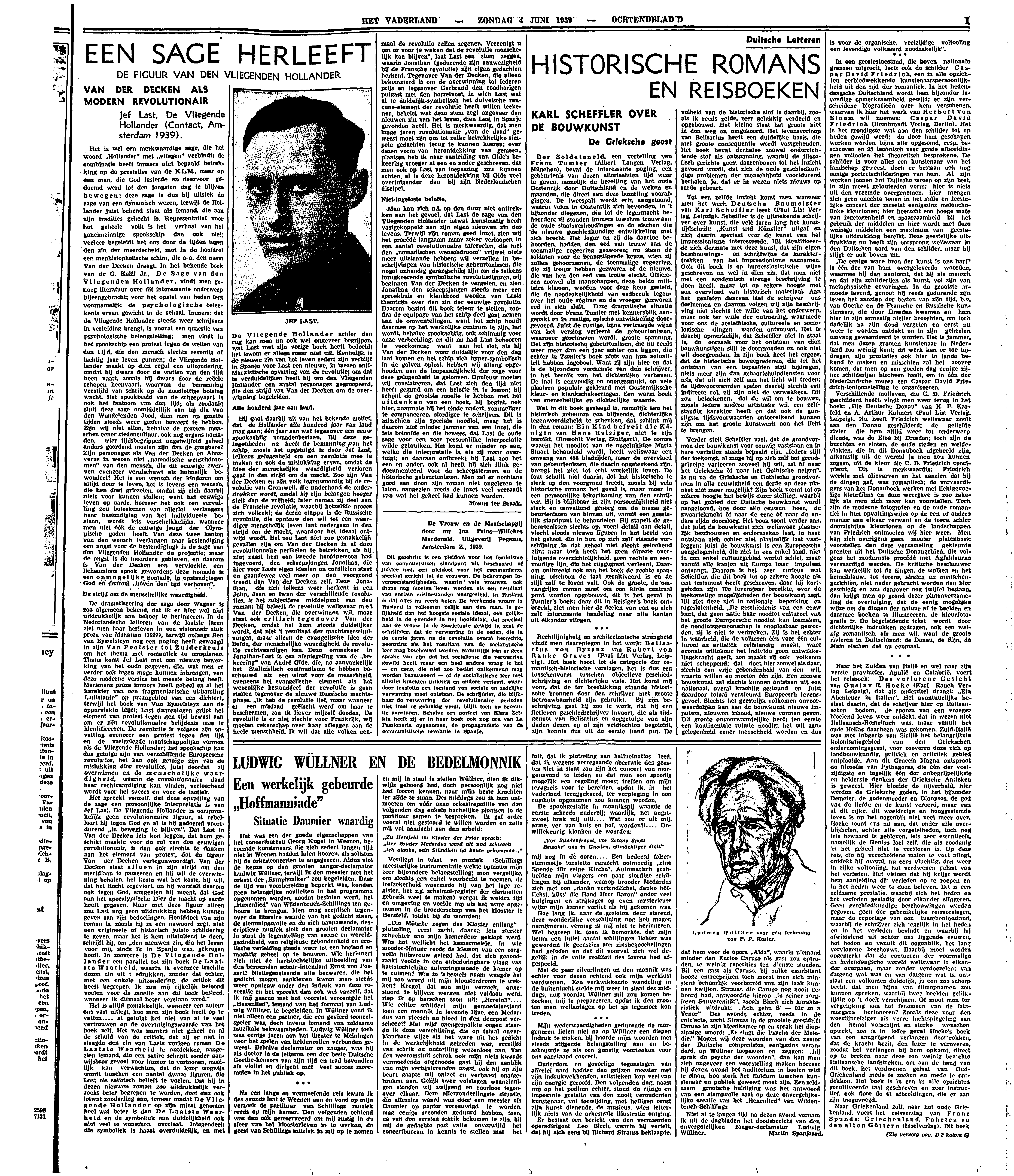De dramatiseering der sage door Wagner is zoo algemeen bekend, dat ik er hier wel niet uitdrukkelijk aan behoef te herinneren. In de Nederlandsche letteren van de laatste jaren ziet men haar herleven in een visionnair stuk proza van Marsman (1927), terwijl onlangs Ben van Eysselsteyn nog een poging heeft gewaagd in zijn Van Poolster tot Zuiderkruis om het thema met romantiek te omspinnen. Thans komt Jef Last met een nieuwe bewerking van het oude gegeven, die, wat men er verder ook tegen moge kunnen inbrengen, van deze moderne versies het meeste belang heeft. Marsmans proza immers heeft geheel en al het karakter van een fragmentarische uitbarsting (‘uitstapje’ op prozagebied van een dichter), terwijl het boek van Van Eysselsteyn aan de oppervlakte blijft; Last daarentegen grijpt het element van protest tegen den tijd bewust aan om er zijn revolutionnaire belijdenis mee te identificeeren. De revolutie is volgens zijn opvatting evenzeer een protest tegen den tijd en de vastgelegde maatschappelijke vormen als de Vliegende Hollander; het spookschip kan dus getuige zijn van verschillende Europeesche revoluties, het kan ook getuige zijn van de mislukking dier revoluties, juist doordat zij overwinnen en de menschelijke waardigheid, waarin de revolutionnaire daad haar rechtvaardiging kan vinden, verloochend wordt voor het succes en voor de tactiek.