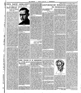 Men kan zich n.l. op den duur niet onttrekken aan het gevoel, dat Last de sage van den Vliegenden Hollander ietwat kunstmatig heeft vastgekoppeld aan zijn eigen nieuwen zin des levens. Terwijl zijn roman goed inzet, zien wij het procédé langzaam maar zeker verloopen in een aantal revolutionnaire tafereelen, die met den ‘nomadischen wenschdroom’ vrijwel niets meer uitstaande hebben; wij verzeilen in beschrijvingen van historische gebeurtenissen, die nogal onhandig gerangschikt zijn om de telkens terugkeerende symbolische revolutiefiguren, wij beginnen Van der Decken te vergeten, en zien Jonathan den scheepsjongen steeds meer een spreekbuis en klankbord worden van Lasts theorieën over den zin der eeuwige revolutie. Daarom begint dit boek teleur te stellen, zoodra de equipage van het schip deel gaat nemen aan de omwentelingen, want het schip houdt daarmee op het werkelijke centrum te zijn, het wordt, behalve spookachtig, ook schimmig voor onze verbeelding, en dit nu had Last behooren te voorkomen; want aan het slot, als hij Van der Decken weer duidelijk voor den dag laat komen en het schip zich hyper-symbolisch in de golven oplost, hebben wij allang opgehouden aan de toepasselijkheid der sage voor deze gelegenheid te gelooven. Opnieuw moeten wij constateeren, dat Last zich den tijd niet heeft gegund om een belofte in te lossen; hij schijnt de grootste moeite te hebben met het uitdenken van een boek, hij begint, ook hier, naarmate hij het einde nadert, rommeliger te componeeren, stordiger te schrijven. Dit is misschien zijn speciale noodlot, maar het is daarom niet minder jammer van een inzet, die iets beloofde en die bewees. dat Last de oude sage voor een zeer persoonlijke interpretatie wilde gebruiken. Het komt er minder op aan, welke die interpretatie is, als zij maar overtuigt; en daaraan ontbreekt bij Last zoo het een en ander, ook al heeft hij zich flink gedocumenteerd voor de scheepstermen en de historische gebeurtenissen. Men zal er nochtans goed aan doen zijn roman niet ongelezen te laten, aangezien reeds de inzet veel verraadt van wat het geheel had kunnen worden.