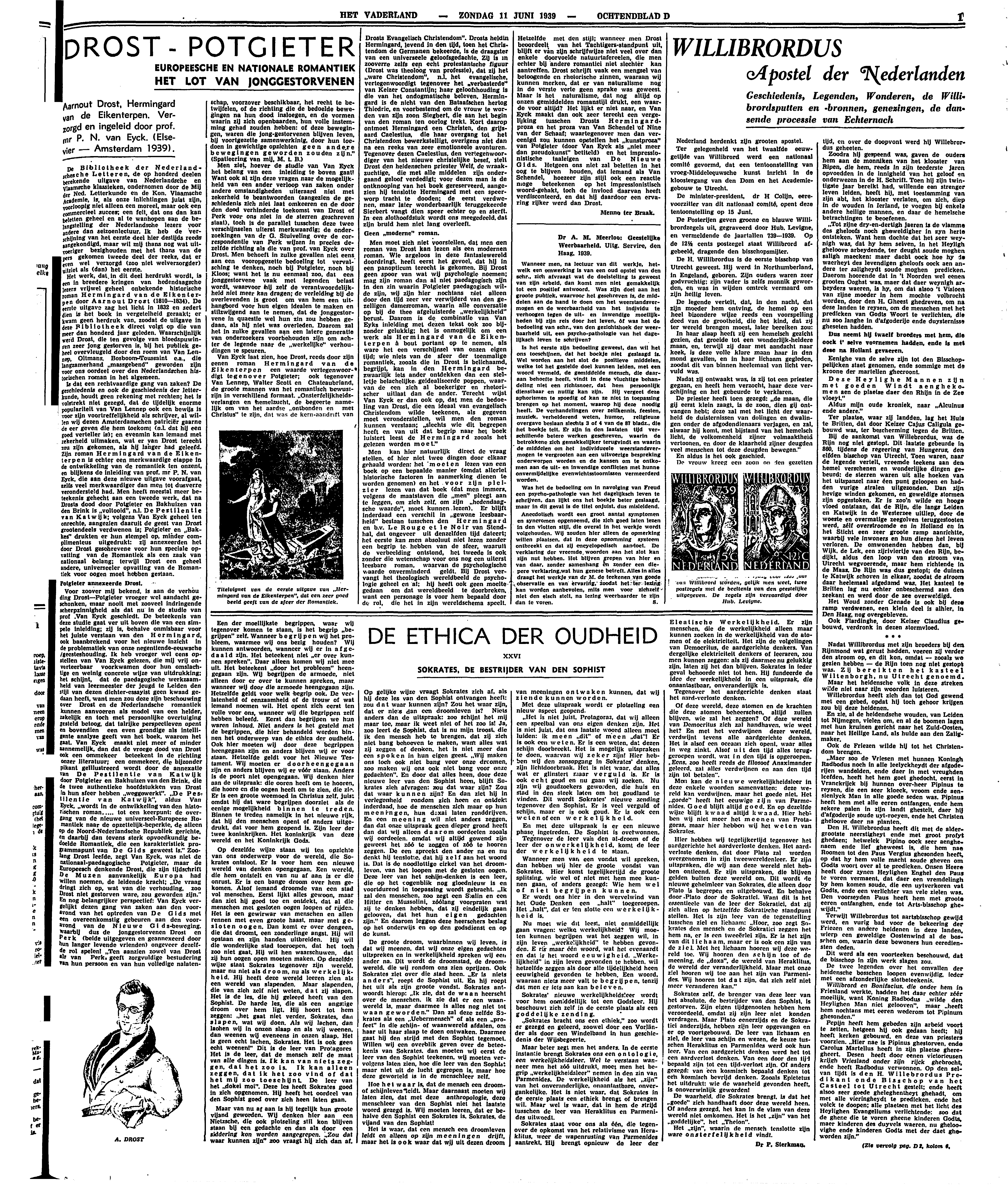 Men moet zich niet voorstellen, dat men den roman van Drost kan lezen als een modernen roman. Wie argeloos in deze fantasiewereld doordringt, heeft eerst het gevoel, dat hij in een panopticum terecht is gekomen. Bij Drost geen spoor van wat wij psychologie noemen; mag zijn roman dan al niet paedagogisch zijn in den zin waarin Potgieter paedagogisch wilde zijn, wij zijn hier nochtans niet alleen door den tijd zeer ver verwijderd van den gezelligen damesroman, waarin alle conversatie op bij de thee afgeluisterde ‘werkelijkheid’ berust. Daarom is de combinatie van Van Eyks inleiding met dezen tekst ook zoo bijzonder gelukkig; het is onmogelijk om een werk als Hermingard van de Eikenterpen à bout portant op te nemen, als ware het een verschijnsel van onzen eigen tijd; wie niets van de sfeer der toenmalige romantiek, zooals die in Drost is belichaamd, begrijpt, kan in den Hermingard bezwaarlijk iets ander ontdekken dan een stelletje belachelijke geidealiseerde poppen, waarvan de een zich al boekeriger en rhetorischer uitlaat dan de ander. Terecht wijst Van Eyck er dan ook op, dat men de bedoeling van Drost, die een ideaal van evangelisch Christendom wilde teekenen, als gegeven moet veronderstellen, wil men den roman kunnen verstaan; ‘slechts wie dit begrepen heeft en van uit dat begrip naar het boek luistert leest de Hermingard zooals het gelezen worden moet.’