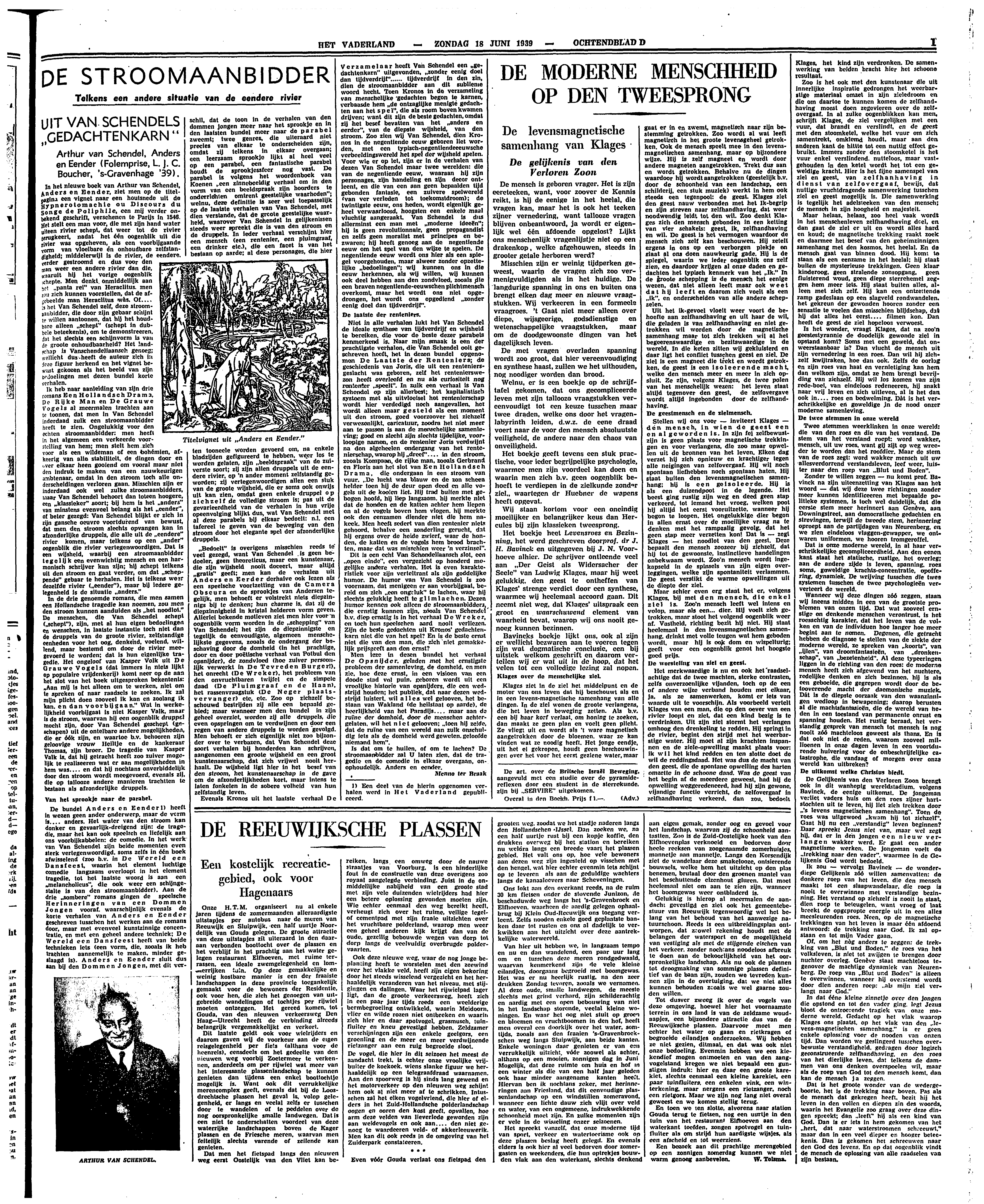 In het nieuwe boek van Arthur van Schendel, Anders en Eender, ziet men op de titelpagina een vignet naar een houtsnede uit de Hypnerotomachie ou Discours du Songe de Poliphile, een mij verder onbekend geschrift, verschenen te Parijs in 1546. Het stelt een man voor, die met zijn hand water uiteen rivier schept, dat weer tot de rivier terugkeert, nadat het één oogenblik uit die rivier was opgeheven, als een voorbijgaande vorm van vloeibare en onhoudbare zelfstandigheid; middelerwijl is de rivier, de eendere, verder gestroomd en dus voor den man weer een andere rivier dan die, waaruit hij het vorige oogenblik schepte. Men denkt onmiddellijk aan het ‘panta rei’ van Heraclitus, men zou zich kunnen voorstellen, dat de afgebeelde man Heraclitus wàs. Of.... is het Van Schendel zelf, deze stroomaanbidder, die door zijn gebaar schijnt te willen aantoonen, dat hij het houdbare alleen ‘schept’ (schept in dubbele beteekenis), om te demonstreeren, dat het slechts een schijnvorm is van de groote onhoudbaarheid? Het landschap is Vanschendeliaansch genoeg; wellicht dus heeft de auteur zich in deze figuur herkend en het vignet bewust gekozen als het beeld van zijn bedoelingen met dezen bundel korte verhalen.