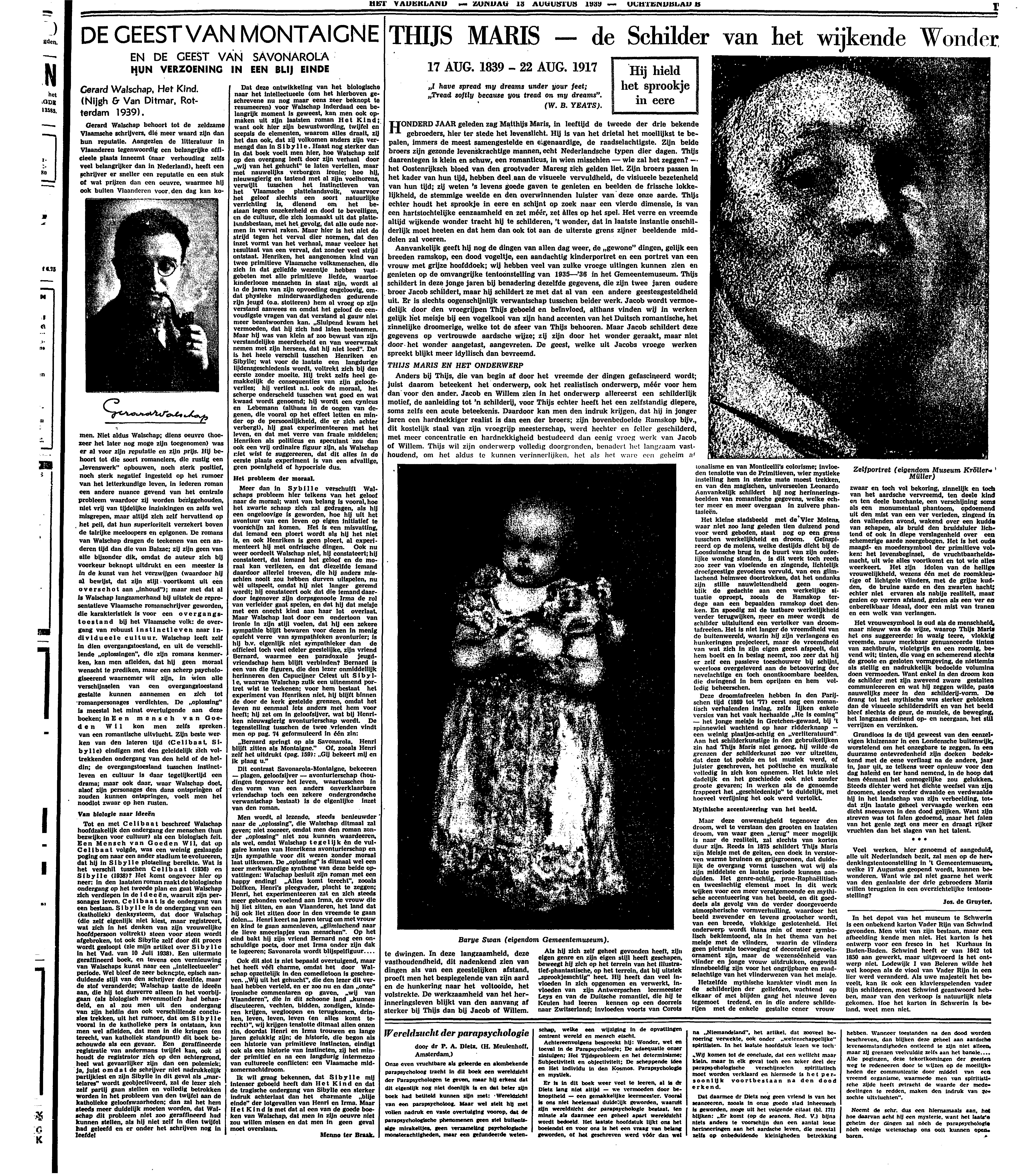 Gerard Walschap behoort tot de zeldzame Vlaamsche schrijvers, die meer waard zijn dan hun reputatie. Aangezien de litteratuur in Vlaanderen tegenwoordig een belangrijke officieele plaats inneemt (naar verhouding zelfs veel belangrijker dan in Nederland), heeft een schrijver er sneller een reputatie en een stuk of wat prijzen dan een oeuvre, waarmee hij ook buiten Vlaanderen voor den dag kan komen. Niet aldus Walschap; diens oeuvre (hoezeer het later nog moge zijn toegenomen) was er al voor zijn reputatie en zijn prijs. Hij behoort tot die soort romanciers, die rustig een ‘levenswerk’ opbouwen, noch sterk positief, noch sterk negatief ingesteld op het rumoer van het letterkundige leven, in iederen roman een andere nuance gevend van het centrale probleem waardoor zij worden beziggehouden, niet vrij van tijdelijke inzinkingen en zelfs wel misgrepen, maar altijd zich zelf hervattend op het peil, dat hun superioriteit verzekert boven de talrijke meeloopers en epigonen. De romans van Walschap dragen de teekenen van een anderen tijd dan die van Balzac; zij zijn geen van alle bijzonder dik, omdat de auteur zich bij voorkeur beknopt uitdrukt en een meester is in de kunst van het verzwijgen (waardoor hij al bewijst, dat zijn stijl voortkomt uit een overschot aan ‘inhoud’); maar met dat al is Walschap langzamerhand bij uitstek de representatieve Vlaamsche romanschrijver geworden, die karakteristiek is voor een overgangstoestand bij het Vlaamsche volk: de overgang van robuust instinctleven naar individueele cultuur. Walschap leeft zelf in dien overgangstoestand, en uit de verschillende ‘oplossingen’, die zijn romans kenmerken, kan men afleiden, dat hij geen moraal wenscht te prediken, maar een scherp psychologiseerend waarnemer wil zijn, in wien alle verschijnselen van een overgangstoestand gestalte kunnen aannemen en zich tot romanpersonages verdichten. De ‘oplossing’ is meestal het minst overtuigende aan deze boeken; in Een mensch van Goeden Wil kon men zelfs spreken van een romantische uitvlucht. Zijn beste werken van den lateren tijd (Celibaat, Sibylle) eindigen met den geleidelijk zich voltrekkenden ondergang van den held of de heldin; de overgangstoestand tusschen instinctleven en cultuur is daar tegelijkertijd een drama; maar ook daar, waar Walschap doet, alsof zijn personages den dans ontspringen of zouden kunnen ontspringen, voelt men het noodlot zwaar op hen rusten.