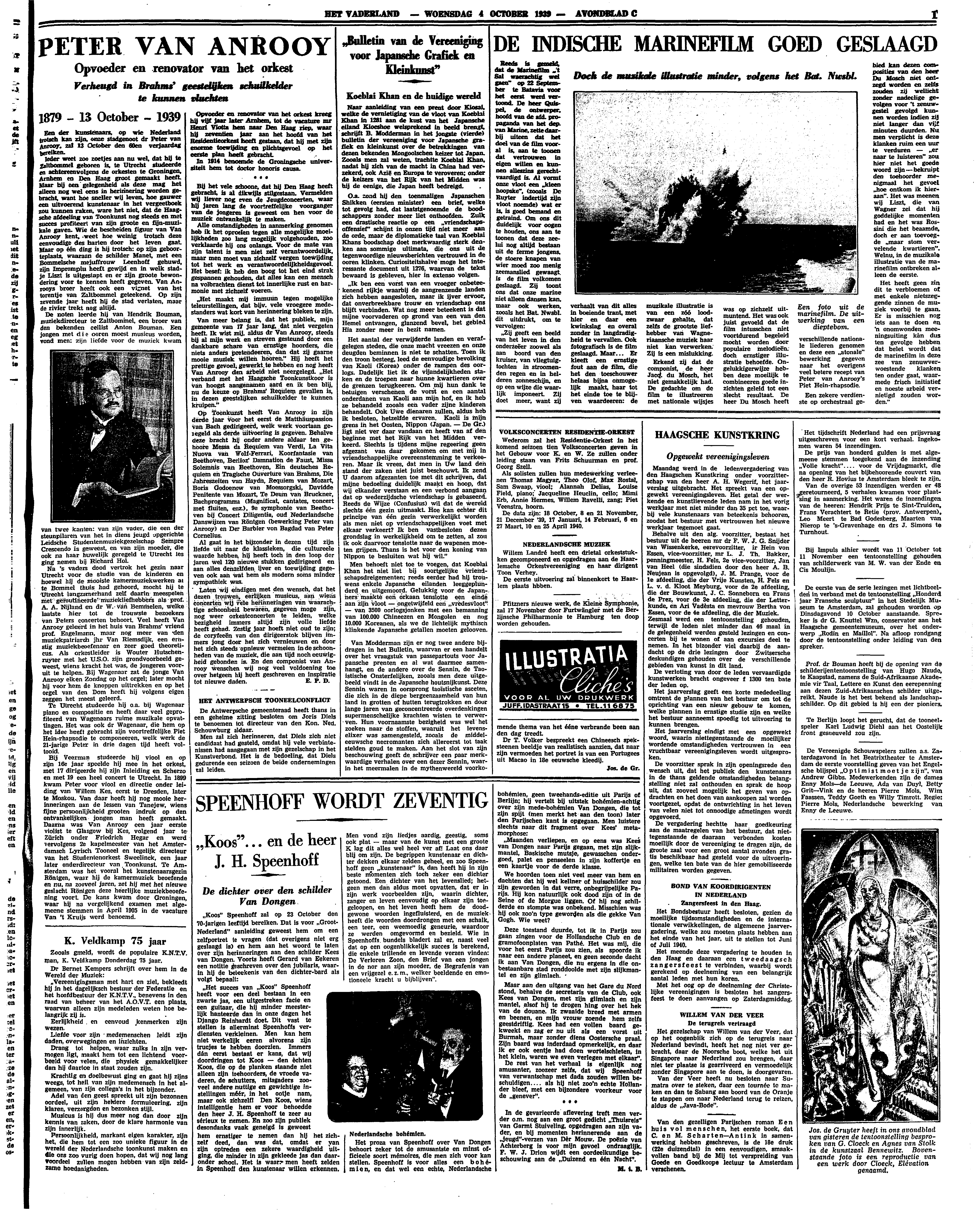 ‘Koos’ Speenhoff zal op 23 October den 70-jarigen leeftijd bereiken. Dat is voor ‘Groot-Nederland’ aanleiding geweest hem om een zelfportret te vragen (dat overigens niet erg geslaagd is) en hem aan het woord te laten over zijn herinneringen aan den schilder Kees van Dongen. Voorts heeft Gerard van Eekeren een notitie geschreven over den jubilaris, waarin hij de beteekenis van den dichter-bard als volgt bepaalt: