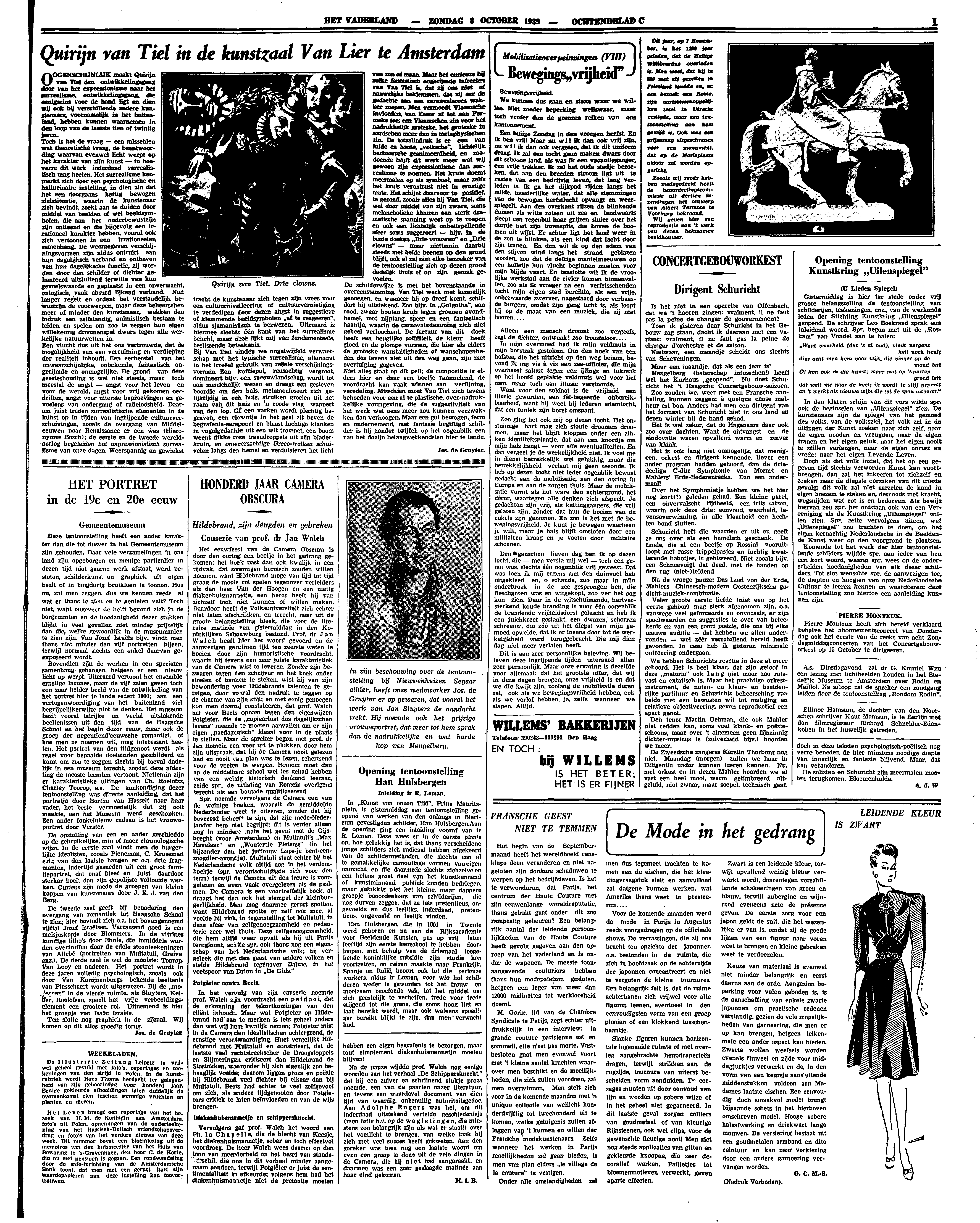Het eeuwfeest van de Camera Obscura is door den oorlog een beetje in het gedrang gekomen; het boek past dan ook kwalijk in een tijdvak, dat sommigen heroisch zouden willen noemen, want Hildebrand moge van tijd tot tijd graag de mooie rol spelen tegenover verleiders als den heer Van der Hoogen en een nietig diakenhuismannetje, een heros heeft hij van zichzelf toch niet kunnen of willen maken. Daardoor heeft de Volksuniversiteit zich echter niet laten afschrikken, en terecht, naar uit de groote belangstelling bleek, die voor de literaire matinee van gistermiddag in den Koninklijken Schouwburg bestond. Prof. dr Jan Walch heeft hier het woord gevoerd en de aanwezigen geruimen tijd ten zeerste weten te boeien door zijn humoristische voordracht, waarin hij tevens een zeer juiste karakteristiek van de Camera wist te leveren. Zonder zijn bezwaren tegen den schrijver en het boek onder stoelen of banken te steken, wist hij van zijn bewondering voor Hildebrands talenten te getuigen, door vooral den nadruk te leggen op de charme van zijn stijl; en met eenig genoegen kon men daarbij constateeren, dat prof. Walch het voor Beets opnam tegen den eigenwijzen Potgieter, die de ‘copieerlust des dagelijkschen levens’ meende te moeten aanvallen om er zijn eigen ‘paedagogisch’ ideaal voor in de plaats te stellen. Maar de spreker begon met prof. dr Jan Romein een veer uit te plukken, door hem zijn uitspraak, dat hij de Camera nooit gelezen had en nooit van plan was te lezen, schertsend voor de voeten te werpen. Romein moet dan op de middelbare school wel les gehad hebben van een weinig historisch denkend leeraar, zeide spr., de uitlating van Romein overigens terecht als een boutade qualificeerend.
