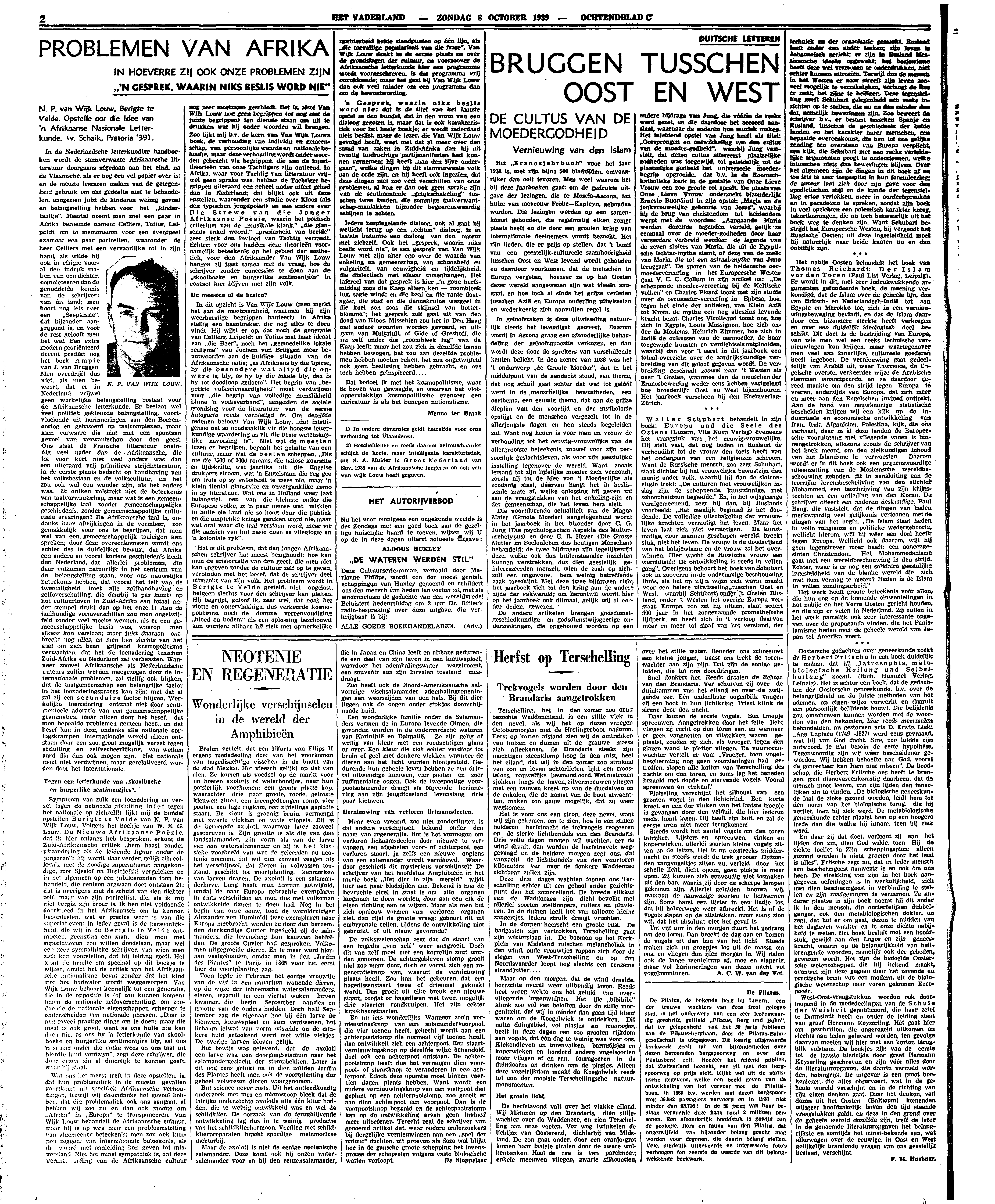 'n Gesprek, waarin niks beslis word nie: dat is de titel van het laatste opstel in den bundel, dat in den vorm van een dialoog gegoten is, maar dat is ook karakteristiek voor het heele boekje; er wordt inderdaad niets beslist, maar de lezer, die Van Wijk Louw gevolgd heeft, weet met dat al meer over den stand van zaken in Zuid-Afrika dan hij uit twintig luidruchtige partijmanifesten had kunnen vernemen; hij heeft ‘aan den lijve ondergaan’, welke dingen bij dit stamverwante volk aan de orde zijn, en hij heeft ook ingezien, dat deze dingen niet zoo veel verschillen van onze problemen, al kan er dan ook geen sprake zijn van de sentimenteele ‘gelijkschakeling’ tusschen twee landen, die sommige taalverwantschap-maniakken bijzonder begeerenswaardig schijnen te achten.