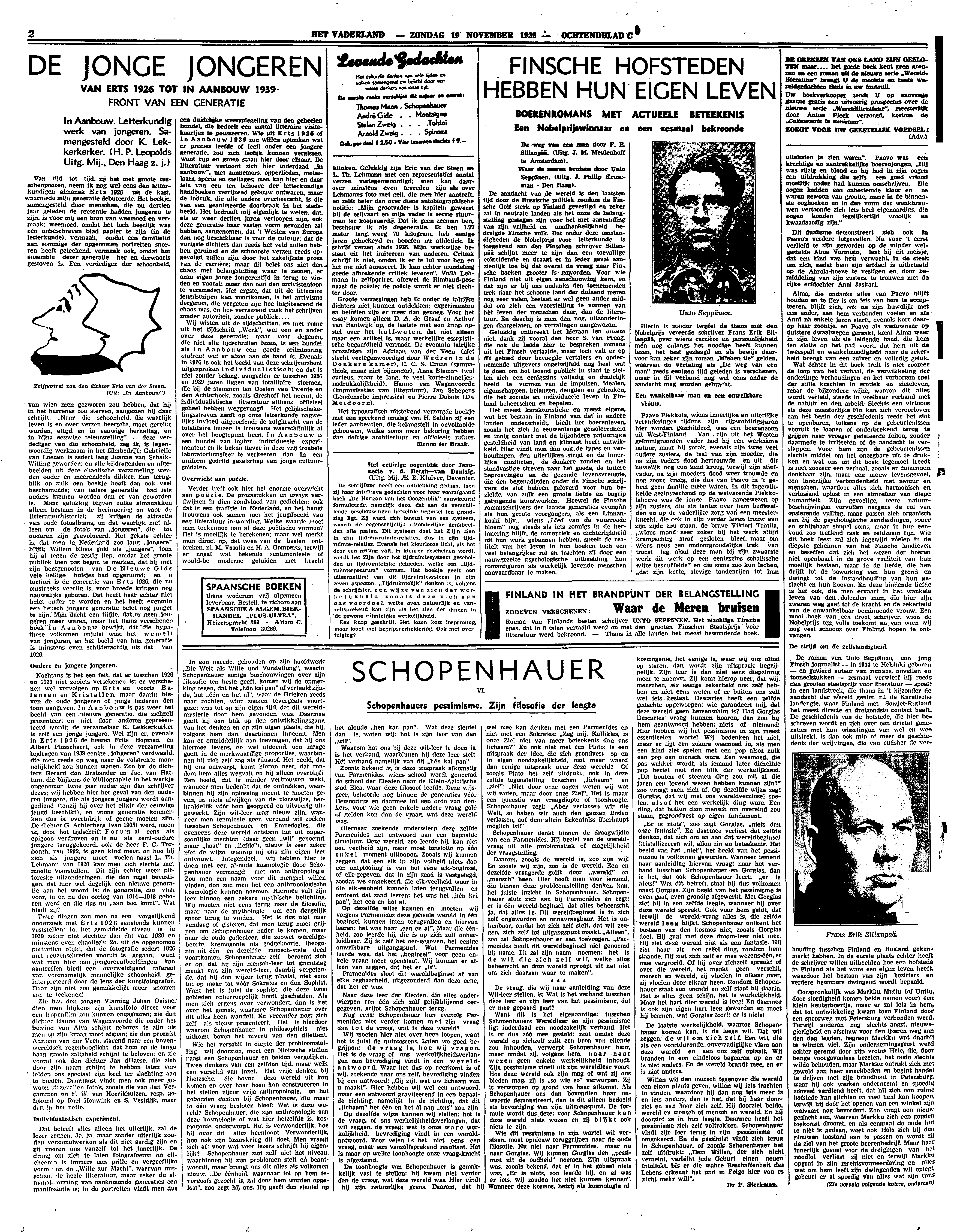 Van tijd tot tijd, zij het met groote tusschenpoozen, neem ik nog wel eens den letterkundigen almanak Erts 1926 uit de kast, waarmede mijn generatie debuteerde. Het boekje, samengesteld door menschen, die nu dertien jaar geleden de pretentie hadden jongeren te zijn, is voor mij een bron van weemoed en vermaak; weemoed, omdat het toch heerlijk was een onbeschreven blad papier te zijn (in de letterkunde), vermaak, omdat een familielid aan sommige der opgenomen portretten snorren heeft geteekend, vermaak ook, omdat het ensemble dezer generatie her en derwaarts gestoven is. Een verdediger der schoonheid, van wien men gezworen zou hebben, dat hij in het harrenas zou sterven, aangezien hij daar schrijft: ‘Naar die schoonheid, die waarlijk leven is en over verzen heerscht, moet gereikt worden, altijd en in eeuwige herhaling, en in bijna eeuwige teleurstelling’.... deze verdediger van die schoonheid, zeg ik, is tegenwoordig werkzaam in het filmbedrijf; Gabrielle van Loenen is sedert lang Jeanne van Schaik-Willing geworden; en alle bijdragenden en afgebeelden uit deze chaotische verzameling werden ouder en meerendeels dikker. Een terugblik op zulk een boekje heeft dan ook veel beschamends; van iedere generatie had iets anders kunnen worden dan er van geworden is. Maar gelukkig blijven zulke almanakken alleen bestaan in de herinnering en voor de litteratuurhistorici; zij krijgen de attractie van oude fotoalbums, en dat waarlijk niet alleen om de foto's van ‘jongeren’, die tot ouderen zijn geëvolueerd. Het gekste echter is, dat men in Nederland zoo lang ‘jongere’ blijft; Willem Kloos gold als ‘jongere’, toen hij al tegen de zestig liep, omdat het groote publiek toen pas begon te merken, dat hij met zijn bentgenooten van De Nieuwe Gids vele heilige huisjes had opgeruimd; en a fortiori is de generatie van Erts 1926, die nu omstreeks veertig is, voor breede kringen nog nauwelijks geboren. Dat heeft haar echter niet belet ouder te worden en het heeft evenmin een heusch jongere generatie belet nog jonger te zijn. Men dacht een tijdje, dat er geen jongeren meer waren, maar het thans verschenen boek In Aanbouw bewijst, dat die hypothese volkomen onjuist was; het wemelt van jongeren, en het beeld van hun generatie is minstens even schilderachtig als dat van 1926.