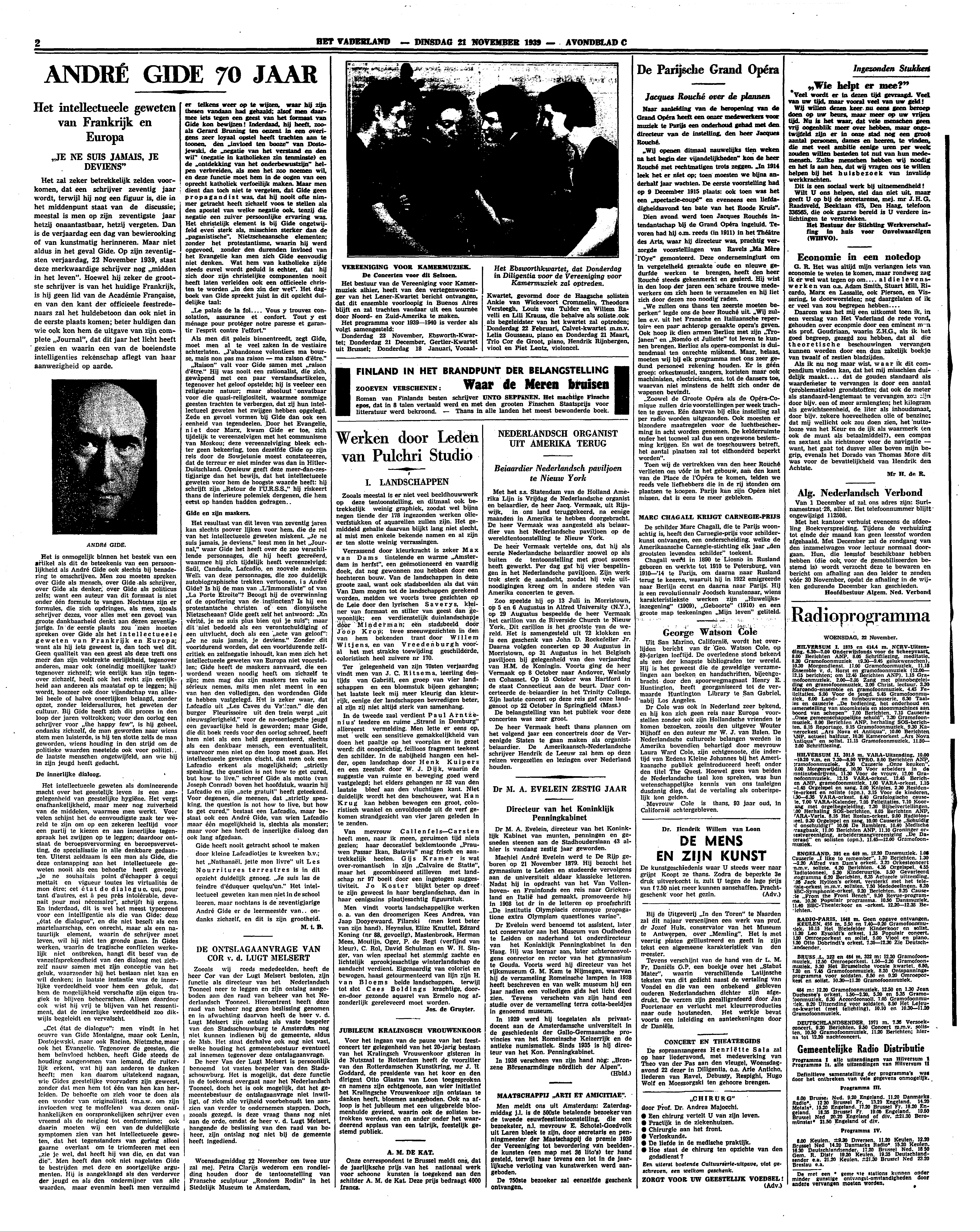 Het zal zeker betrekkelijk zelden voorkomen, dat een schrijver zeventig jaar wordt, terwijl hij nog een figuur is, die in het middenpunt staat van de discussie; meestal is men op zijn zeventigste jaar hetzij onaantastbaar, hetzij vergeten. Dan is de verjaardag een dag van bewierooking of van kunstmatig herinneren. Maar niet aldus in het geval Gide. Op zijn zeventigsten verjaardag, 22 November 1939, staat deze merkwaardige schrijver nog ‘midden in het leven’. Hoewel hij zeker de grootste schrijver is van het huidige Frankrijk, is hij geen lid van de Académie Française, en van den kant der officieele feestredenaars zal het huldebetoon dan ook niet in de eerste plaats komen; beter huldigen dan wie ook kon hem de uitgave van zijn complete ‘Journal’, dat dit jaar het licht heeft gezien en waarin een van de boeiendste intelligenties rekènschap aflegt van haar aanwezigheid op aarde.