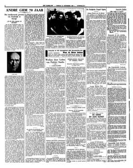 Het is onmogelijk binnen het bestek van een artikel als dit de beteekenis van een persoonlijkheid als André Gide ook slechts bij benadering te omschrijven. Men zou moeten spreken over Gide als mensch, over Gide als schrijver, over Gide als denker, over Gide als politicus zelfs; want een auteur van dit formaat is niet onder één formule te vangen. Nochtans zijn er formules, die zich opdringen, als men, zooals schrijver dezes, voor alles met een gevoel van groote dankbaarheid denkt aan dezen zeventigjarige. In de eerste plaats zou men moeten spreken over Gide als het intellectueele geweten van Frankrijk en Europa; want als hij iets geweest is, dan toch wel dit. Geen qualiteit van een geest als deze treft ons meer dan zijn volstrekte eerlijkheid, tegenover anderen, maar ook (oneindig moeilijker taak!) tegenover zichzelf; wie eerlijk kan zijn tegenover zichzelf, heeft ook het recht zijn eerlijkheid aan anderen als maatstaf op te leggen; hij wordt, hoezeer ook door vijandschap van allerlei heele of halve oneerlijken belaagd, zonder opzet, zonder leidersallures, het geweten der cultuur. Bij Gide heeft zich dit proces in den loop der jaren voltrokken; voor den oorlog een schrijver voor ‘the happy few’, is hij geheel, ondanks zichzelf, de man geworden naar wiens stem men luisterde, is hij ten slotte zelfs de man geworden, wiens houding in den strijd om de politieke waarden meetelde ook voor politici.. de laatste menschen ongetwijfeld, aan wie hij in zijn jeugd heeft gedacht.