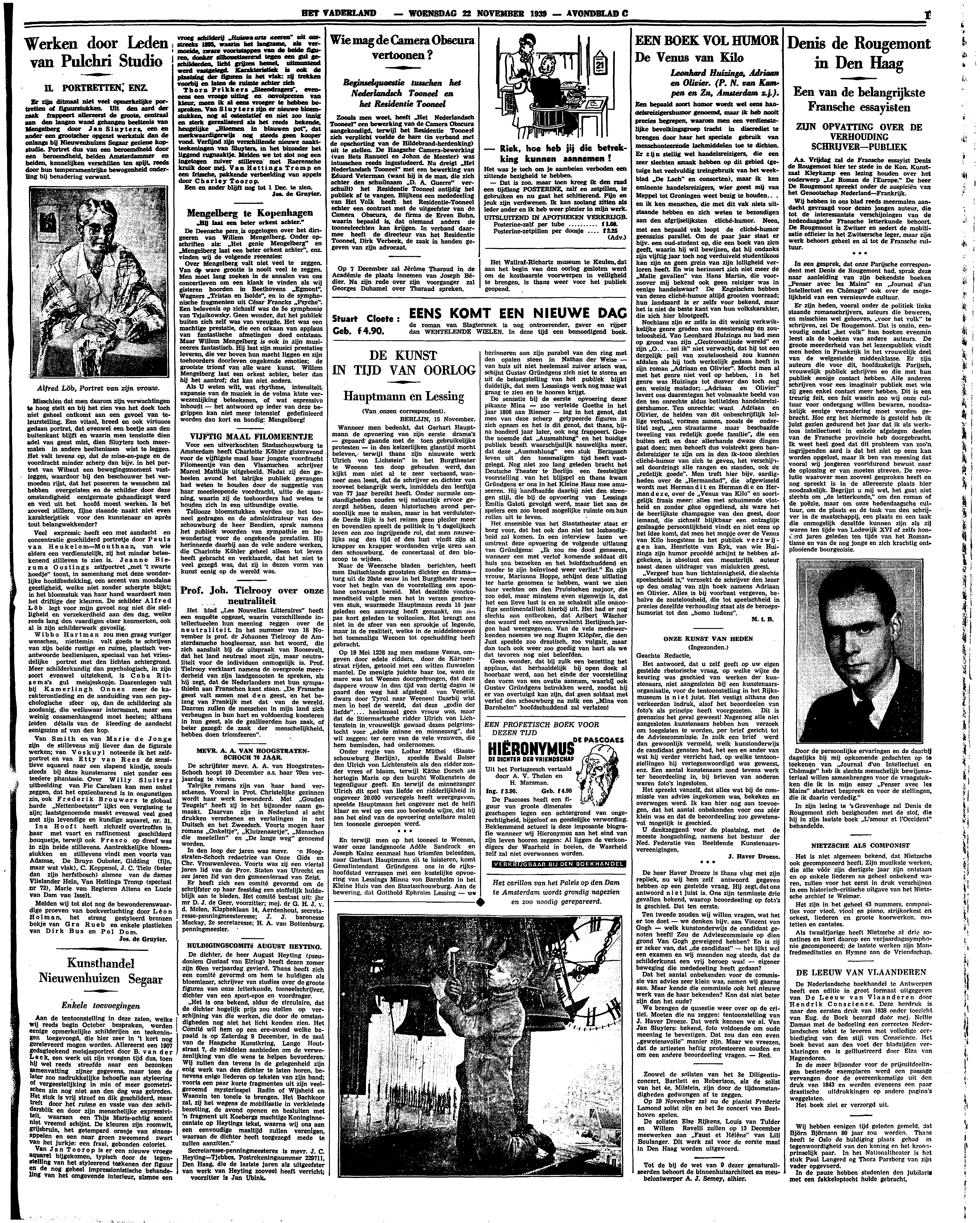 Nochtans zijn er zelfs in dit weinig verkwikkelijke genre graden van meesterschap en zouteloosheid. Van Leonhard Huizinga nu had men op grond van zijn ‘Gestroomlijnde wereld’ en zijn ‘O.... zei ik’ niet verwacht, dat hij tot een dergelijk peil van zouteloosheid zou kunnen afdalen als hij toch werkelijk gedaan heeft in zijn roman ‘Adriaan en Olivier’. Mocht men al met het genre niet veel op hebben, in het genre was Huizinga tot dusver dan toch nog een weinig matador; ‘Adriaan en Olivier’ levert ons daarentegen het volmaakte beeld van den ten onrechte aldus betitelden handelsreizigershumor. Ten onrechte: want Adriaan en Olivier, de helden van dit onbeschrijflijk lollige verhaal, vormen samen, zooals de ondertitel zegt, ‘een straatarme maar beschaafde tweeling van redelijk goede familie’, die een buiten erft en daar allerhande dwaze dingen gaat doen; men behoeft dus volstrekt geen handelsreiziger te zijn om in den ik-toon slechten cliché-humor van zich te geven, het verschijnsel doordringt alle rangen en standen, ook de ‘redelijk goede’. Men treft hier bijv. aardigheden over de ‘Hermandad’, die afgewisseld wordt met Herman dit en Herman die en Herman deze, over de ‘Venus van Kilo’ en soortgelijk fraais meer: alles met schuimende vlotheid en zonder gêne opgediend, als ware het de heerlijkste champagne van den geest, door iemand, die zichzelf blijkbaar een ontzaglijk geslaagde persoonlijkheid vindt en niet eens op het idee komt, dat men het mopje over de Venus van Kilo hoogstens in het publiek verzwijgen kan. Henriette van Eyk, van wie Huizinga zijn humor procédé schijnt te hebben afgekeken, is absoluut een meesterlijk auteur naast dezen uitdrager van mislukten geest.