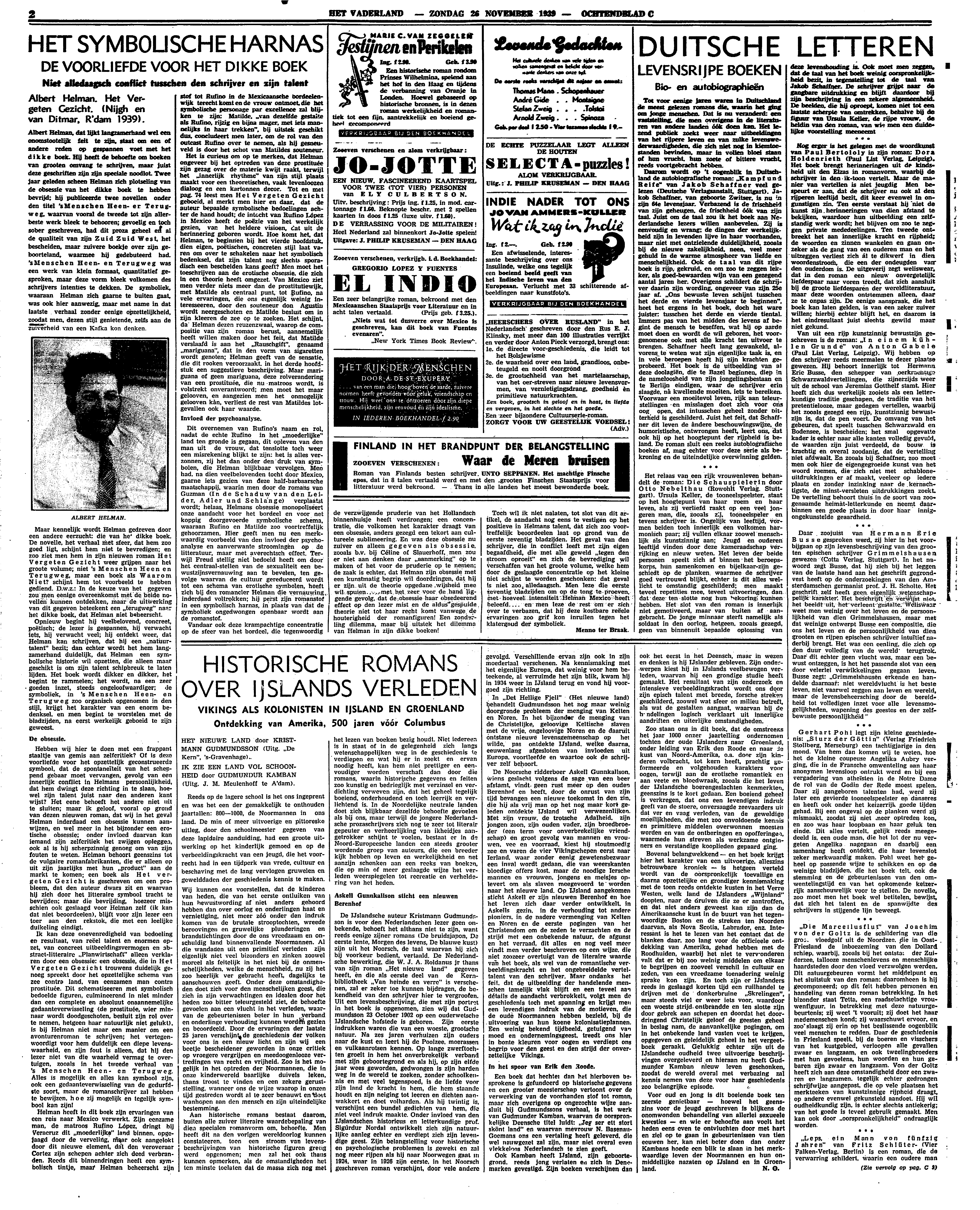 Albert Helman, dat lijkt langzamerhand wel een onomstootelijk feit te zijn, staat om een of andere reden op gespannen voet met het dikke boek. Hij heeft de behoefte om boeken van grooten omvang te schrijven, maar juist deze geschriften zijn zijn speciale noodlot. Twee jaar geleden scheen Helman zich plotseling van de obsessie van het dikke boek te hebben bevrijd; hij publiceerde twee novellen onder den titel 's Menschen Heen- er Terugweg, waarvan vooral de tweede tot zijn allerbeste werk bleek te behooren; gevoelig en toch sober geschreven, had dit proza geheel en al de qualiteit van zijn Zuid Zuid West, het bescheiden, maar zuivere boekje over zijn geboorteland, waarmee hij gedebuteerd had. 's Menschen Heen- en Terugweg was een werk van klein formaat, quantitatief gesproken, maar deze vorm bleek volkomen des schrijvers intenties te dekken. De symboliek, waaraan Helman zich gaarne te buiten gaat, was ook hier aanwezig, maar met name in dat laatste verhaal zonder eenige opzettelijkheid, zoodat men, dezen stijl genietende, zelfs aan de zuiverheid van een Kafka kon denken.