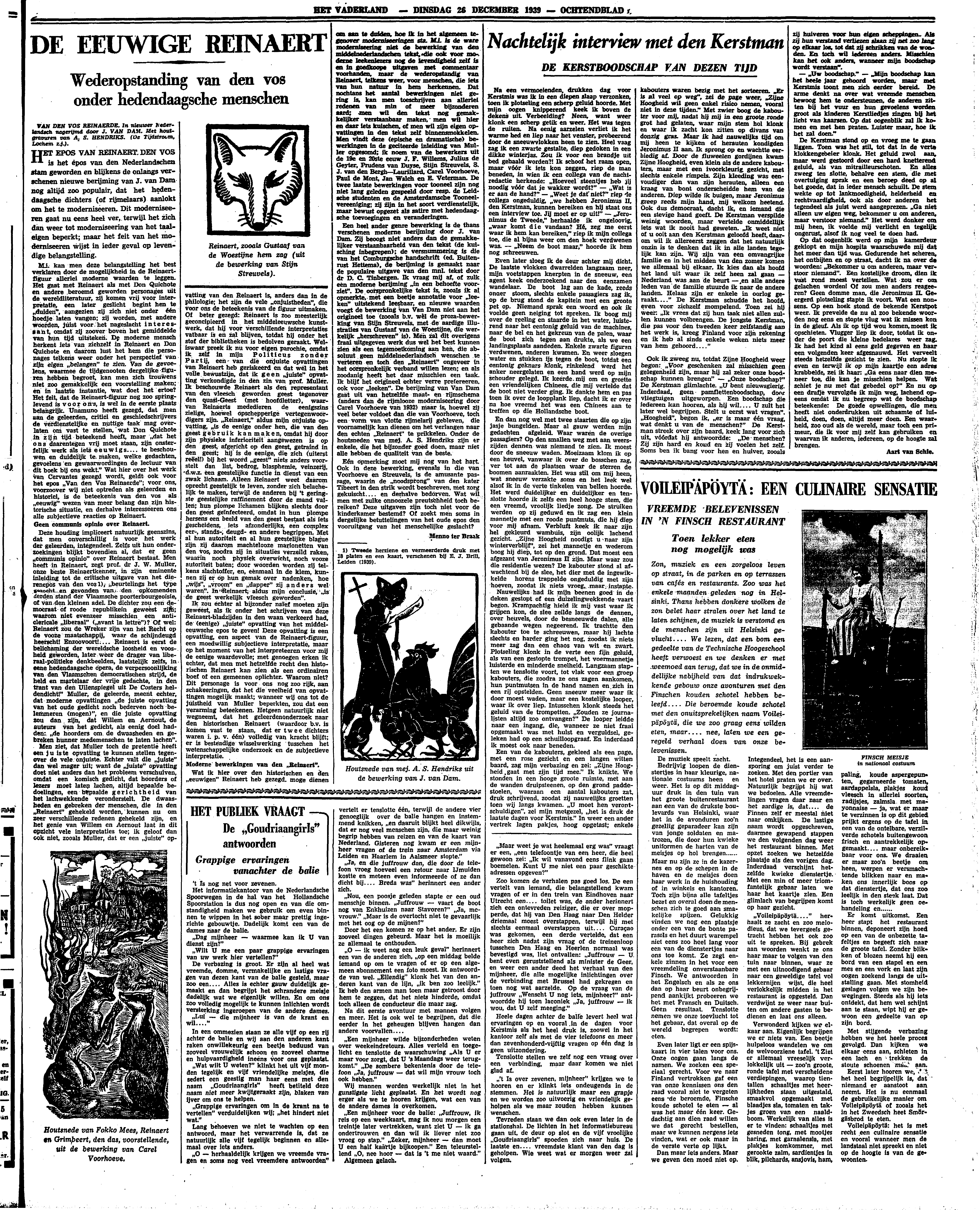 Een heel ander genre bewerking is de thans verschenen moderne berijming door J. van Dam. Zij beoogt niet anders dan de gemakkelijker verstaanbaarheid van den tekst (de kuisching inbegrepen); de versnummering is die van het Comburgsche handschrift (ed. Buitenrust Hettema), de berijming is gemaakt naar de populaire uitgave van den mnl. tekst door dr D.C. Tinbergen. Ik vraag mij af, of zulk een moderne berijming ‘in een behoefte voorziet’. De oorspronkelijke tekst is, zooals ik al opmerkte, met een beetje annotatie voor ‘leeken’ uitstekend leesbaar, en nieuwe waarden voegt de bewerking van Van Dam niet aan het origineel toe (zooals b.v. wèl de proza-bewerking van Stijn Streuvels, met de aardige illustraties van Gustaaf van de Woestijne, die werkelijk ‘herschreven’ is). Men zal dit overigens fraai uitgegeven werk dus wel het best kunnen zien als een tegemoetkoming aan hen, die absoluut geen middelnederlandsch wenschen te verteren en toch den ‘Reinaert’ ongeveer in het oorspronkelijk verband willen lezen; en als zoodanig heeft het daar misschien een taak. Ik blijf het origineel echter verre prefereeren, ook voor ‘leeken’. De berijming van Van Dam gaat uit van hetzelfde maat- en rijmschema (anders dan de rijmlooze moderniseering door Carel Voorhoeve van 1932) maar is, hoewel zij veel beter voldoet dan die van Voorhoeve, toch een vorm van vlotte rijmelarij gebleven, die voornamelijk kan dienen om het verlangen naar den echten ‘Reinaert’ te prikkelen. Onder de houtsneden van mej. A.S. Hendriks zijn er enkele, die het bijzonder goed doen, maar niet alle hebben de qualiteit van de beste.