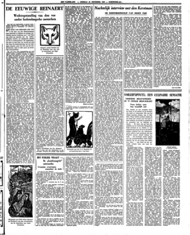 Men ziet, dat Muller toch de pretentie heeft een juiste opvatting te kunnen stellen tegenover de vele onjuiste. Echter valt die ‘juiste’ dan wel mager uit; want de ‘juiste’ opvatting doet niet anders dan het probleem verschuiven, omdat een komisch gedicht, dat hoorders of lezers moet laten lachen, altijd bepaalde bedoelingen, een bepaalde gerichtheid van het lachwekkende veronderstelt. De dwaasheden en gebreken der menschen, die in den ‘Reinaert’ gehekeld worden, kunnen nu om zeer verschillende redenen gehekeld zijn, en het genie van Willem en Aernout laat in dit opzicht vele interpretaties toe; ik geloof dan ook niet, zooals Muller, dat er een ‘juiste’ opvatting van den Reinaert is, anders dan in de philologie; het zijn de vele ‘onjuistheden’, die voor ons de beteekenis van de figuur uitmaken. Of beter gezegd: Reinaert is zoo meesterlijk geconcipieerd in het middeleeuwsche kunstwerk, dat hij voor verschillende interpretaties vatbaar is en zal blijven, totdat hij onder het stof der bibliotheken is bedolven geraakt. Weliswaar preek ik nu voor eigen parochie, omdat ik zelf in mijn Politicus zonder Partij, een van die onjuiste opvattingen van Reinaert heb geriskeerd en dat wel in het volle bewustzijn, dat ik geen ‘juiste’ opvatting verkondigde in den zin van prof. Muller. Ik beschouwde Reinaert als den representant van den vleesch geworden geest tegenover den quasi-Geest (met hoofdletter), waarvan Reinaerts mededieren de eenigszins zielige, hoewel opschepperige vertegenwoordigers zijn. ‘Reinaert,’ aldus mijn onjuiste opvatting, ‘is de eenige onder hen, die van den geest gebruik kan maken, omdat hij door zijn physieke inferioriteit aangewezen is op den geest, afgericht op den geest, getraind in den geest; hij is de eenige, die zich (uiterst reëel!) bij het woord “geest” niets anders voorstelt dan list, bedrog, blasphemie, veinzerij, d.w.z. een geestelijke functie in dienst van een zwak lichaam. Alleen Reinaert weet daarom oprecht geestelijk te leven, zonder zich belachelijk te maken, terwijl de anderen bij 't geringste geestelijke raffinement door de mand vallen; hun plompe lichamen blijken slechts door den geest geïnfecteerd, omdat in hun plompe hersens een beeld van den geest bestaat als iets gescheidens, iets afzonderlijks, een complex eer-, stands-, deugd- en andere begrippen. Met al hun autoriteit en al hun geestelijke blague zijn zij daarom machtelooze marionetten van den vos, zoodra zij in situaties verzeild raken, waarin noch physiek overwicht, noch vooze autoriteit baten; door woorden worden zij telkens slachtoffer, en, eenmaal in de klem, kunnen zij er op hun gemak over nadenken, hoe “wijs”, “vroom” en “dapper” zij anders wel waren’. In Reinaert, aldus mijn conclusie, ‘is de geest werkelijk vleesch geworden’.