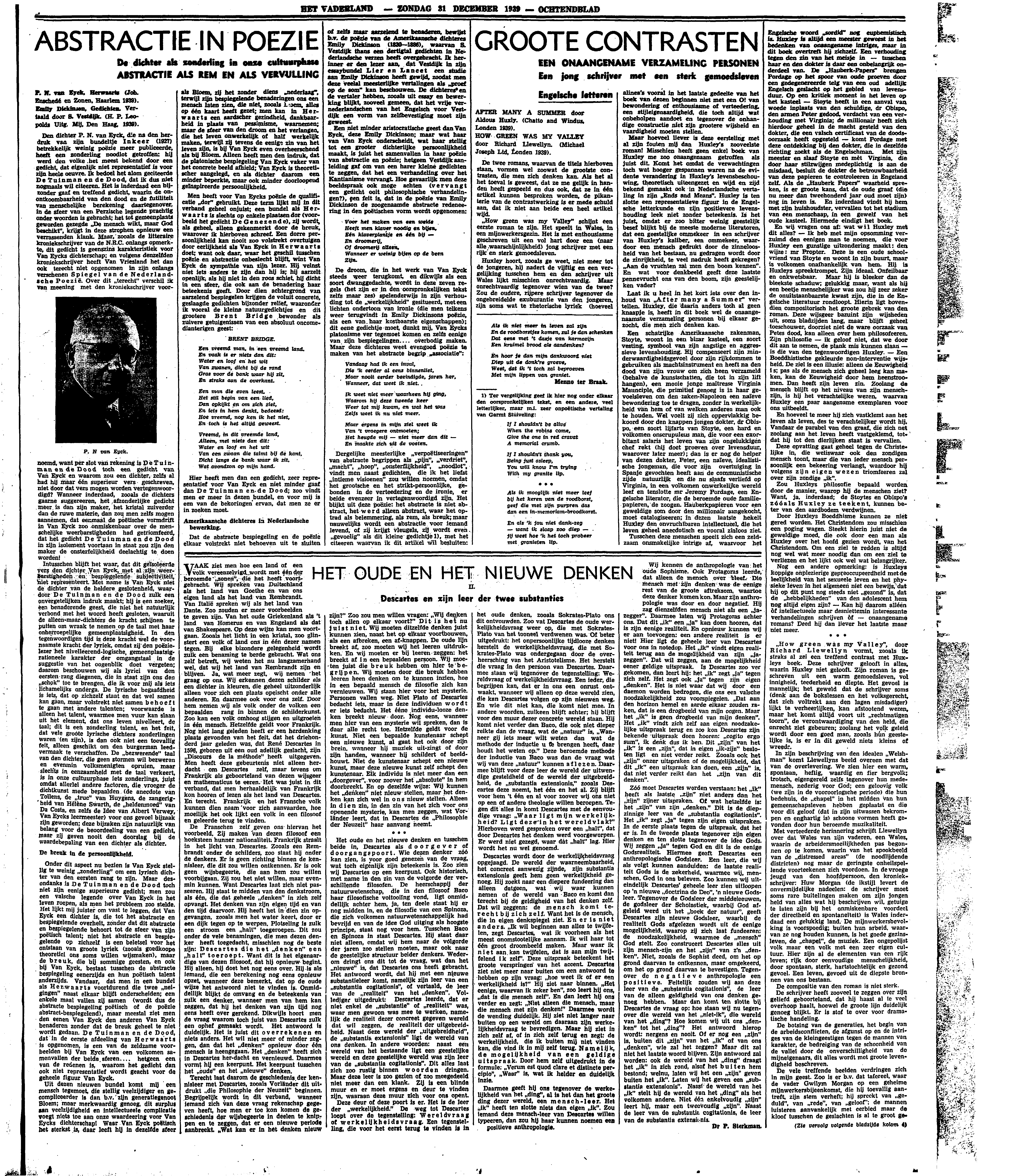 Onder dit aspect nu bezien is Van Eyck stellig te weinig ‘zonderling’ om een lyrisch dichter van den eersten rang te zijn. Maar desondanks is De Tuinman en de Dood toch niet zijn eenige superieure gedicht; men zou een valsche legende over Van Eyck in het leven roepen, als men het probleem zoo stelde. Het lijkt mij juister om vast te leggen, dat Van Eyck een dichter is, die tot het abstracte en bespiegelende overhelt, zonder dat dit abstracte en bespiegelende behoort tot de sfeer van zijn poëtisch talent; niet het abstracte en bespiegelende op zichzelf is een beletsel voor het ontstaan van groote lyriek (zooals goedkoope theoretici ons soms willen wijsmaken), maar de breuk, die bij sommige geesten, en ook bij Van Eyck, bestaat tusschen de abstracte bespiegeling eenerzijds en hun poëtisch talent anderzijds. Vandaar, dat men in een bundel als Herwaarts voortdurend die twee ‘neigingen’ naast elkaar blijft onderscheiden; een enkele maal vallen zij samen (wordt dus de abstracte bespiegeling poëtisch of de poëzie abstract-bespiegelend), maar meestal ziet men den eenen Van Eyck den anderen Van Eyck benaderen zonder dat de breuk geheel te niet wordt gedaan. De Tuinman en de Dood, dat in de eerste afdeeling van Herwaarts is opgenomen, is een van de zeldzame voorbeelden bij Van Eyck van een volkomen samenvallen der beide sferen.... hetgeen een van de redenen is, waarom het gedicht dan ook niet representatief wordt geacht voor de geheele figuur Van Eyck.