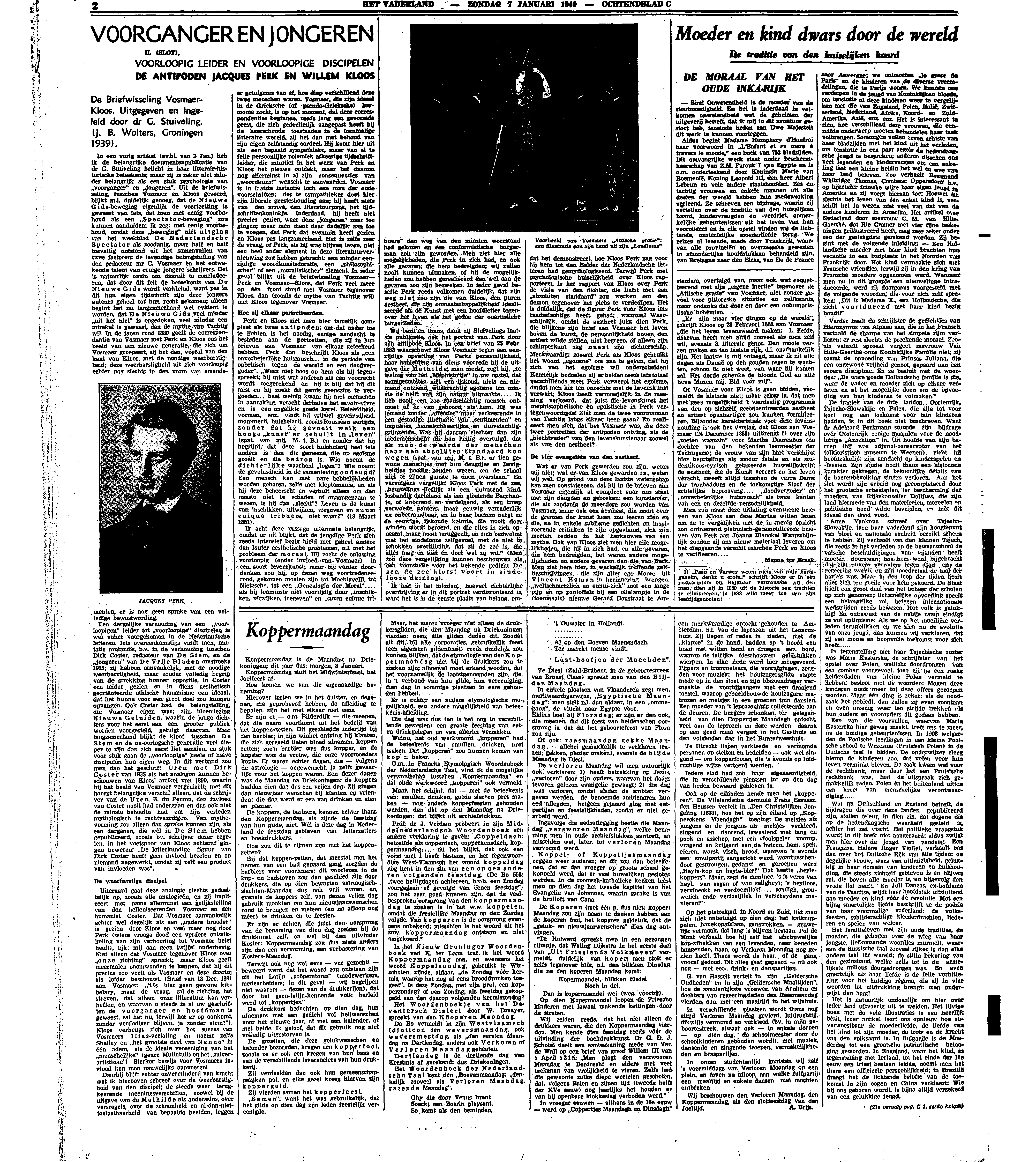 In een vorig artikel (av.bl. van 3 Jan.) heb ik de belangrijke documentenpublicatie van dr G. Stuiveling belicht in haar litterair-historische beteekenis; maar zij is zeker niet minder belangrijk als een stuk psychologie van ‘voorganger’ en ‘jongeren’. Uit de briefwisseling, tusschen Vosmaer en Kloos gevoerd, blijkt m.i. duidelijk genoeg, dat de Nieuwe Gids-beweging eigenlijk de voortzetting is geweest van iets, dat men met eenig voorbehoud als een ‘Spectator-beweging’ zou kunnen aanduiden; ik zeg: met eenig voorbehoud, omdat deze ‘beweging’ niet uitging van het weekblad De Nederlandsche Spectator als zoodanig, maar half en half toevallig ontstond uit het samenvallen van twee factoren: de levendige belangstelling van den redacteur mr C. Vosmaer en het ontwakende talent van eenige jongere schrijvers. Het is natuurlijk onzin om daaruit te concludeeren, dat door dit feit de beteekenis van De Nieuwe Gids wordt verkleind, want pas in dit hun eigen tijdschrift zijn deze jongere auteurs geheel tot hun recht gekomen; alleen begint het nu langzamerhand wel evident te worden, dat De Nieuwe Gids veel minder ‘uit het niet’ is opgedoken, veel minder een mirakel is geweest, dan de mythe van Tachtig wil. In de jaren rond 1880 geeft de correspondentie van Vosmaer met Perk en Kloos ons het beeld van een nieuwe generatie, die zich om Vosmaer groepeert, zij het dan, vooral van den kant van Kloos, met de noodige weerbarstigheid; deze weerbarstigheid uit zich voorloopig echter nog slechts in den vorm van amendementen, er is nog geen sprake van een volledige bewustwording.
