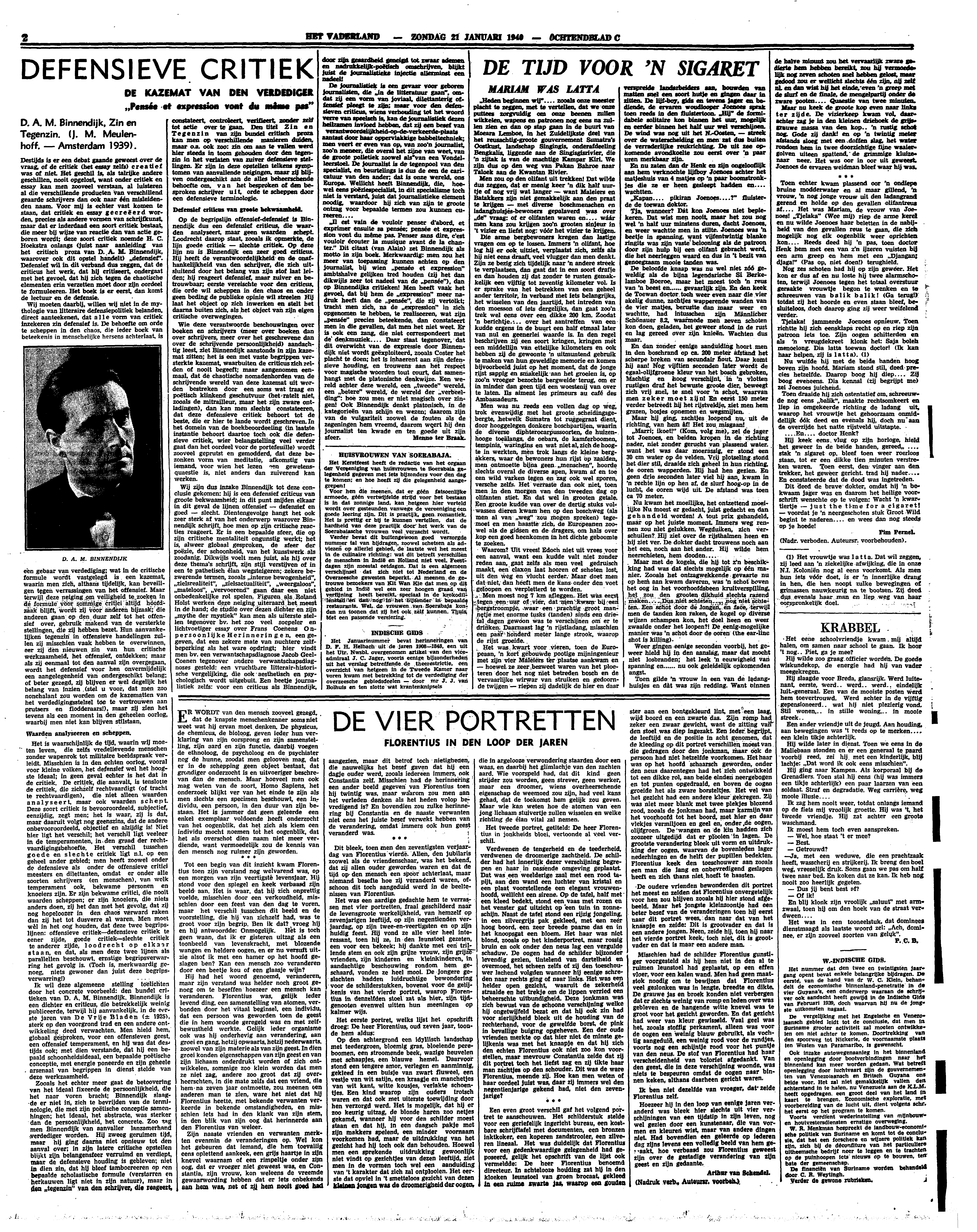 Destijds is er een debat gaande geweest over de vraag, of de critiek (het essay zelfs) creatief was of niet. Het geschil is, als talrijke andere geschillen, nooit opgelost, want onder critiek en essay kan men zooveel verstaan, al luisteren al die verschillende producten van verschillend geaarde schrijvers dan ook naar één misleidenden naam. Voor mij is echter vast komen te staan, dat critiek en essay gecreëerd worden, precies als andere vormen van schrijfkunst, maar dat er inderdaad een soort critiek bestaat, die meer bij wijze van reactie dan van actie geboren wordt; deze soort critiek noemde H.C. Hoekstra onlangs (juist naar aanleiding van het critisch proza van D.A.M. Binnendijk, waarover ook dit opstel handelt) ‘defensief’. Defensief wil in dit verband dus zeggen, dat de criticus het werk, dat hij critiseert, ondergaat met het gevoel, dat hij zich tegen de chaotische elementen erin verzetten moet door zijn oordeel te formuleeren. Het boek is er eerst, dan komt de lectuur en de defensie.