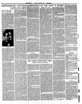 Wij zijn dus inzake Binnendijk tot deze conclusie gekomen: hij is een defensief criticus van groote bekwaamheid; in dit punt snijden elkaar in dit geval de lijnen offensief - defensief en goed - slecht. Dientengevolge hangt het ook zeer sterk af van het onderwerp waarover Binnendijk schrijft, hoe men op zijn critische reacties reageert. Er is een bepaalde sfeer, die op zijn critische mentaliteit ongunstig werkt; het is, alweer globaal gesproken, de sfeer der poëzie, der schoonheid, van het kunstwerk als zoodanig. Dikwijls voelt men juist, als hij over deze thema's schrijft, zijn stijl verstijven of in een te pathetisch élan wegsteigeren; zekere bezwerende termen, zooals ‘interne bewogenheid’, ‘zielsrealiteit’, ‘zielsactualiteit’, ‘weergaloos’, ‘mateloos’, ‘vervoerend’ gaan daar een niet onbedenkelijke rol spelen. Figuren als Roland Holst werken deze neiging uiteraard het meest in de hand; de studie over dezen dichter en zijn ‘mythe der mystiek’ kan men als uiterste stellen tegenover bv. het zoo veel soepeler en lichtvoetiger essay over Frans Coenens Onpersoonlijke Herinneringen, een gegeven, dat een zekere mate van nuchtere zelfbeperking als het ware opdringt; hier vindt men bv. een verwantschapsdiagnose Jacob Geel-Coenen tegenover andere verwantschapsdiagnoses gesteld: een vruchtbare litterair-historische vergelijking, die ook aesthetisch en psychologisch wordt uitgebuit. Een beetje journalistiek zelfs: voor een criticus als Binnendijk, door zijn geaardheid geneigd tot zwaar ademen en nadrukkelijk-poëtisch omschrijven, blijkt juist de journalistieke injectie allerminst een nadeel!