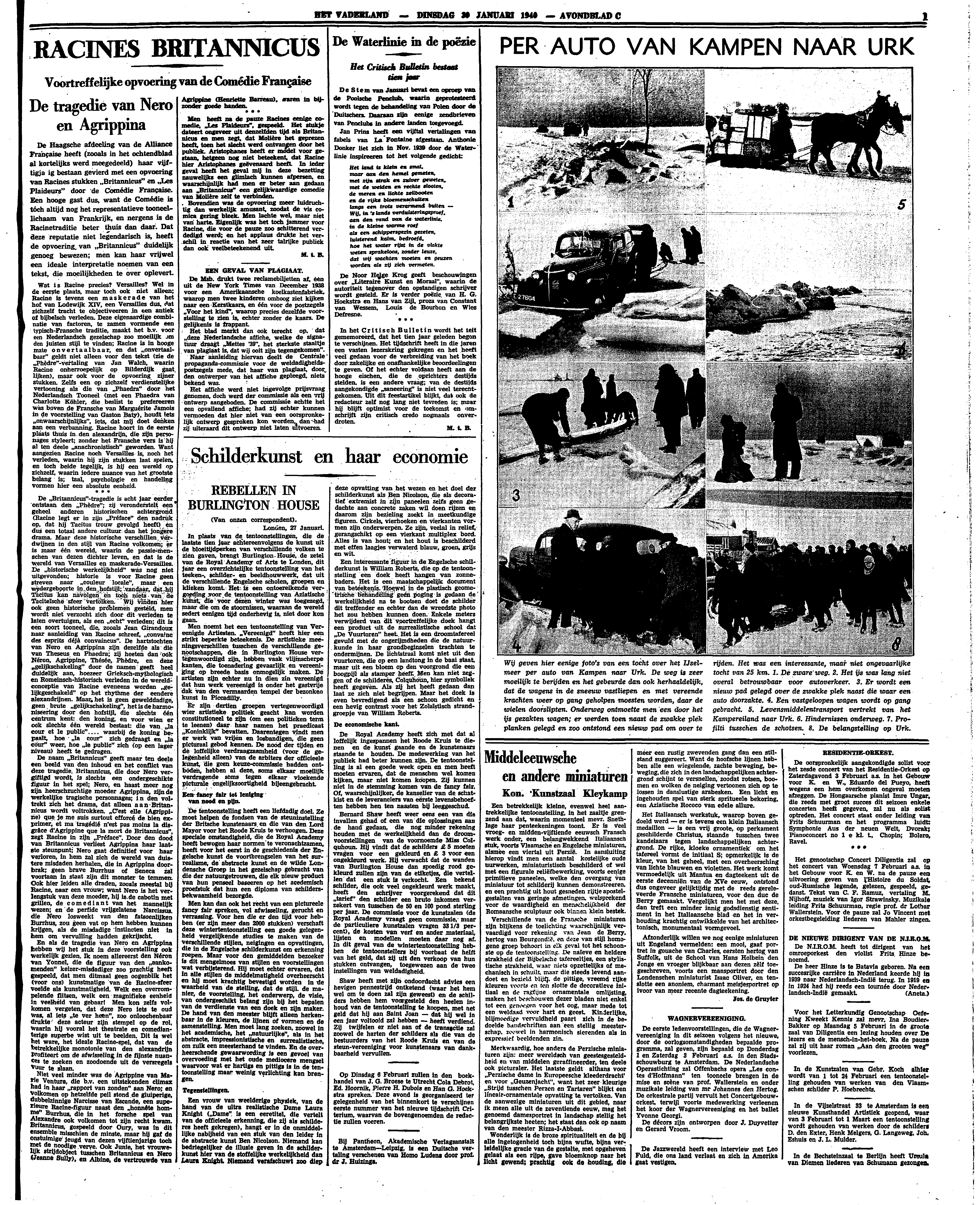 De Haagsche afdeeling van de Alliance Française heeft (zooals in het ochtendblad al kortelijks werd meegedeeld) haar vijftigja ig bestaan gevierd met een opvoering van Racines stukken ‘Britannicus’ en ‘Les Plaideurs’ door de Comédie Française. Een hooge gast dus, want de Comédie is tóch altijd nog het representatieve tooneellichaam van Frankrijk, en nergens is de Racinetraditie beter thuis dan daar. Dat deze reputatie niet legendarisch is, heeft de opvoering van ‘Britannicus’ duidelijk genoeg bewezen; men kan haar vrijwel een ideale interpretatie noemen van een tekst, die moeilijkheden te over oplevert.