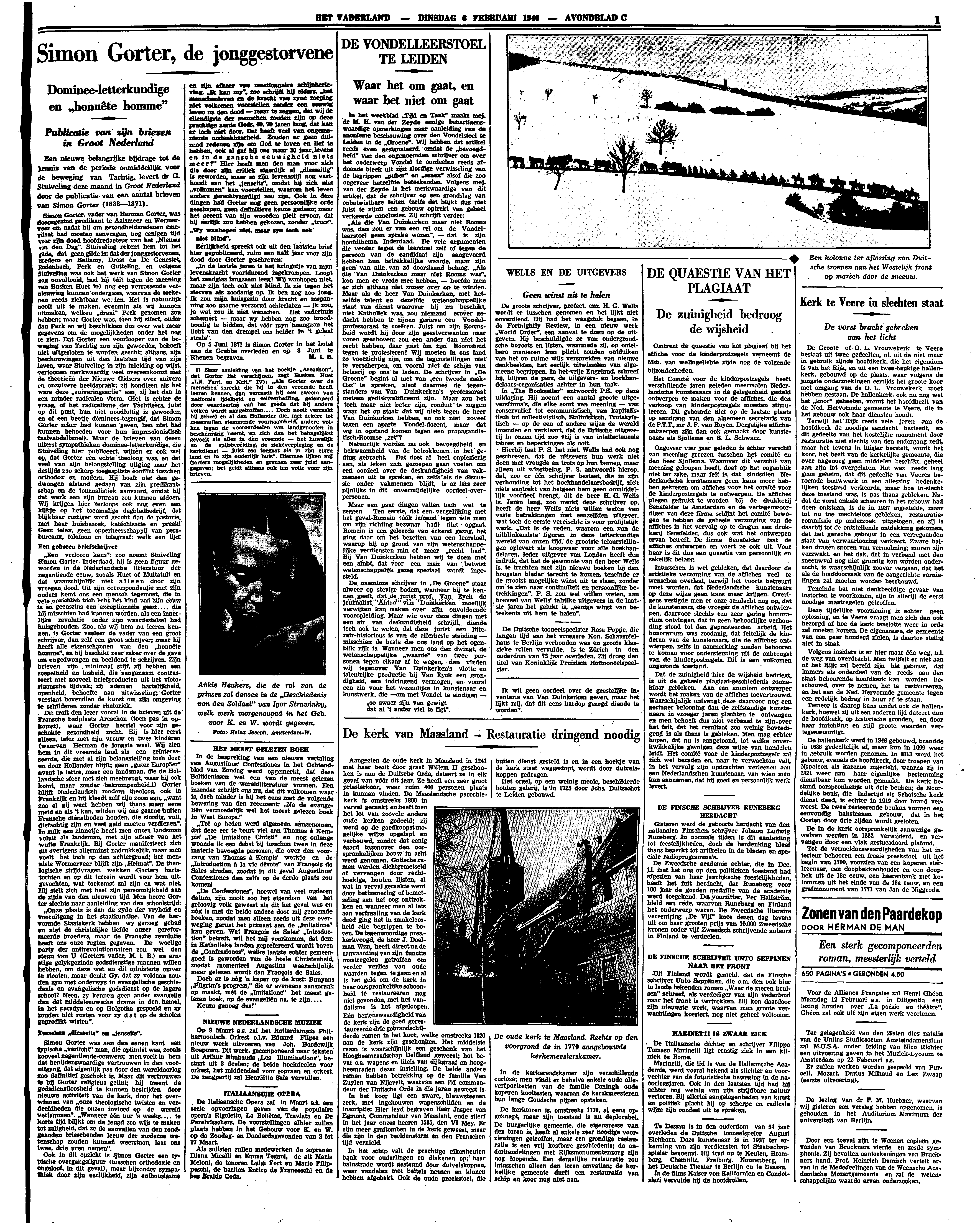Simon Gorter, vader van Herman Gorter, was doopsgezind predikant te Aalsmeer en Wormerveer en, nadat hij om gezondheidsredenen emeritaat had moeten aanvragen, nog eenigen tijd voor zijn dood hoofdredacteur van het ‘Nieuws van den Dag’. Stuiveling rekent hem tot het gilde, dat geen gilde is: dat der jonggestorvenen. Bredero en Bellamy. Drost en De Genestet, Rodenbach, Perk en Gutteling, en volgens Stuiveling was ook het werk van Simon Gorter nog onvoltooid, had hij (dit tegen de meening van Busken Huet in) nog een verrassende vernieuwing kunnen ondergaan, waarvan de teekenen reeds zichtbaar werden. Het is natuurlijk nooit uit te maken, evenmin als wij kunnen uitmaken, welken ‘draai’ Perk genomen zou hebben; maar Gorter was, toen hij stierf, ouder dan Perk en wij beschikken dus over wat meer gegevens om de mogelijkheden onder het oog te zien. Dat Gorter een voorlooper van de beweging van Tachtig zou zijn geworden, behoeft niet uitgesloten te worden geacht; althans, zijn beschouwingen uit den laatsten tijd van zijn leven, waar Stuiveling in zijn inleiding op wijst, vertoonen merkwaardig veel overeenkomst met de theorieën der Nieuwe Gidsers over zuivere en onzuivere beeldspraak; zij kondigen als het ware deze ‘zuiveringsactie’ aan, zij het dan in een minder radicalen vorm. (Het is echter de vraag, of het radicalisme der Tachtigers, juist op dit punt, hun niet noodlottig is geworden, en of een beetje dominees-tegengif, dat Simon Gorter zeker had kunnen geven, hen niet had kunnen behoeden voor hun impressionistisch taalvandalisme!). Maar de brieven van dezen uiterst sympathieken dominee-letterkundige, die Stuiveling hier publiceert, wijzen er ook wel op, dat Gorter een echte theoloog was, en dat veel van zijn belangstelling uitging naar het destijds zoo scherp toegespitste conflict tusschen orthodox en modern. Hij heeft niet dan gedwongen afstand gedaan van zijn predikantschap en de journalistiek aanvaard, omdat hij dat werk aan zijn bureau zou kunnen afdoen. Wij krijgen hier terloops ook nog even een kijkje op het toenmalige dagbladbedrijf, dat blijkbaar rustiger werd geacht dan de pastorie, met haar huisbezoek, katéchisatie en preek! Geen telex, geen opperheerschappij van persbureaux, telefoon en telegraaf: welk een tijd!