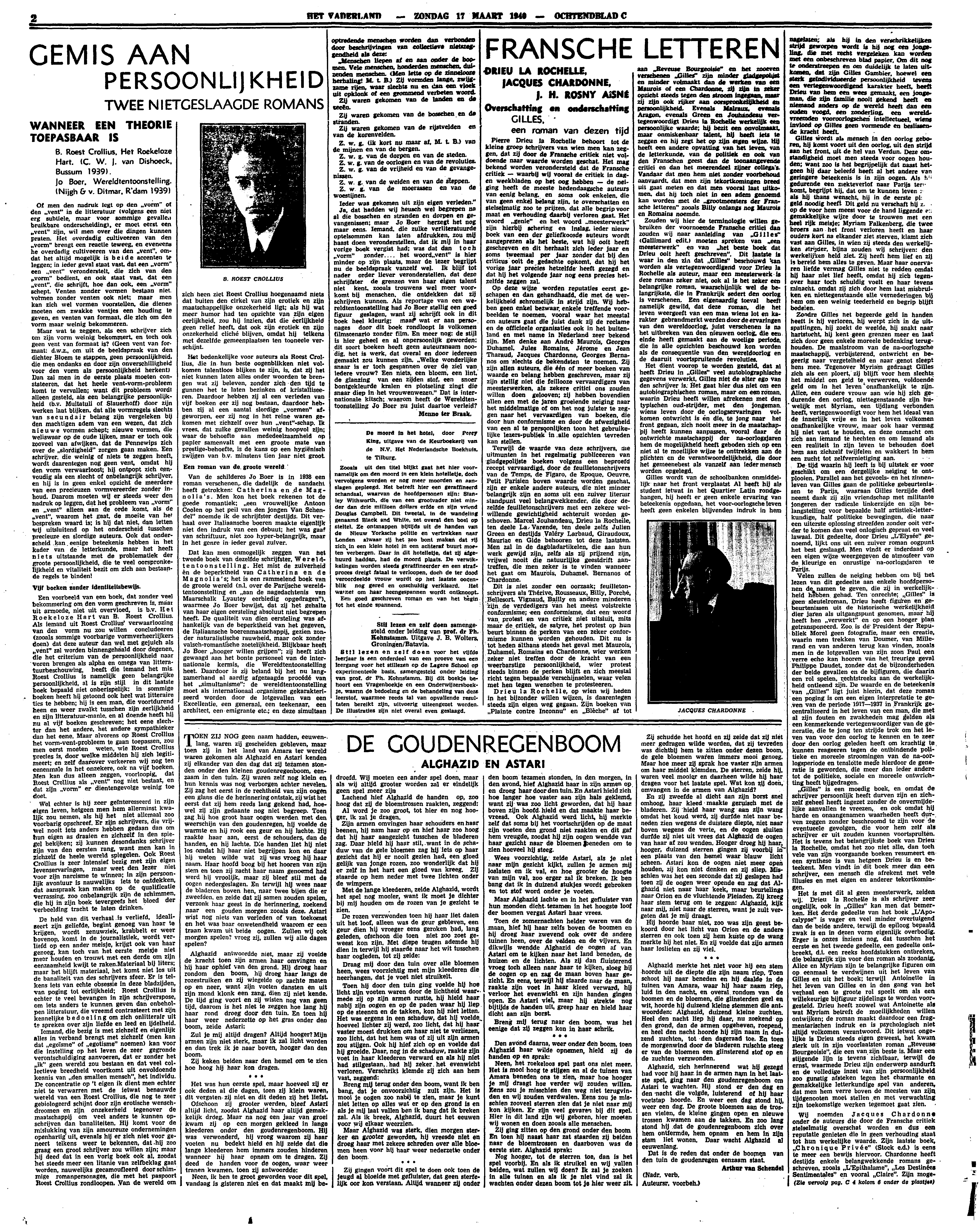 Iemand, die bezig is met zichzelf en eigenlijk alles in verband brengt met zichzelf (men kan dat ‘egoïsme’ of ‘egotisme’ noemen) kan voor die instelling op het leven de zeer gegronde verontschuldiging aanvoeren, dat er zonder het ‘ik’ geen wereld zou bestaan en dat veel collectieve breedheid voortkomt uit onvoldoende kennis van ‘den smallen mensch’, het individu. De concentratie op 't eigen ik dient men echter niet te verwarren met de ietwat benauwde wereld van een Roest Crollius, die nog te zeer gebiologeerd schijnt door zijn erotische wenschdroomen en zijn onzekerheid tegenover de maatschappij om veel anders te kunnen opschrijven dan banaliteiten. Hij komt voor de mislukking van zijn amoureuze ondernemingen openhartig uit, evenals hij er zich niet voor geneert telkens weer te bekennen, dat hij zoo graag een groot schrijver zou willen zijn; maar hij deed dat in een vorig boek ook al, zoodat het steeds meer een litanie van zelfbeklag gaat worden, nauwelijks gecamoufleerd door schimmige romanpersonages, die met het paspoort Roest Crollius rondloopen. Van de wereld om zich heen ziet Roest Crollius hoegenaamd niets dat buiten den cirkel van zijn erotiek en zijn maatschappelijke onzekerheid ligt; als hij wat meer humor had ten opzichte van zijn eigen eerlijkheid, zou hij inzien, dat die eerlijkheid geen relief heeft, dat ook zijn erotiek en zijn onzekerheid cliché blijven, omdat hij telkens met dezelfde gemeenplaatsen ten tooneele verschijnt.