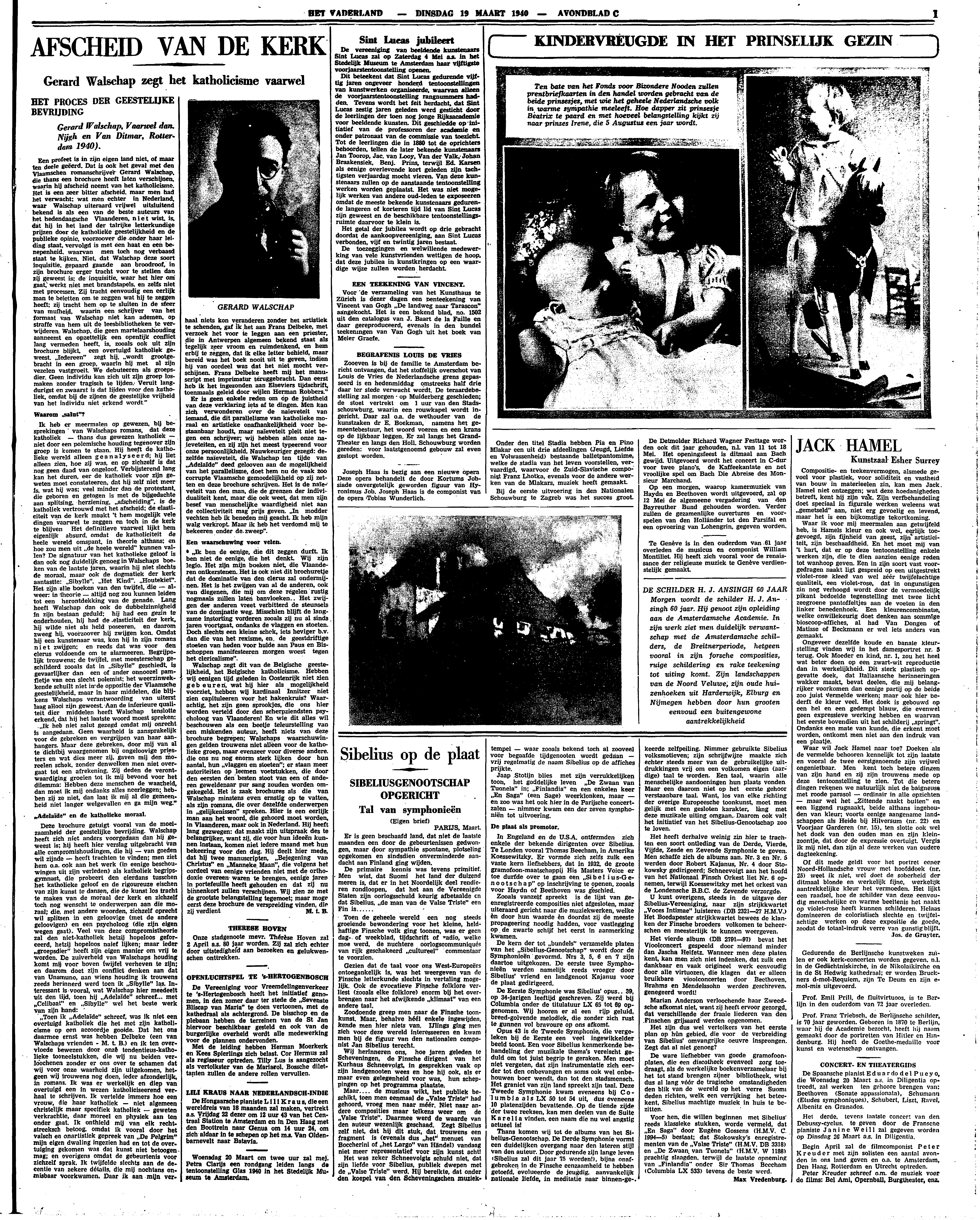Een profeet is in zijn eigen land niet, of maar ten deele geëerd. Dat is ook het geval met den Vlaamschen romanschrijver Gerard Walschap, die thans een brochure heeft laten verschijnen, waarin hij afscheid neemt van het katholicisme. Het is een zeer bitter afscheid, maar men had het verwacht: wat men echter in Nederland, waar Walschap uiteraard vrijwel uitsluitend bekend is als een van de beste auteurs van het hedendaagsche Vlaanderen, niet wist is, dat hij in het land der talrijke letterkundige prijzen door de katholieke geestelijkheid en de publieke opinie, voorzoover die onder haar leiding staat, vervolgd is met een haat en een benepenheid, waarvan men toch nog verbaasd staat te kijken. Niet, dat Walschap deze soort inquisitie, gepaard gaande aan broodroof, in zijn brochure erger tracht voor te stellen dan zij geweest is; de inquisitie, waar het hier om gaat, werkt niet met brandstapels, en zelfs niet met processen. Zij tracht eenvoudig een eerlijk man te beletten om te zeggen wat hij te zeggen heeft; zij tracht hem op te sluiten in de sfeer van mufheid, waarin een schrijver van het formaat van Walschap niet kan ademen, op straffe van hem uit de leesbibliotheken te verwijderen. Walschap, die geen martelaarshouding aanneemt en opzettelijk een openlijk conflict lang vermeden heeft, is, zooals ook uit zijn brochure blijkt, een overtuigd katholiek geweest. ‘Iedereen’ zegt hij, ‘wordt grootgebracht in een groep, waarin hij met al zijn vezelen vastgroeit. We debuteeren als groepsdier. Geen individu kan zich uit zijn groep losmaken zonder tragisch te lijden. Veruit langdurigst en zwaarst is dat lijden voor den katholiek, omdat bij de zijnen de geestelijke vrijheid van het individu niet erkend wordt.’