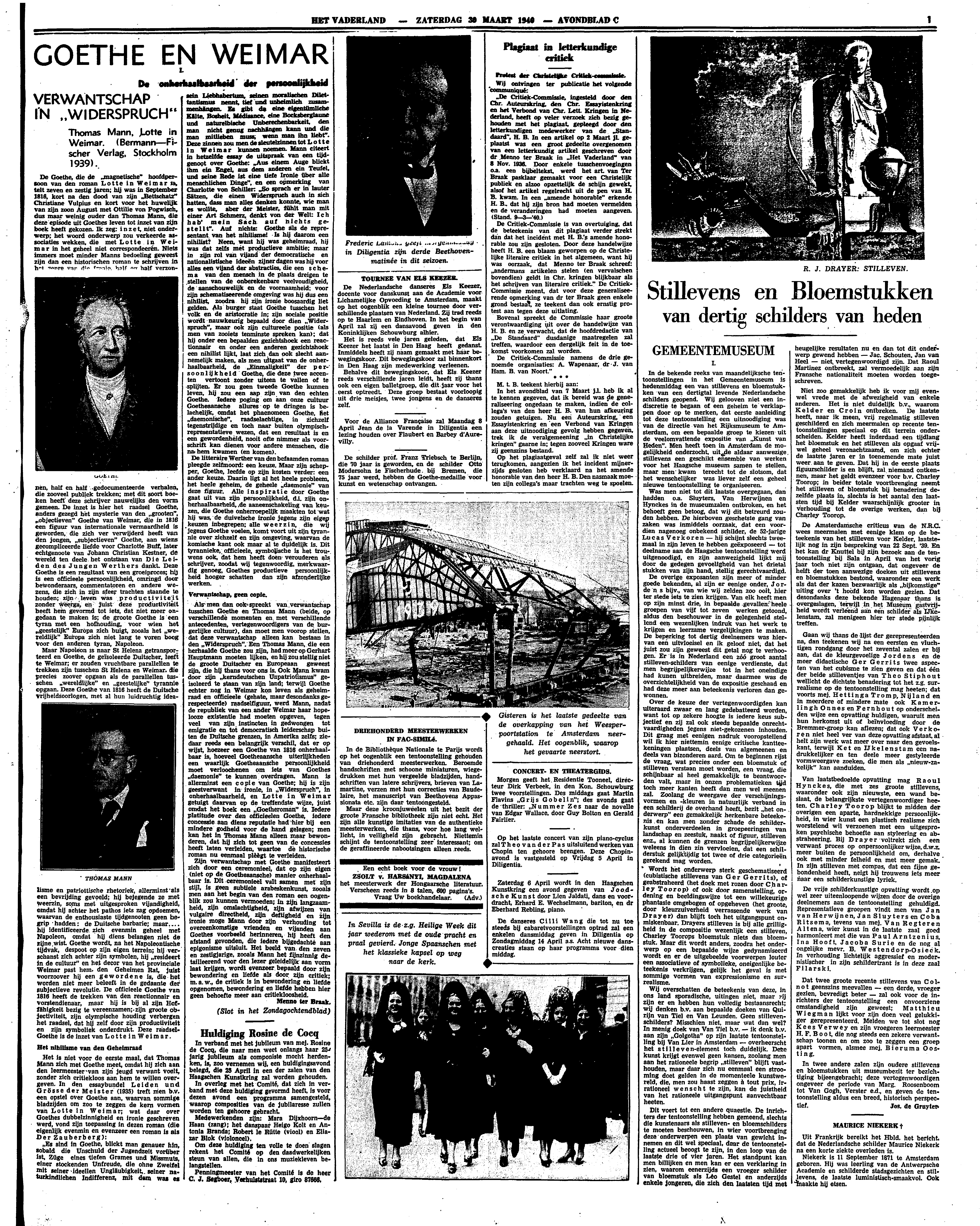 De Goethe, die de ‘magnetische’ hoofdpersoon van den roman Lotte in Weimar is, telt zeven en zestig jaren; hij was in September 1816, kort na den dood van zijn ‘Bettschatz’ Christiane Vulpius en kort voor het huwelijk van zijn zoon August met Ottilie von Pogwisch, dus maar weinig ouder dan Thomas Mann, die deze episode uit Goethes leven tot inzet van zijn boek heeft gekozen. Ik zeg: inzet, niet onderwerp; het woord onderwerp zou verkeerde associaties wekken, die met Lotte in Weimar in het geheel niet correspondeeren. Niets immers moet minder Manns bedoeling geweest zijn dan een historischen roman te schrijven in het genre van die fraaie, half en half verzonnen, half en half gedocumenteerde verhalen, die zooveel publiek trekken; met dit soort boeken heeft deze schrijver nauwelijks den vorm gemeen. De inzet is hier het raadsel Goethe, anders gezegd het mysterie van den ‘grooten’, ‘objectieven’ Goethe van Weimar, die in 1816 een figuur van internationale vermaardheid is geworden, die zich ver verwijderd heeft van den jongen, ‘subjectieven’ Goethe, aan wiens gecompliceerde liefde voor Charlotte Buff, later echtgenoote van Johann Christian Kestner, de wereld ten deele het ontstaan van Die Leiden des Jungen Werthers dankt. Deze Goethe is een resultaat van een groeiproces; hij is een officieele persoonlijkheid, omringd door bewonderaars, commentatoren en andere wezens, die zich in zijn sfeer trachten staande te houden; zijn leven was productiviteit zonder weerga, en juist deze productiviteit heeft hem gevormd tot iets, dat niet meer ongedaan te maken is; de groote Goethe is een tyran met een hofhouding, voor wien het ‘geestelijk’ Europa zich buigt, zooals het ‘wereldlijk’ Europa zich niet lang te voren boog voor den anderen tyran, Napoleon.