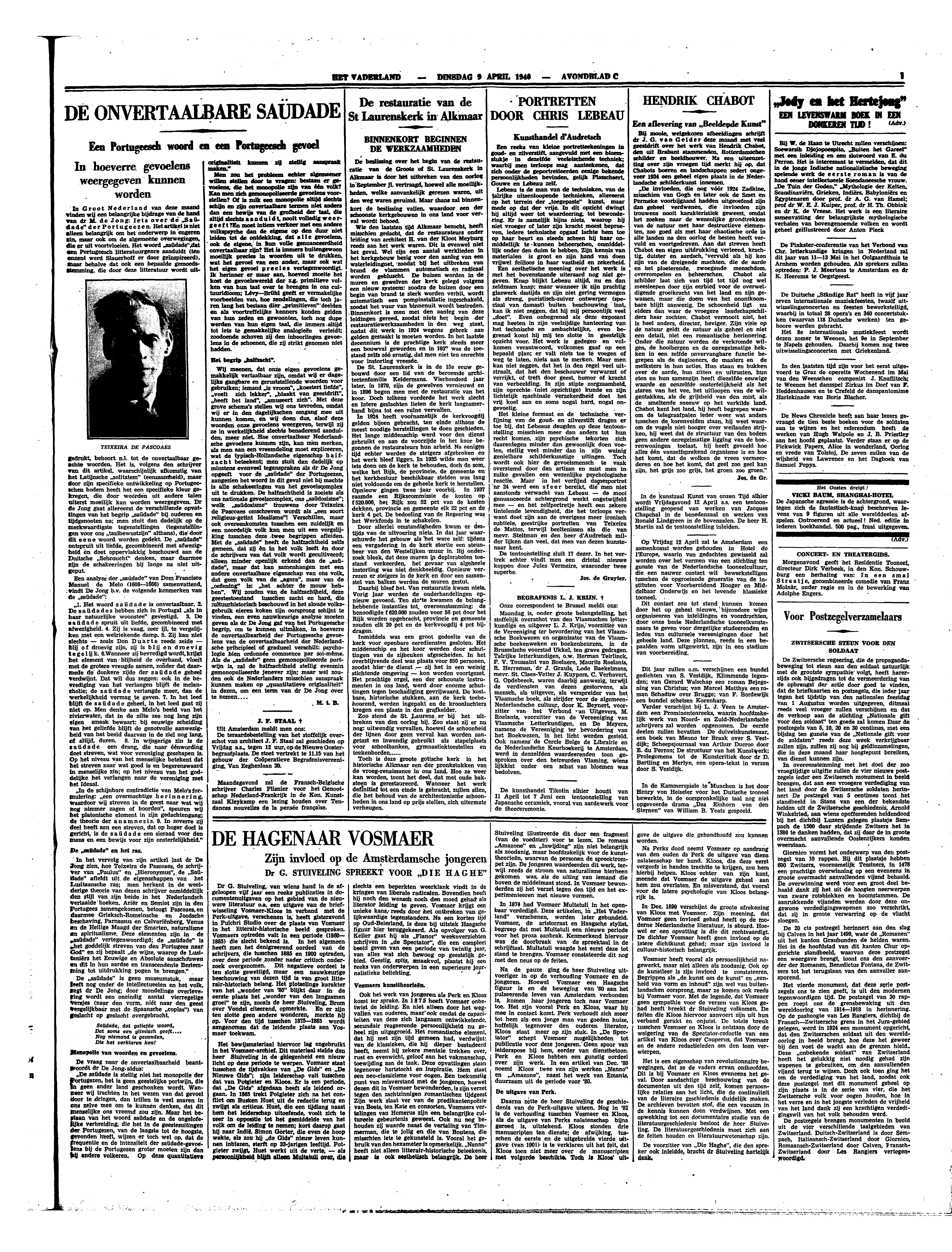 In het vervolg van zijn artikel laat dr De Jong zien, hoe Teixeira de Pascoaes, de schrijver van ‘Paulus’ en ‘Hieronymus’, de ‘Saüdade’ afleidt uit de eigenschappen van het Lusitaansche ras; men herkent in de weelderige theorie van dezen schrijver onmiddellijk den stijl van zijn beide in het Nederlandsch vertaalde boeken. Ariër en Semiet zijn in den Portugees samengekomen, betoogt Pascoaes, en daarmee Grieksch-Romeinsche en Joodsche beschaving, Parnassus en Calvariënberg, Venus en de Heilige Maagd der Smarten, naturalisme en spiritualisme. Deze elementen zijn in de ‘saüdade’ vertegenwoordigd; de ‘saüdade’ is ‘het goddelijk streven van den Portugees naar God’ en zij bepaalt ‘de wijze, waarop de Lusitaniërs het Eeuwige en Absolute aanschouwen en dit in hun aardse en transcendente Bestemming tot uitdrukking pogen te brengen.’