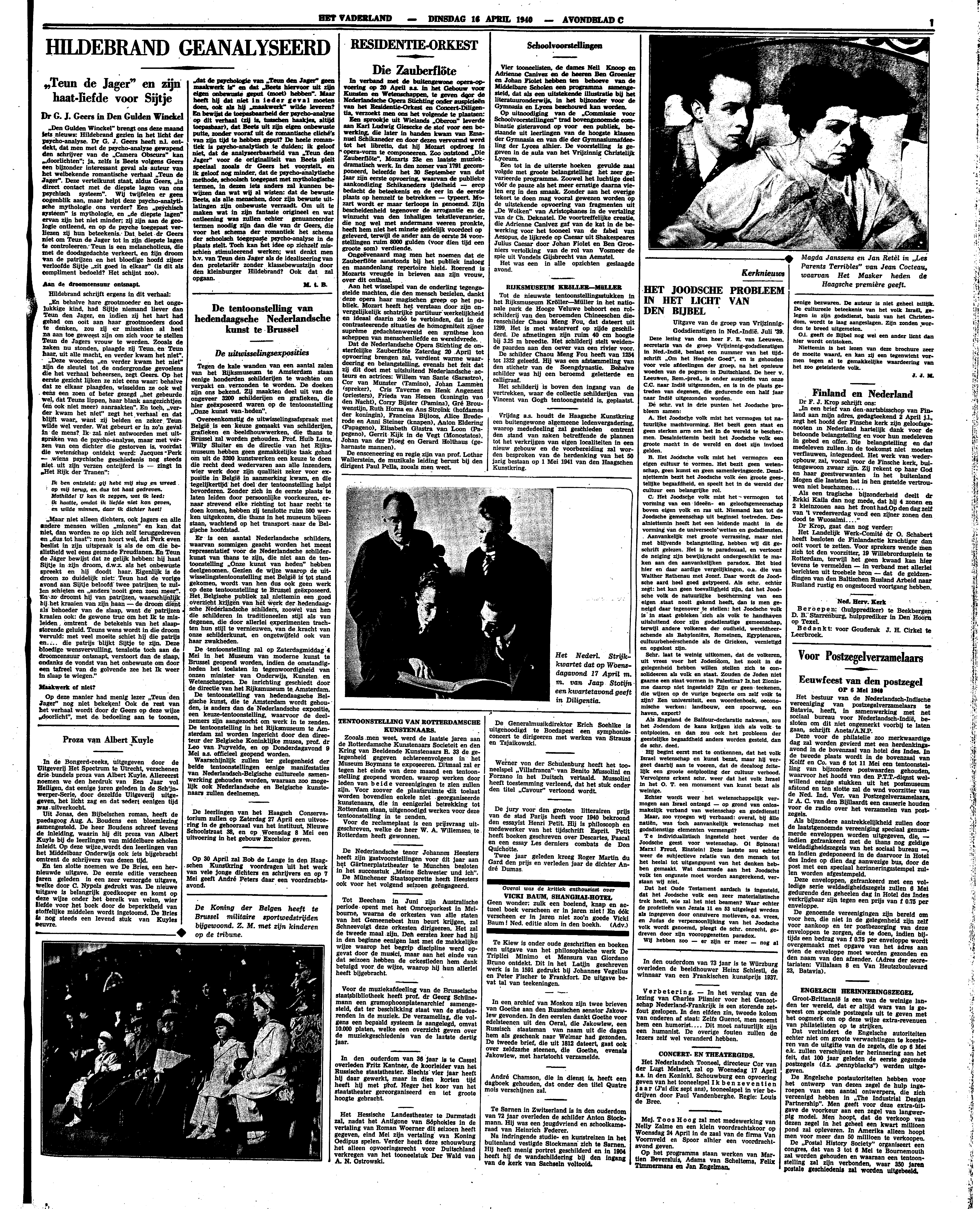 ‘Den Gulden Winckel’ brengt ons deze maand iets nieuws: Hildebrand gezien in het licht der psycho-analyse. Dr G.J. Geers heeft n.l. ontdekt, dat men met de psycho-analyse gewapend den schrijver van de ‘Camera Obscura’ kan ‘doorlichten’; ja, zelfs is Beets volgens Geers een bijzonder interessant geval als auteur van het welbekende romantische verhaal ‘Teun de Jager’. Deze vertelkunst staat, aldus Geers, ‘in direct contact met de diepste lagen van ons psychisch systeem’. Wij twijfelen er geen oogenblik aan, maar helpt deze psycho-analytische mythologie ons verder? Een ‘psychisch systeem’ is mythologie, en ‘de diepste lagen’ ervan zijn het niet minder; zij zijn aan de geologie ontleend, en op de psyche toegepast verliezen zij hun beteekenis. Dat belet dr Geers niet om Teun de Jager tot in zijn diepste lagen te controleeren. Teun is een melancholicus, die met de doodsgedachte verkeert, en zijn droom van de patrijzen en het bloedige hoofd zijner verloofde Sijtje ‘zit goed in elkaar’ (is dit als compliment bedoeld? Het schijnt zoo).