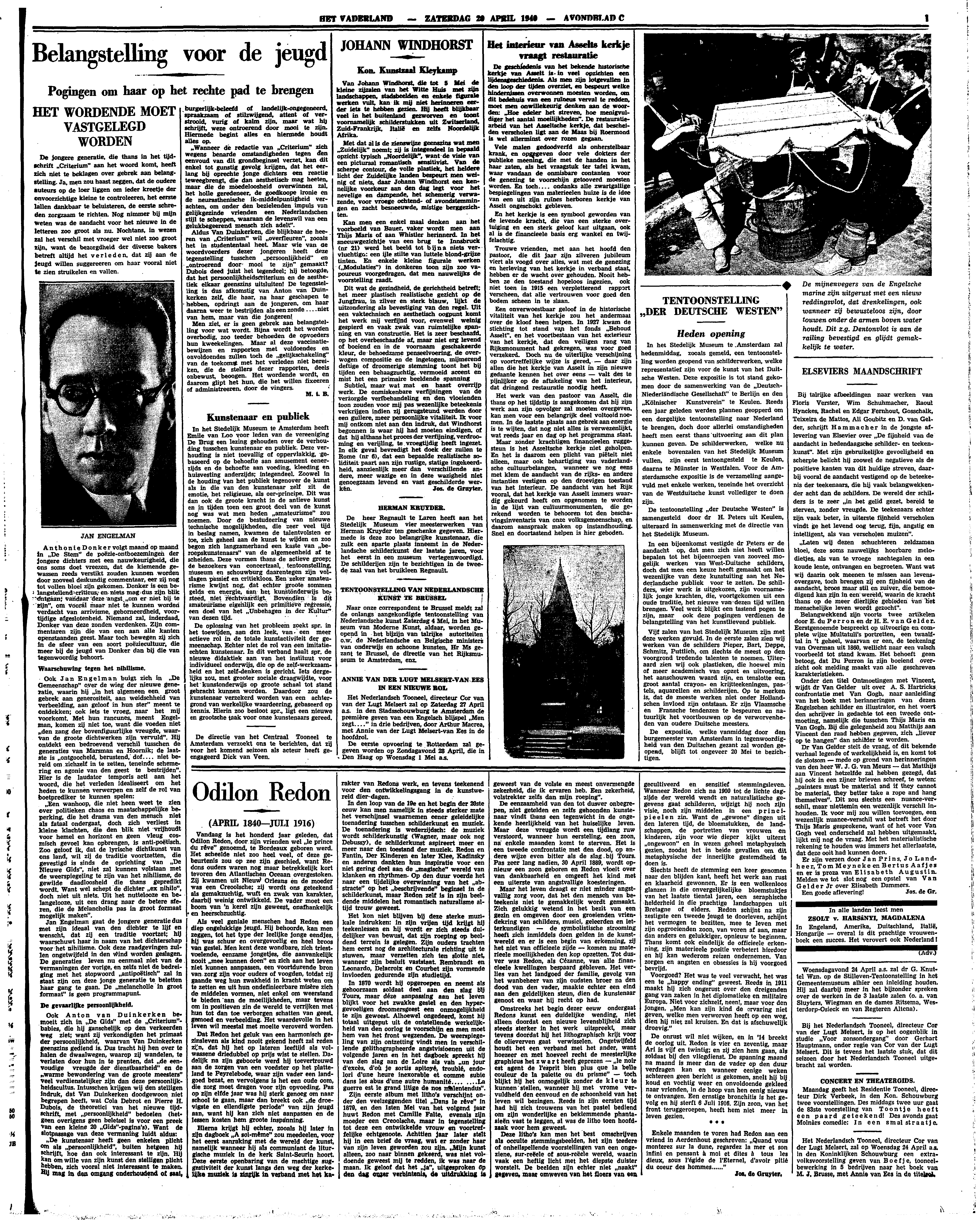 Jan Engelman gaat de jongere generatie dus met zijn ideaal van den dichter te lijf en wenscht, dat zij een traditie voortzet; hij waarschuwt haar in naam van het dichterschap voor het nihilisme. Ook deze raadgevingen zullen ongetwijfeld in den wind worden geslagen. De generaties leven nu eenmaal niet van de vermaningen der vorige, en zelfs niet de bedreiging met het stopwoord ‘antipoëtisch’ zal in staat zijn om deze jonge generatie te beletten haar gang te gaan. De ‘melancholie in groot formaat’ is geen programmapunt.
