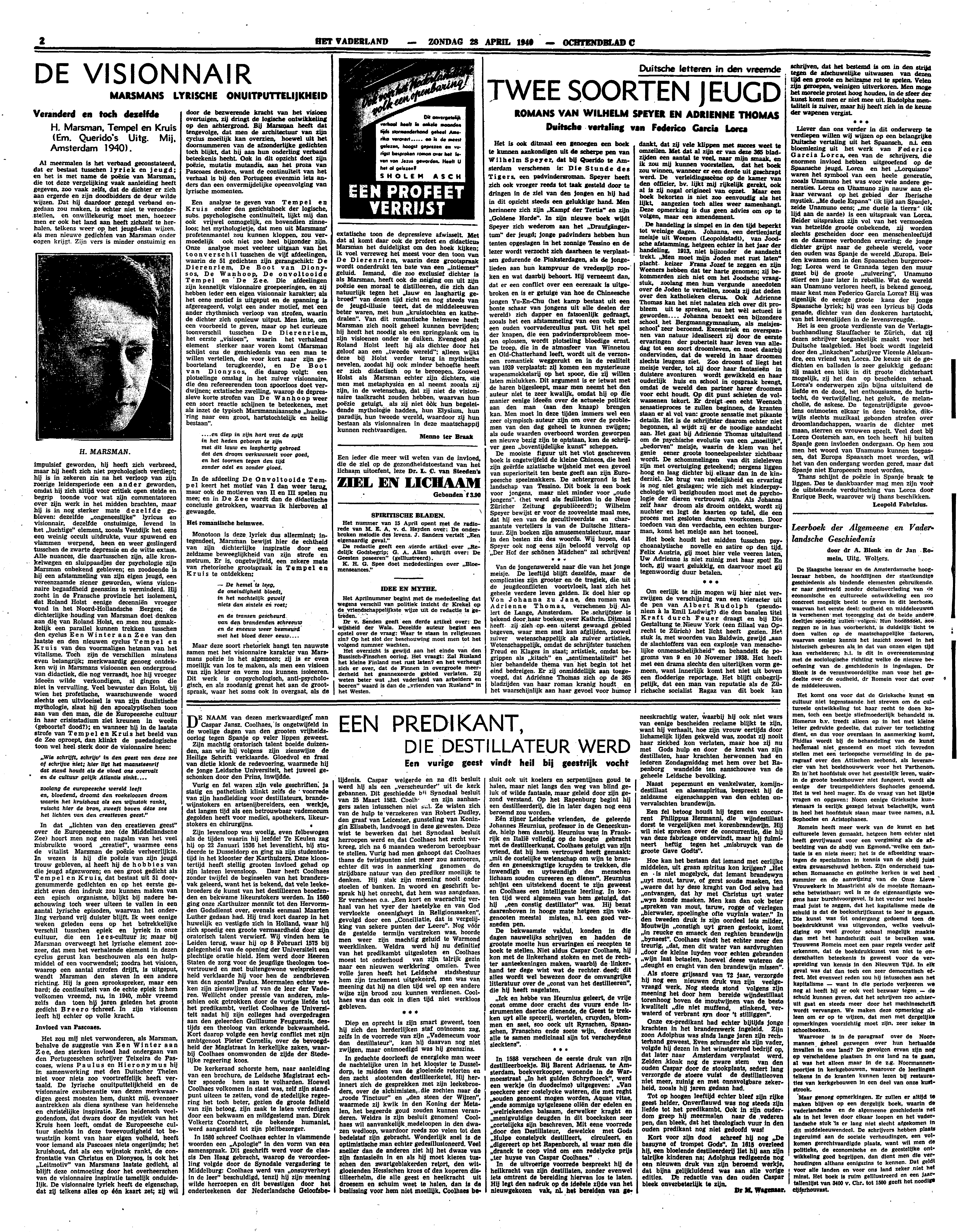 Al meermalen is het verband geconstateerd, dat er bestaat tusschen lyriek en jeugd; en het is met name de poëzie van Marsman, die tot deze vergelijking vaak aanleiding heeft gegeven, zoo vaak zelfs, dat de dichter er zich aan ergerde en zijn doodbidders de deur wilde wijzen. Dat hij daardoor gezegd verband ongedaan zou maken, is echter niet te veronderstellen, en onwillekeurig moet men, hoezeer men er ook het land aan heeft zichzelf te herhalen, telkens weer op het jeugd-élan wijzen, als men nieuwe gedichten van Marsman onder oogen krijgt. Zijn vers is minder onstuimig en impulsief geworden, hij heeft zich verbreed, maar hij heeft zich niet psychologisch verdiept; hij is in zekeren zin na het verloop van zijn roerige leidersperiode een ander geworden, omdat hij zich altijd voor critiek open stelde en begrip toonde voor wat zijn commentatoren over zijn werk in het midden brachten, maar hij is in nog sterker mate dezelfde gebleven: dezelfde ‘ongeneeslijke’ lyricus en visionnair, dezelfde onstuimige, levend in het ‘luchtige’ element, zooals Vestdijk het eens een weinig occult uitdrukte, vuur spuwend en vlammen werpend, heen en weer geslingerd tusschen de zwarte depressie en de witte extase. Alle nuances, die daartusschen zijn, alle kronkelwegen en sluippaadjes der psychologie zijn Marsman onbekend gebleven; en zoodoende is hij een afstammeling van zijn eigen jeugd, een vereenzaamde ziener geworden, wiens visionnaire begaafdheid geenszins is verminderd. Hij zocht in de Fransche provincie het isolement, dat Roland Holst eenige decenniën vroeger vond in het Noord-Hollandsche Bergen; de dichterlijke houding van Marsman doet denken aan die van Roland Holst, en men zou gemakkelijk een parallel kunnen trekken tusschen den cyclus Een Winter aan Zee van den laatste en den nieuwen cyclus Tempel en Kruis van den voormaligen hetman van het vitalisme. Toch zijn de verschillen minstens even belangrijk; merkwaardig genoeg ontdekken wij in Marsmans visioenen een ondergrond van didactiek, die nog verraadt, hoe hij vroeger ideeën wilde verkondigen, al gingen die niet in vervulling. Veel bewuster dan Holst, bij wien het profetische, waarschuwende woord slechts een uitvloeisel is van zijn dualistische mythologie, slaat hij den apocalyptischen toon aan van den man, die de Europeesche cultuur in haar crisisstadium ziet kreunen in weeën (geboorte? dood?); en wanneer hij in de laatste strofe van Tempel en Kruis het beeld van de Zee oproept, dan klinkt de paedadogische toon wel heel sterk door de visionnaire heen: