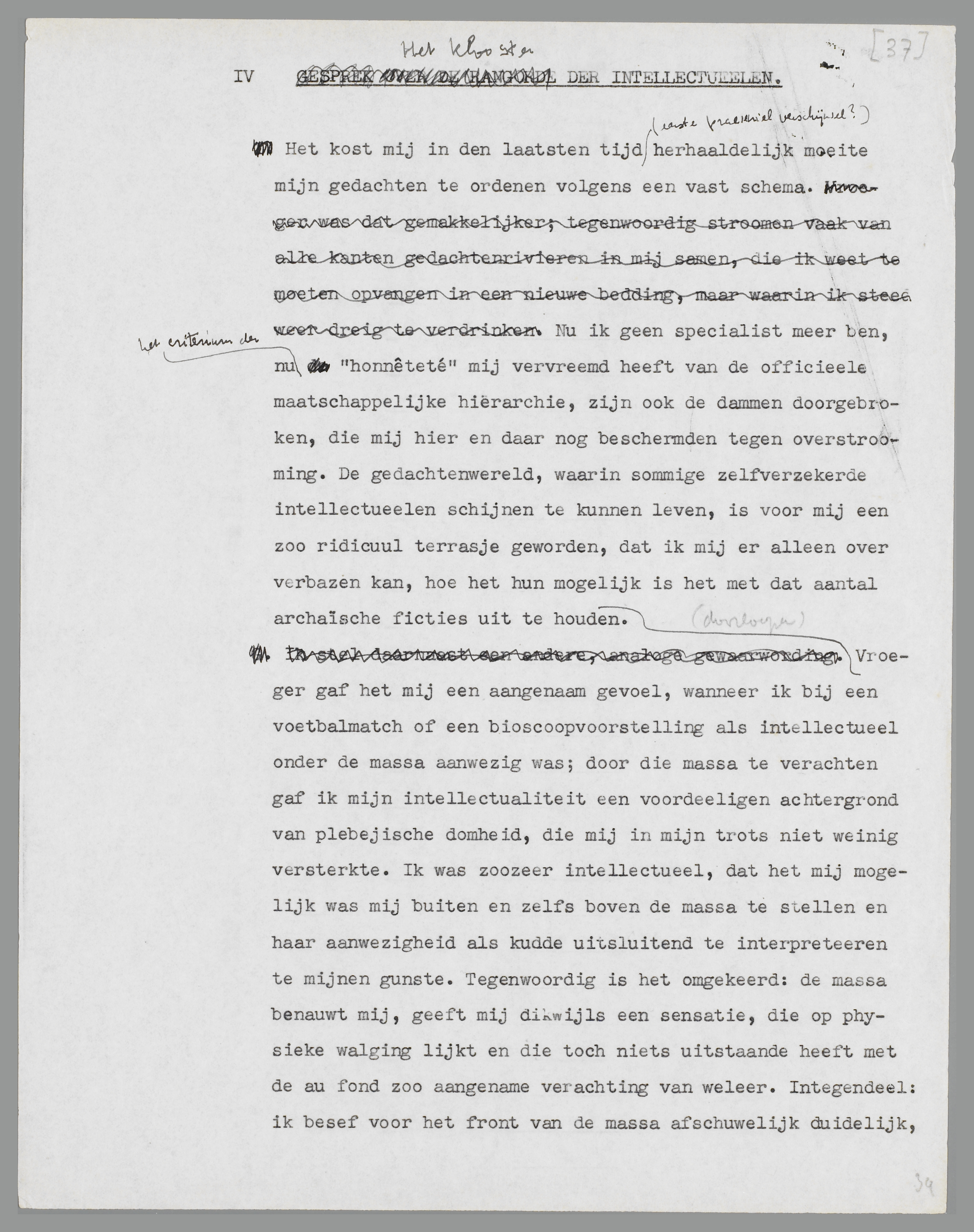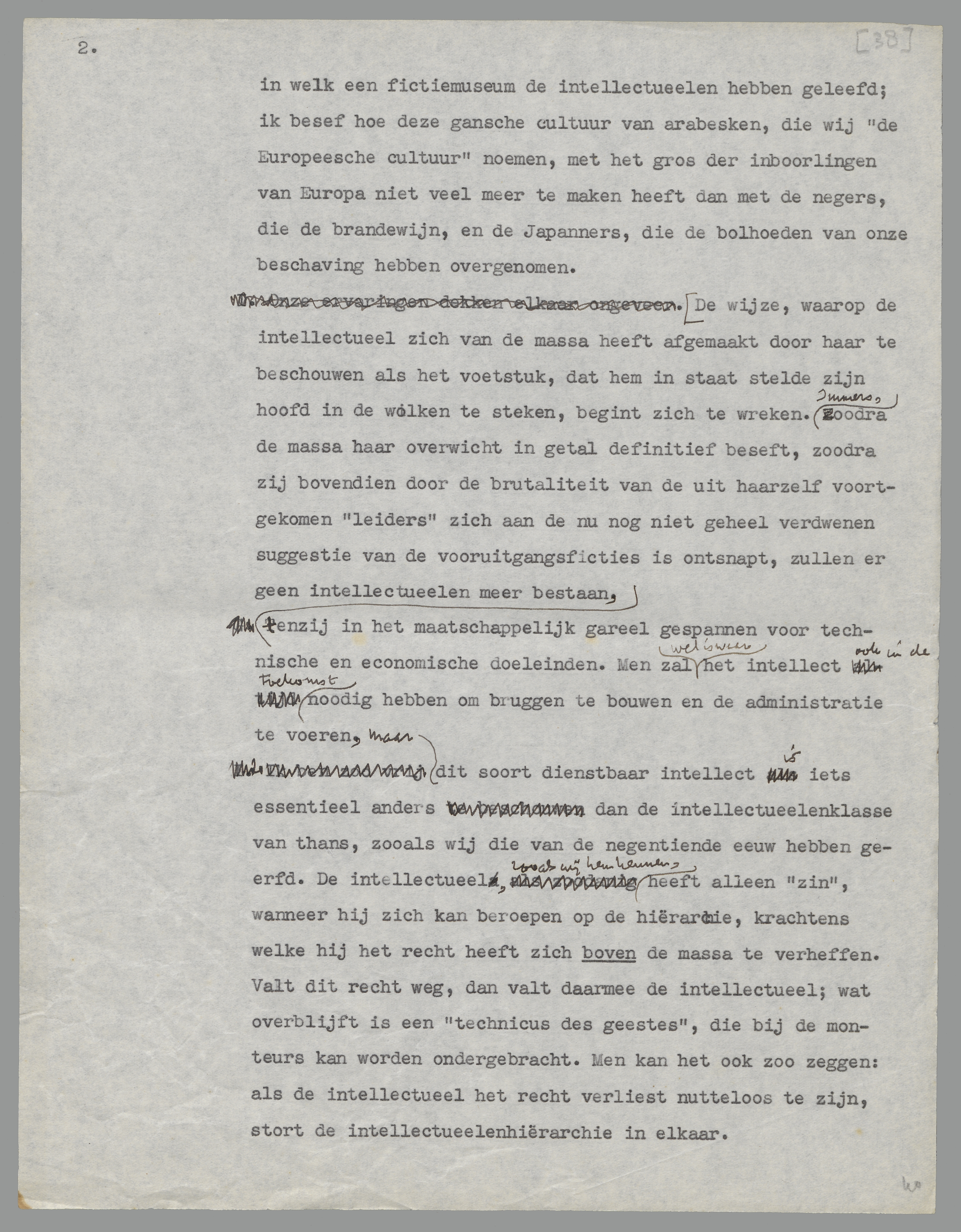 voetbalmatch of een bioscoopvoorstelling als intellectueel onder een ‘massa’ aanwezig te zijn; door die ‘massa’ tegenover mij te weten (hetgeen ongeveer, zij het dan ook niet precies, wil zeggen: door die ‘massa’ te verachten) gaf ik mijn intellectualiteit een voordeeligen achtergrond van plebejische domheid, die mij in mijn trots niet weinig versterkte. Ik was zoozeer intellectueel, dat het mij mogelijk was mij buiten en zelfs boven de ‘massa’ te stellen en haar aanwezigheid uitsluitend te interpreteeren te mijnen gunste; dit soort perspectief is zeker de grootste bron van vitaliteit geweest voor de intellectueelen der vorige eeuw, die, hetzij als positivisten, hetzij als negativisten, veroveringen moesten maken en daarvoor inboorlingen noodig hadden, waarop zij met een gerust gemoed konden neerzien, die aanwezig waren en in ‘hoogeren zin’ toch niet aanwezig, of alleen als getal. Die illusie verdampte, en ik ervaar dit: nu die ‘massa’ geen stomme figurant meer is, maar na een eeuw socialisme en fascisme in alle cultuuraangelegenheden is gemengd, is de benauwing, die zij veroorzaakt, een symptoom, dat mij veel meer in beslag neemt dan de au fond zoo aangename verachting van weleer. Men beseft voor het front der ‘massa’ afschuwelijk duidelijk, in welk fictiemuseum de intellectueelen hebben geleefd, en hoe deze gansche cultuur van arabesken, die wij ‘de europeesche cultuur’ noemen, met het gros der inboorlingen van Europa niet veel meer te maken heeft dan met de negers, die den brandewijn, en de Japanners, die de
