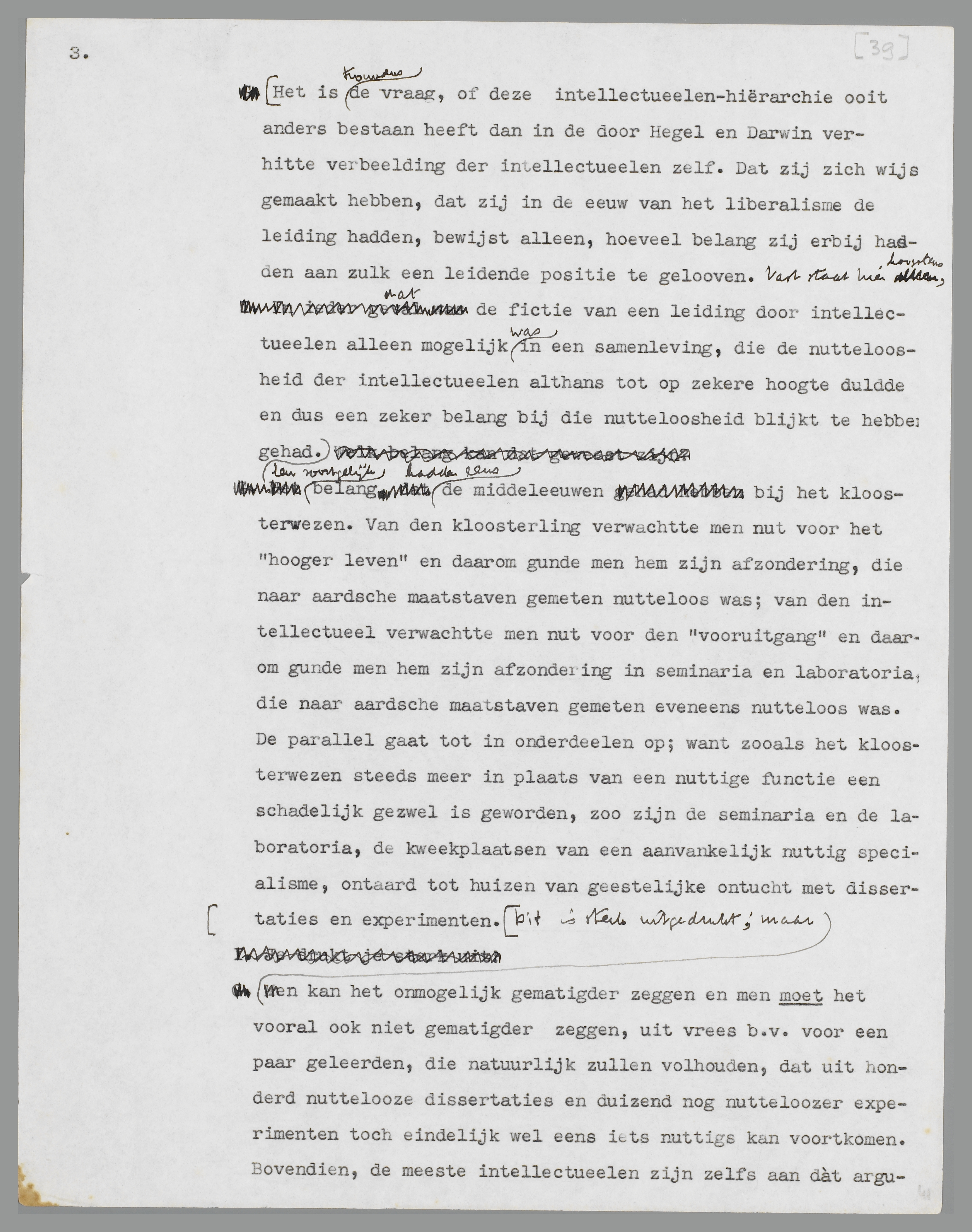 Het is trouwens de vraag (het historisch-materialisme heeft die vraag met een ander accent gesteld), of deze intellectueelen-hiërarchie ooit anders bestaan heeft dan in de door Hegel en Darwin verhitte verbeelding der intellectueelen zelf. Dat zij zich wijs gemaakt hebben, dat zij in de eeuw van het liberalisme de leiding namen, bewijst alleen, hoeveel belang zij er bij hadden aan zulk een leidende positie te gelooven. Vast staat hier hoogstens, dat de fictie van een leiding door intellectueelen alleen mogelijk was in een samenleving, die de nutteloosheid der intellectueelen tot op zekere hoogte duldde en dus op haar beurt een zeker belang bij die nutteloosheid blijkt te hebben gehad. Een soortgelijk belang hadden de middeleeuwen bij het kloosterwezen. Van den kloosterling verwachtte men nut voor het ‘hooger leven’ en daarom gunde men hem zijn afzondering, ook als die naar aardsche maatstaven gemeten nutteloos was; van den intellectueel verwachtte men nut voor den vooruitgang (den hemel, het ‘hooger leven’ bij uitstek van de negentiende eeuw!) en daarom gunde men hem zijn afzondering in seminaria en laboratoria, die naar aardsche maatstaven gemeten in veel opzichten eveneens nutteloos was. De parallel gaat tot in onderdeelen op; want zooals het kloosterwezen steeds meer in plaats van een als nuttig erkende functie een romantisch en zelfs schadelijk gezwel is geworden, zoo zijn de seminaria en laboratoria, de kweekplaatsen