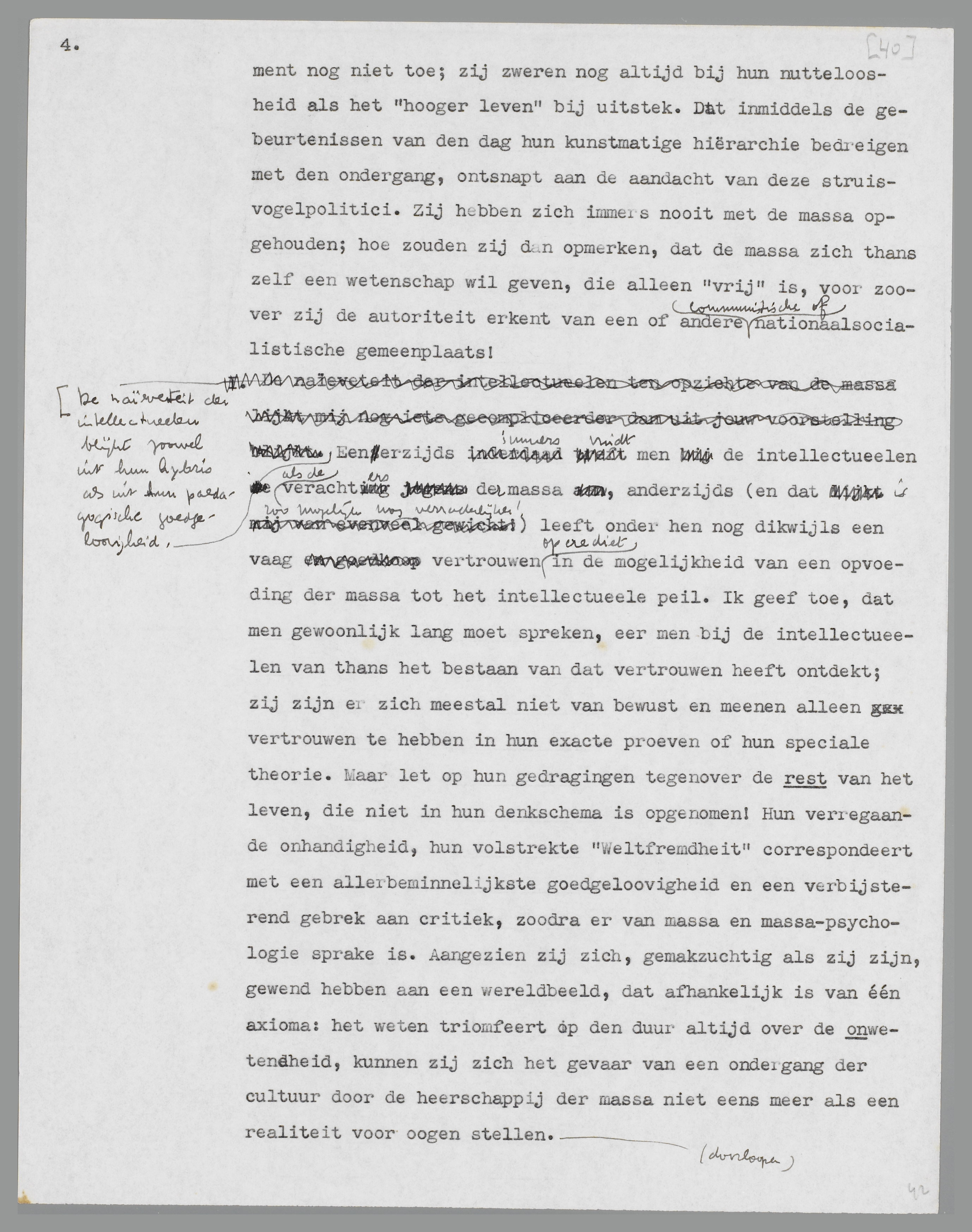 De naïveteit der intellectueelen blijkt zoowel uit hun hybris als uit hun paedagogische goedgeloovigheid. Eenerzijds immers vindt men de intellectueelen opgesteld als de verachters der ‘massa’, anderzijds (en dat is veel verraderlijker) leeft onder hen nog een vaag vertrouwen-op-crediet in de mogelijkheid van een opvoeding der ‘massa’ tot hun intellectueele peil. Ik geef toe, dat men soms lang moet spreken, eer men bij een wetenschapsmensch van thans het
