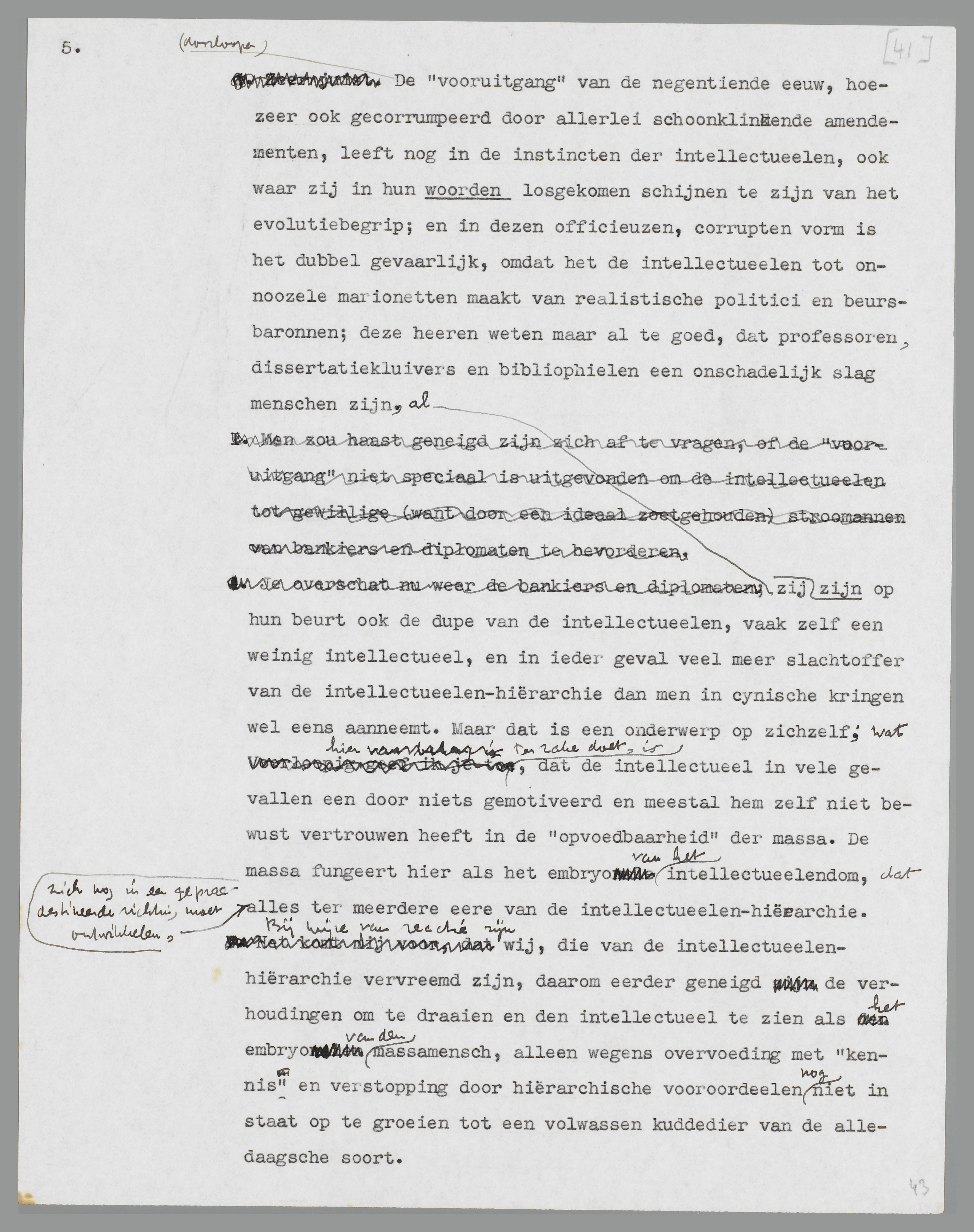 ‘massa’ zonder hun werkzaamheden niet leven kon. De massa fungeert in hun wereld als het embryo van het intellectueel volwassen wezen, dat zich nog in een gepredestineerde richting moet ontwikkelen, alles ter meerdere eere van de intellectueelen-hiërarchie. Bij wijze van reactie zijn wij, die van de intellectueelen-hiërarchie vervreemd zijn, daarom eerder geneigd de verhoudingen om te draaien en den intellectueel te zien als het embryo van den volmaakten massamensen, alleen wegens overvoeding met ‘kennis’ en verstopping door hiërarchische vooroordeelen nog niet in staat op te groeien tot een volwassen kuddedier van de alledaagsche soort. Ook deze zienswijze is, ik behoef het nauwelijks te zeggen, een vooroordeel....