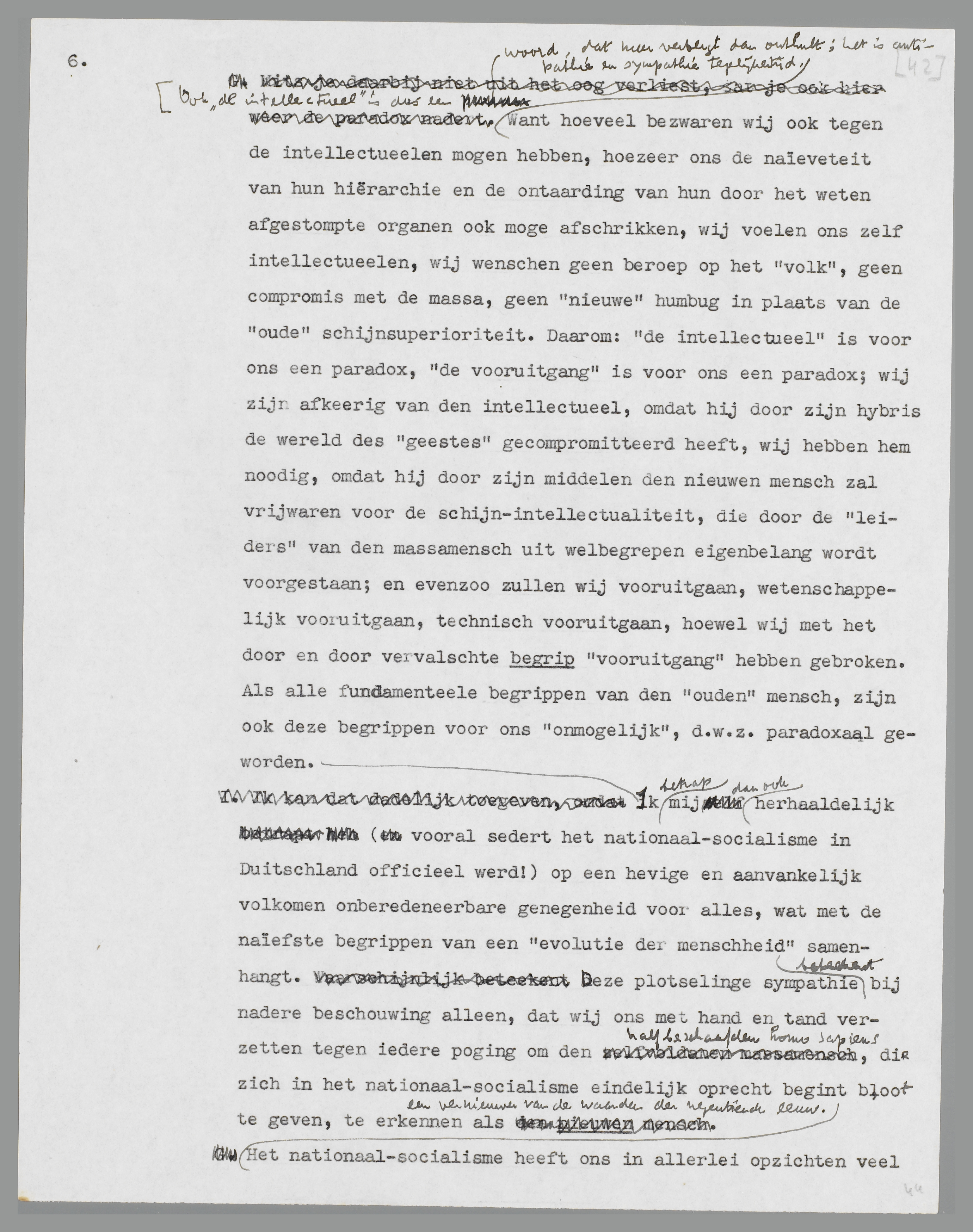 Ik betrap mij dan ook, vooral sedert het nationaal-socialisme een officieele factor werd, op een hevige en aanvankelijk volkomen onberedeneerbare genegenheid voor alles, wat met de naïefste begrippen van een ‘evolutie der menschheid’ samenhangt. Deze plotselinge sympathie beteekent dus geen terugkeer tot een negentiende-eeuwsch rationalisme, maar kondigt het verzet tegen een nieuwe begripsvervalsching aan: de begripsvervalsching van den halfbeschaafden homo sapiens, die zich in de theorie van het nationaal-socialisme eindelijk oprecht begint bloot te geven. Het nationaal-socialisme heeft de posities duidelijker gesteld; het laat ons partij kiezen tegen begripsromantiek, tegen de perfide leugens, waarmee de rancunemensch Goebbels de misschien ook perfide leugens van sommige ‘Fortschrittler’ meent te niet te kunnen doen. Voor het eerst hebben wij weer een helder beeld van het liegen voor ons; wij verachten de leugens der nationaal-socialisten niet, omdat zij een abstracte waarheid tekort doen, maar