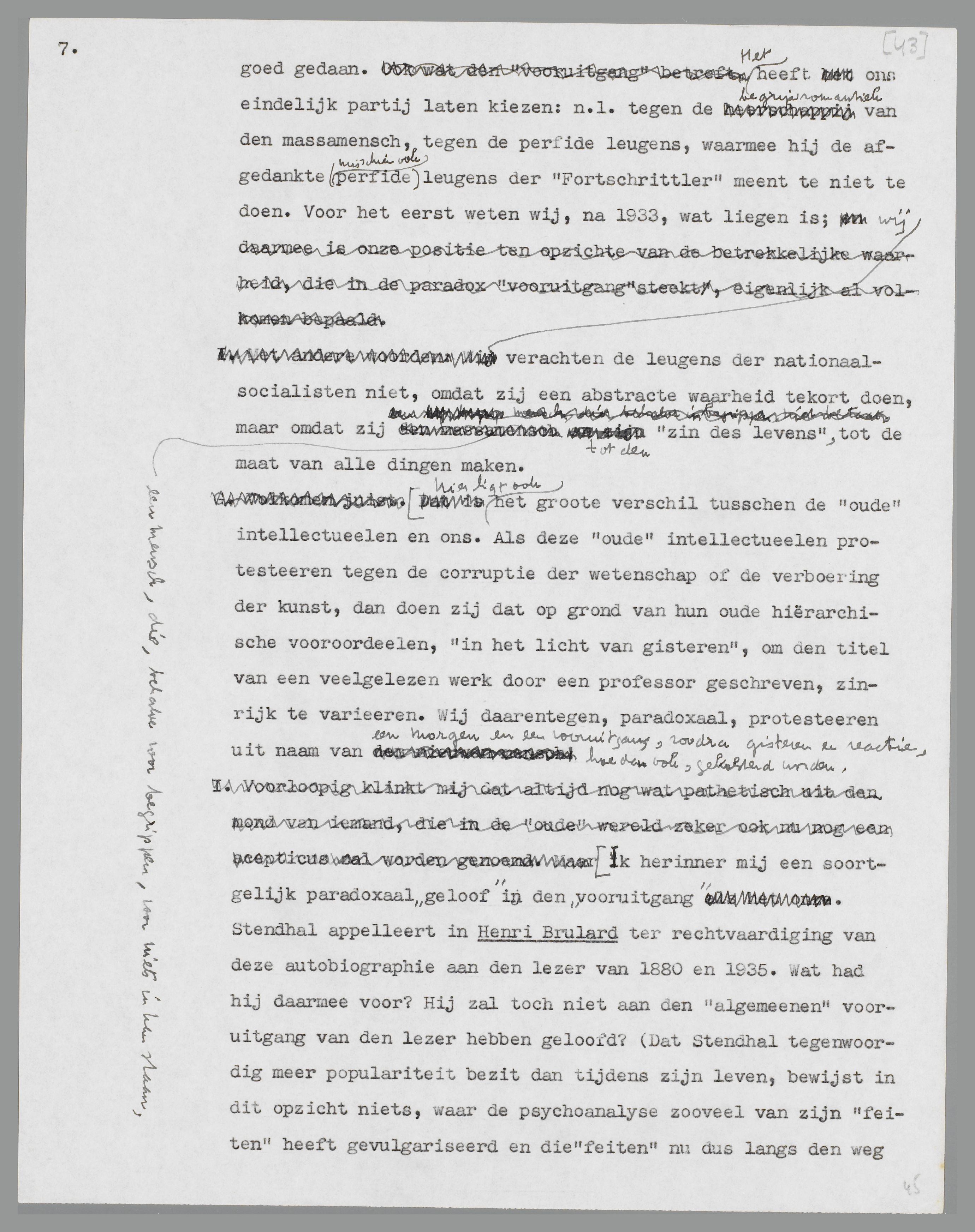 Dit paradoxale ‘geloof’ in den ‘vooruitgang’ is ongetwijfeld een herinnering aan den hemel der Christenen, die achter dit leven ligt en toch reeds dit leven ‘onmogelijk’ maakt, al zijn bestaande, in schijn vastgelegde waarden relativeert onder den gezichtshoek van eens pelgrims reize naar de eeuwigheid; wij zijn echter niet de eersten, die het met deze herinnering moeten stellen, zonder ons op het ‘hoogere’ te durven beroepen. Stendhal appelleert in zijn Henri Brulard ter rechtvaardiging van deze autobiographie aan den lezer van 1880 en 1935. Wat had hij daarmee voor? Hij zal toch niet aan den algemeenen vooruitgang (de algemeene ontwikkeling) van ‘den’ lezer hebben geloofd? (Dat Stendhal tegenwoordig populairder is dan tijdens zijn leven, bewijst in deze niets, aangezien de psycho-analyse veel van zijn ‘feiten’ heeft gevulgariseerd en die ‘feiten’ nu langs den weg van