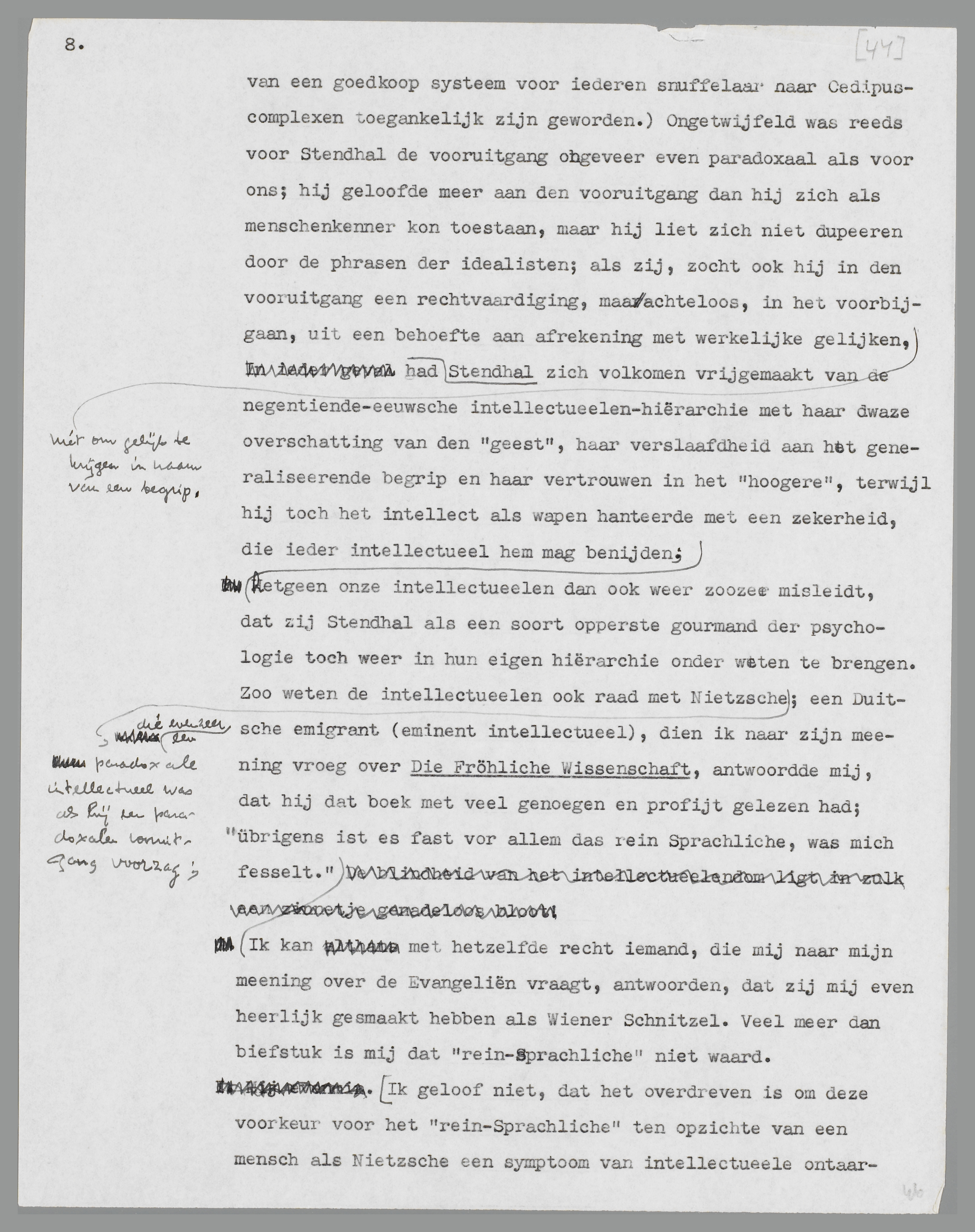 een goedkoop systeem voor iederen snuffelaar naar Oedipuscomplexen toegankelijk zijn geworden.) Ongetwijfeld was reeds voor Stendhal de vooruitgang (evolutie) even paradoxaal als voor ons; hij geloofde meer aan den vooruitgang dan hij zich als menschenkenner kon toestaan, maar hij liet zich niet dupeeren door de phrasen der idealisten; als zij zocht ook hij in den vooruitgang een rechtvaardiging, maar achteloos, in het voorbijgaan, uit een behoefte aan afrekening met werkelijke gelijken, niet om gelijk te krijgen in naam van een begrip. Stendhal kan gelden als het voorbeeld van een mensch, die zich volkomen heeft vrijgemaakt van een negentiende-eeuwsche intellectueelen-hiërarchie (met haar dwaze overschatting van den ‘geest’, haar verslaafdheid aan het generaliseerend begrip zoowel als aan de interessante bijzonderheid, en met haar vertrouwen op het ‘hoogere’), terwijl hij toch het intellect hanteerde met een zekerheid, die de vak-litteratoren met hun cultus van het geciseleerde jaloersch maakt; zij weten dan ook dezen Stendhal toch weer onder te brengen in hun hiërarchie door hem voor te stellen als een soort oppersten gourmand der psychologie.... hetgeen hij zeker óók was, maar onder anderen. Stendhal was een even paradoxale intellectueel als Nietzsche wiens ‘geloof’ in een ‘vooruitgang’ zich trouwens ook niet in de taalconventies der ‘oude’ intellectueelen laat opsluiten. Een duitsche emigrant (eminent intellectueel, maar gedrenkt in het ‘oude’), dien ik naar zijn meening vroeg over Die Fröhliche Wissenschaft, ant-