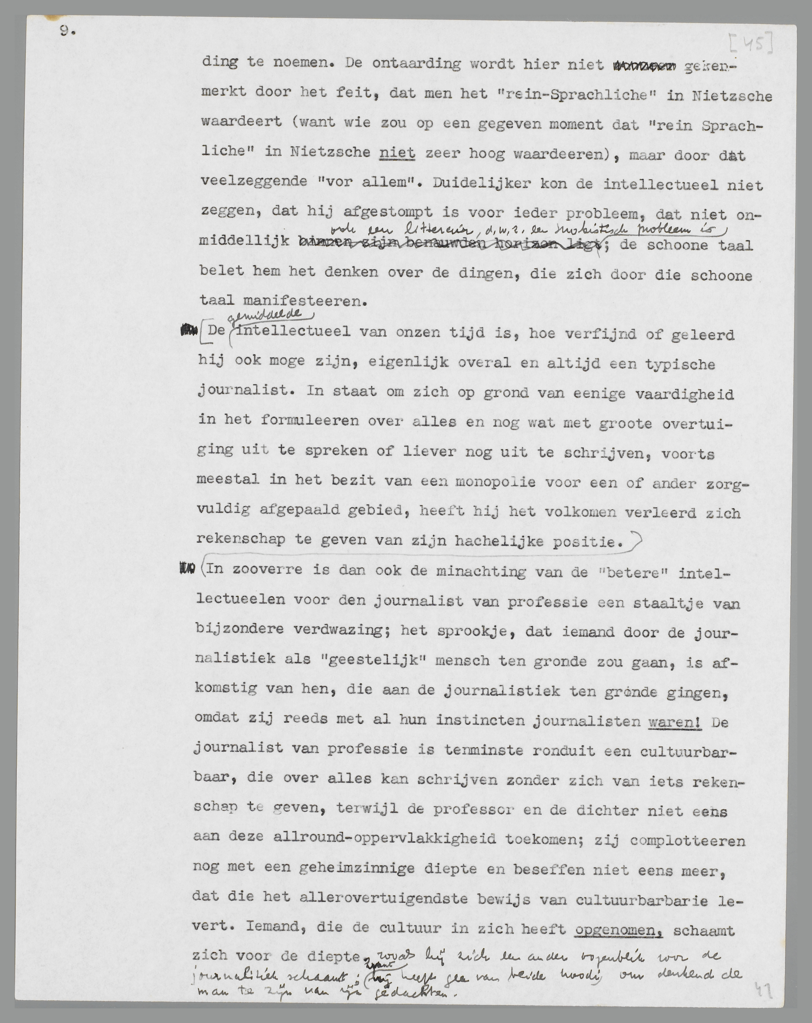 De gemiddelde intellectueel van dezen tijd is, hoe verfijnd of geleerd hij ook moge zijn, eigenlijk doorgaans een typische journalist. In staat om zich op grond van eenige vaardigheid in het formuleeren over alles en nog wat met groote overtuigingskracht uit te spreken of uit te schrijven, voorts meestal in het bezit van een monopolie voor een of ander zorgvuldig afgepaald gebied, heeft hij het volkomen ver-