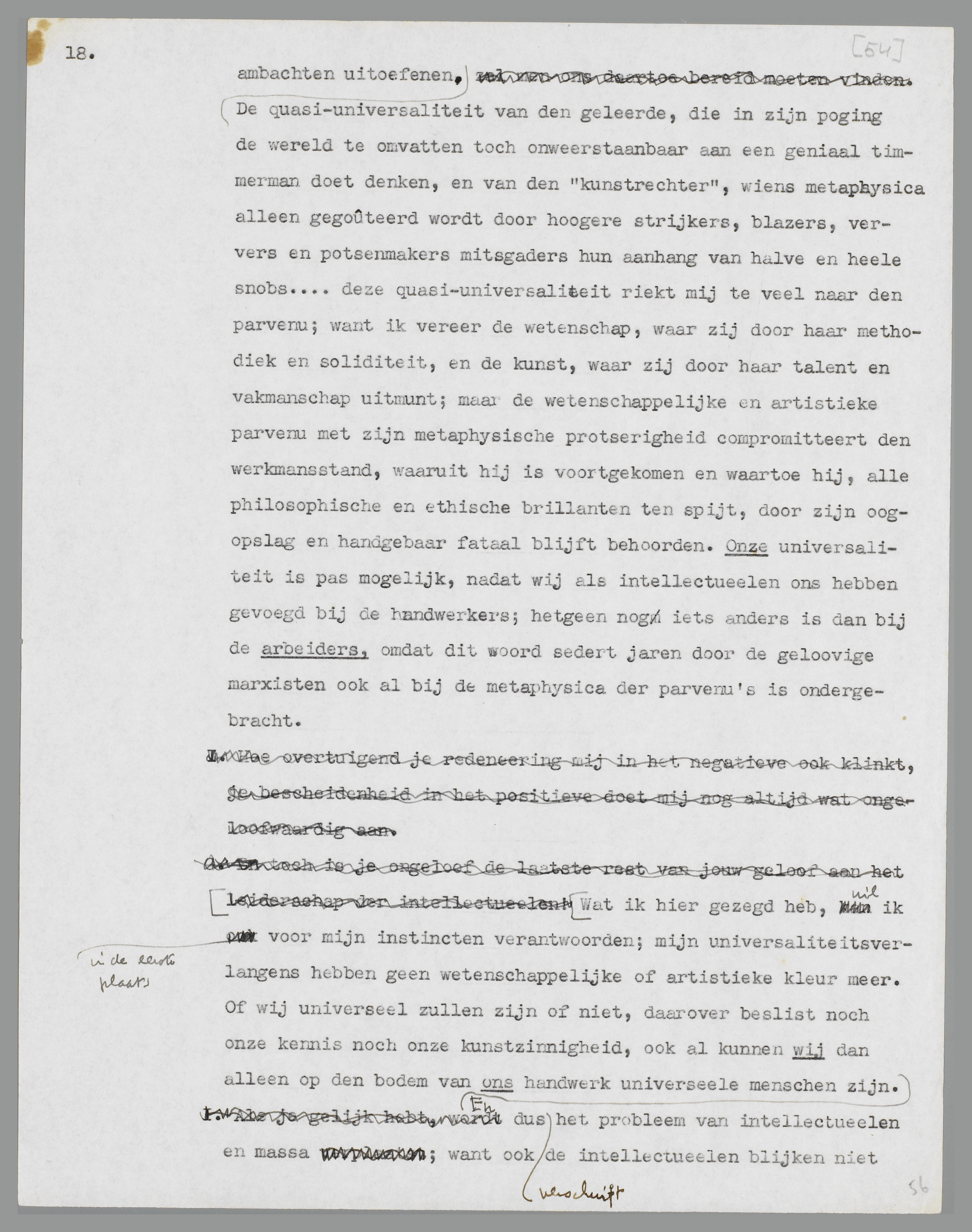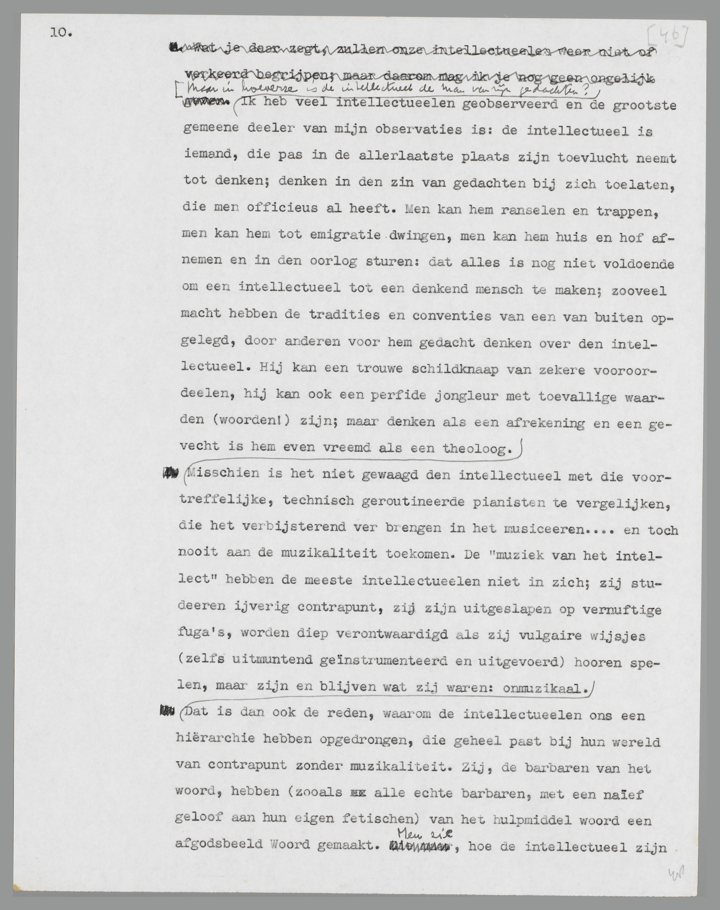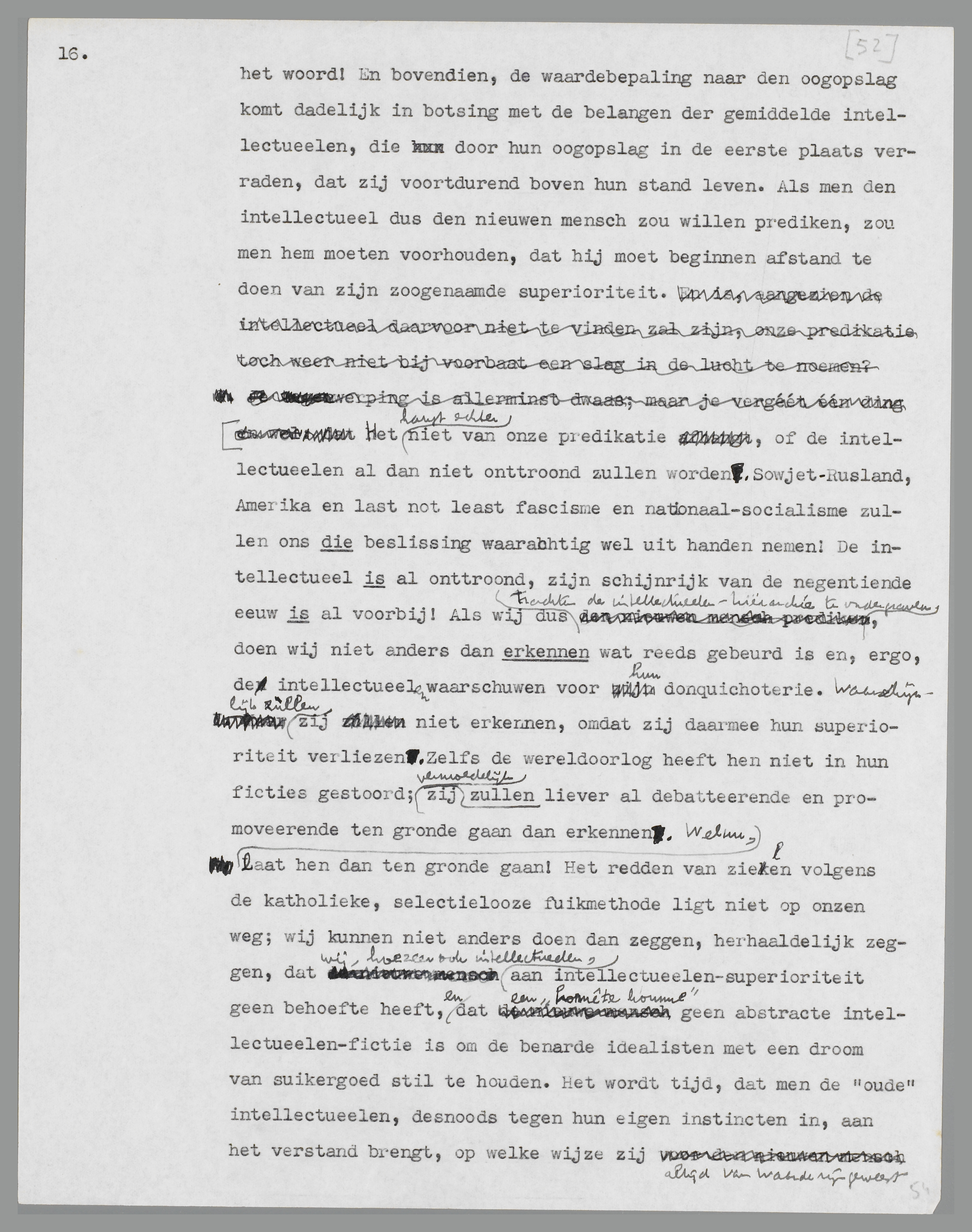 ‘Intellectueel’ is, als zooveel andere woorden, een term geworden, die meer verbergt dan onthult; hij vertolkt antipathie en sympathie tegelijk. Juist wij, die door de naïveteit der intellectueelen-hiërarchie en de ontaarding van in vakkundigheid afgestompte organen het meest worden gehinderd, noemen ons bij voorkeur zelf intellectueel, wanneer men ons vraagt, in welke atmosfeer wij thuis hooren: want wij wenschen geen beroep op een mystiek te voorschijn gegoocheld ‘volk’, wij wenschen geen nieuwe humbug in plaats van oude schijn-superioriteit. Daarom: de intellectueel is voor ons een paradox, zooals de vooruitgang voor ons een paradox is. Wij zijn afkeerig van den intellectueel, omdat hij door zijn hybris de wereld des geestes gecompromitteerd heeft, wij hebben hem