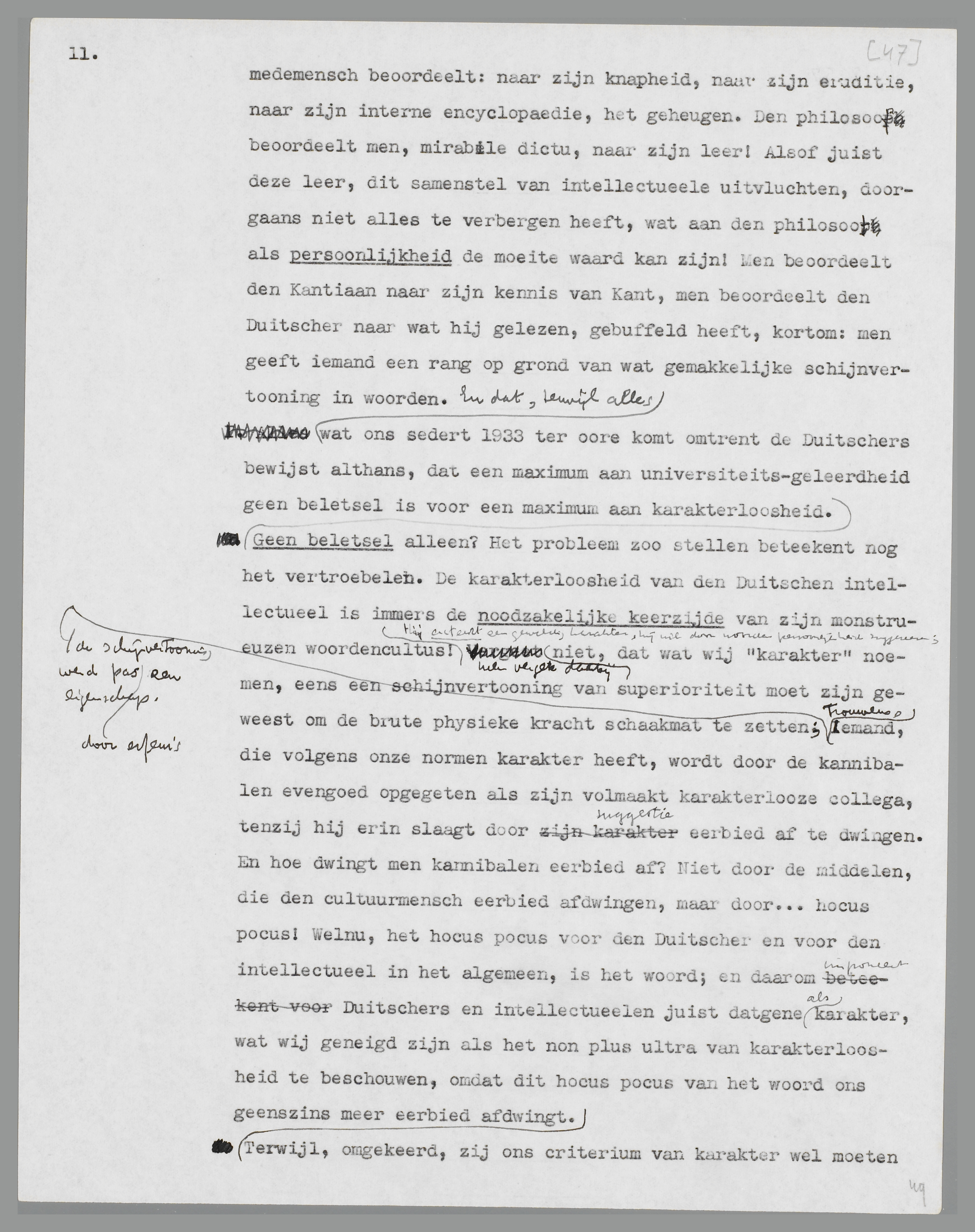 deelt men, mirabile dictu, naar zijn leer! Alsof juist deze leer, dit samenstel van intellectueele uitvluchten, doorgaans niet alles te verbergen heeft, wat aan den philosoof als persoonlijkheid de moeite waard kan zijn! Men beoordeelt den Kantiaan naar zijn kennis van Kant, den Spinozist naar zijn lidmaatschap van de Societas Spinozana, den Duitscher naar wat hij gelezen, gebuffeld heeft, kortom: men geeft iemand een rang op grond van wat gemakkelijke schijnvertooning in woorden. En dat ook nu nog, nu wij de tragedie van het duitsche intellect voor oogen hebben! Nu alles, wat ons sedert 1933 in Duitschland is gedemonstreerd, bewijst, dat een maximum aan universiteitsgeleerdheid geen beletsel is voor een maximum aan karakterloosheid. Geen beletsel alleen? Het probleem zoo stellen beteekent nog het vertroebelen. De karakterloosheid van den duitschen intellectueel is immers de noodzakelijke keerzijde van zijn monstrueuzen woordencultus! De Duitscher acteert een geweldig karakter, hij wil door woorden persoonlijkheid suggereeren, juist omdat hij niet weet wat karakter en persoonlijkheid is. Karakter kan ik niet anders definieeren dan als een eigenschap, die lang voorwendsel geweest is; karakter moet aanvankelijk een list van den geest, een schijnvertooning van superioriteit zijn geweest om de brute physieke kracht schaakmat te zetten; de schijnvertooning werd pas door erfenis van geslacht op geslacht eigenschap. In den man van karakter waardeert men de cultuur als een bezit zonder de arrogantie van het bezit.